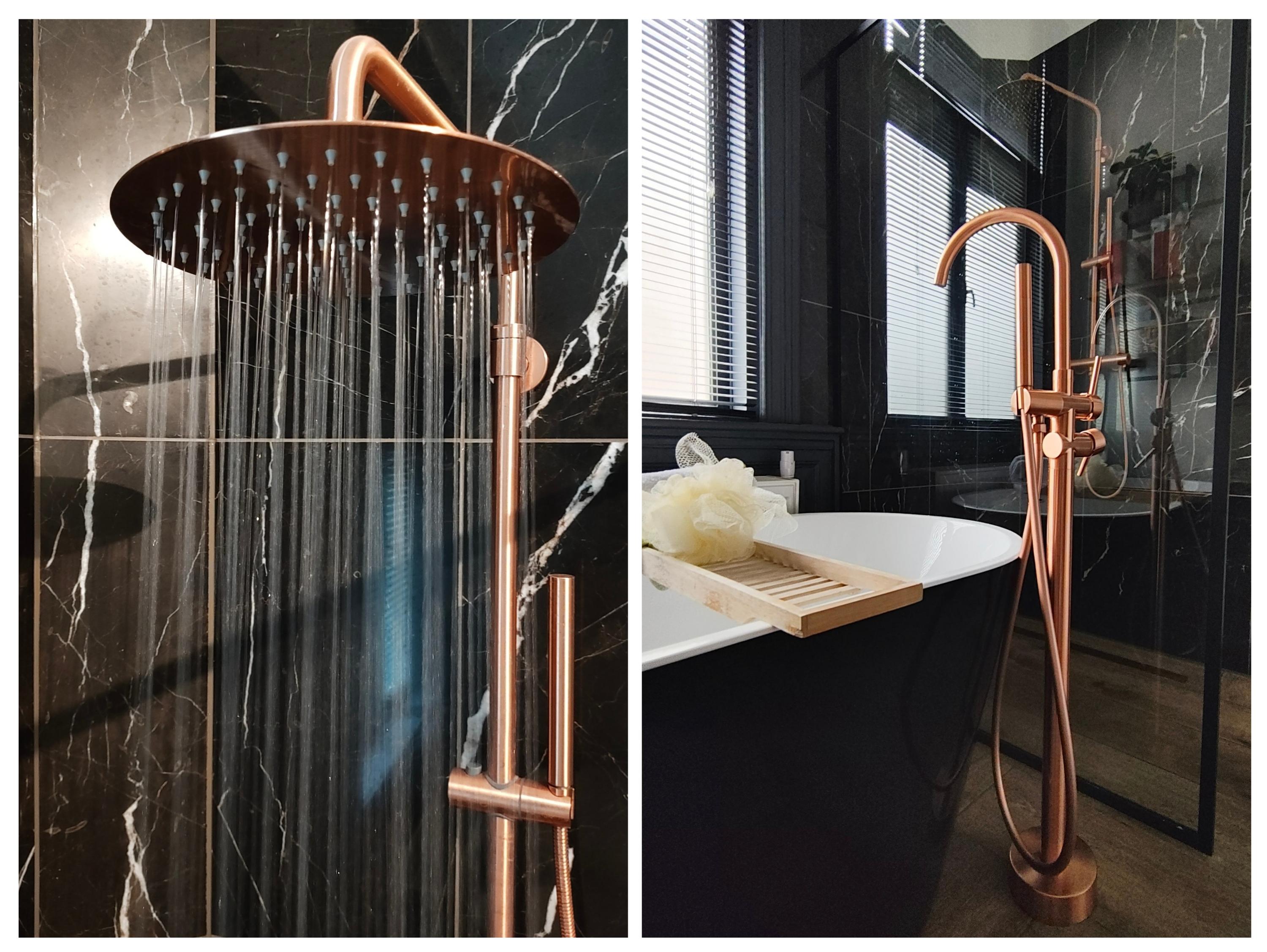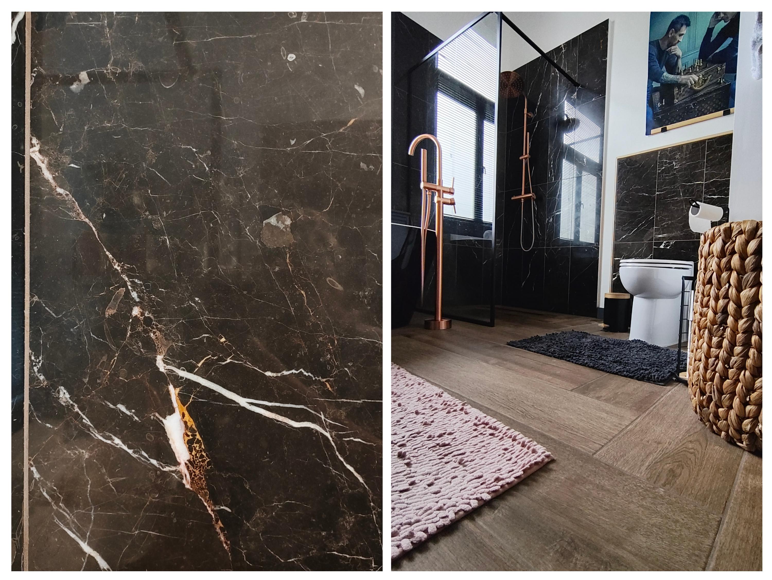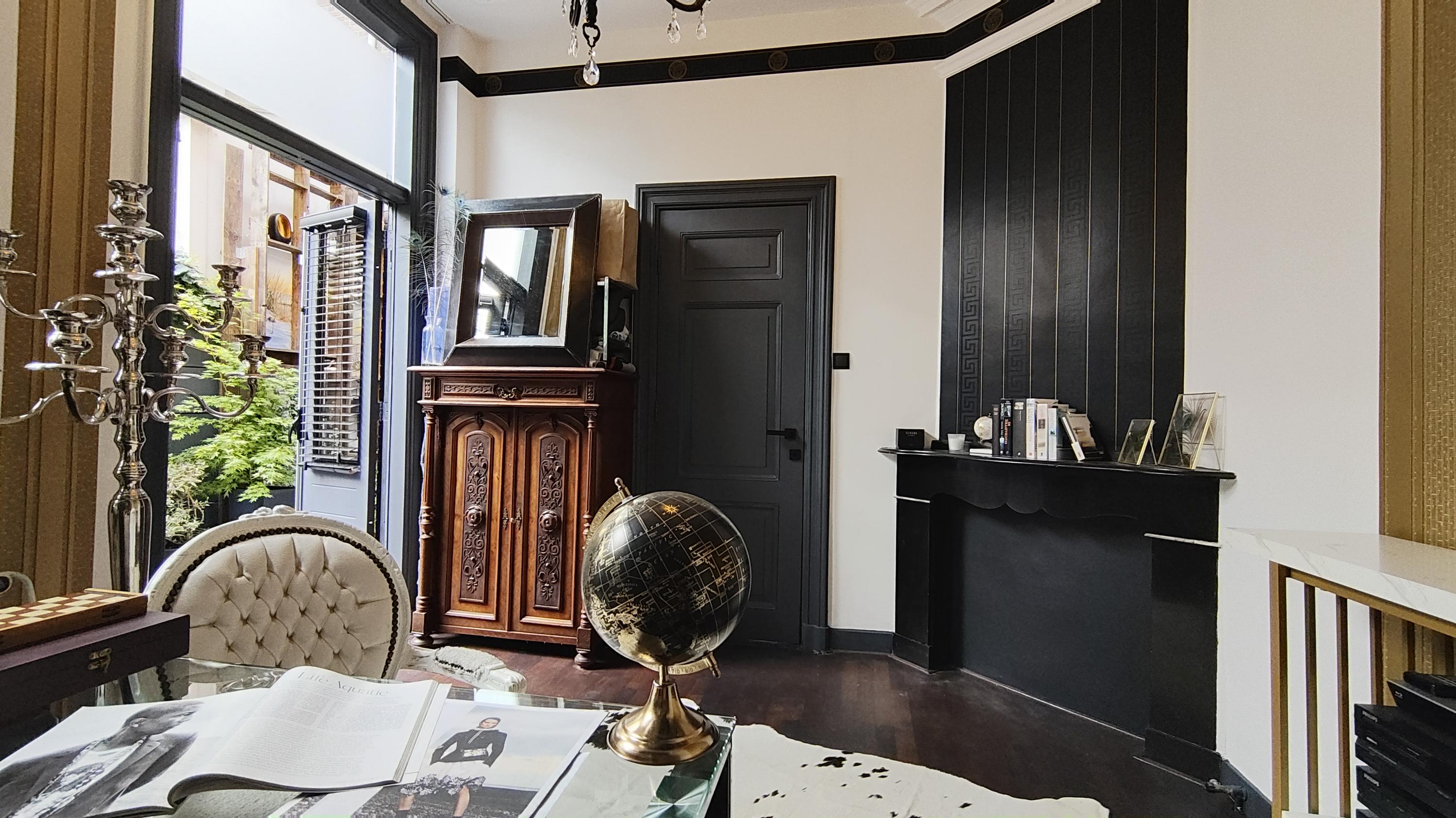 The master bedroom exudes grandeur, with mahogany parquet flooring, elegant period details, and direct access to the garden. A second room on this level – currently used as a study – also opens onto the garden through French doors. Both luxurious bathrooms are fitted with a freestanding bathtub, walk-in rain shower, and double sinks, finished with high-end materials and chic herringbone floor tiles.