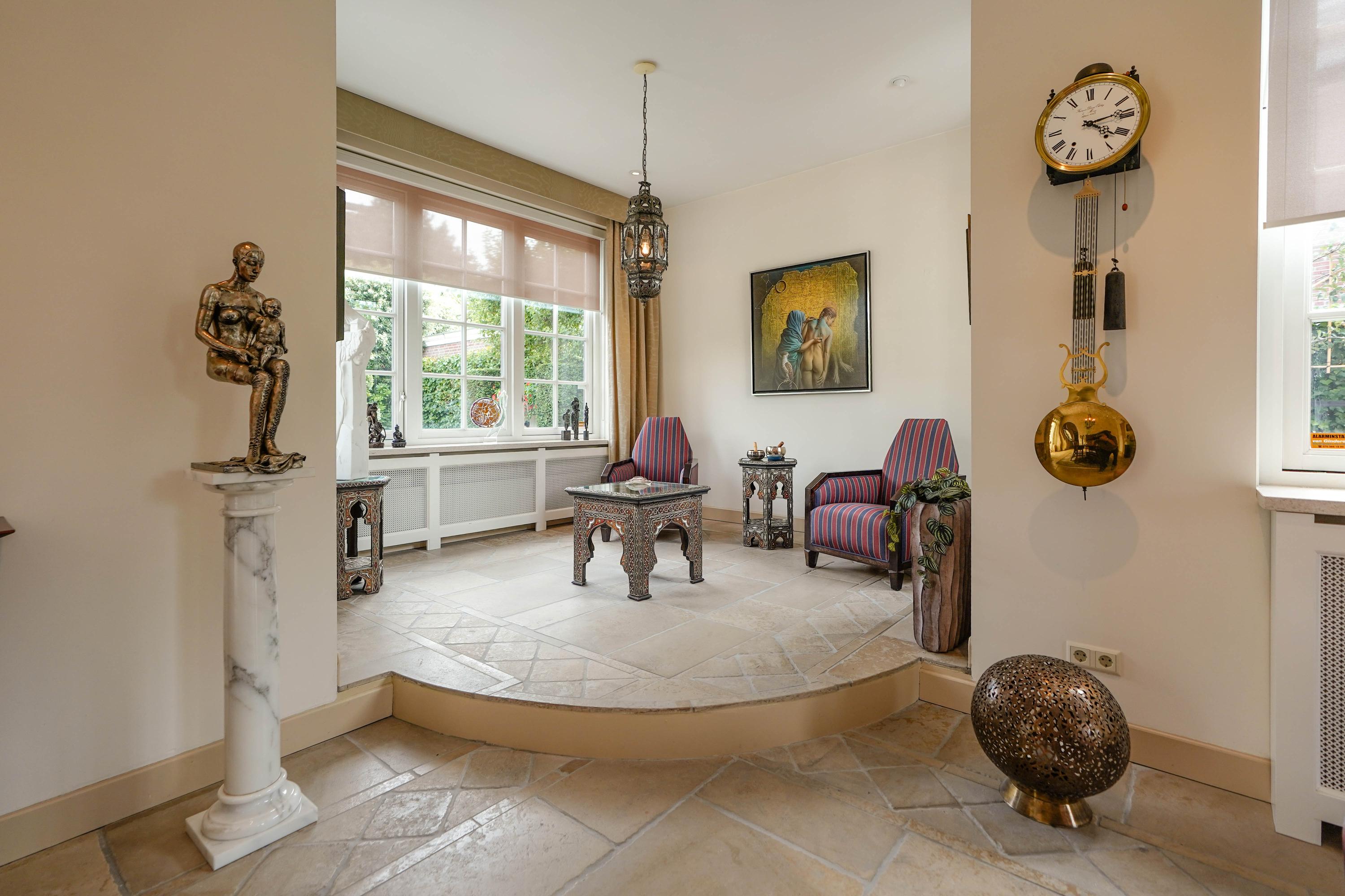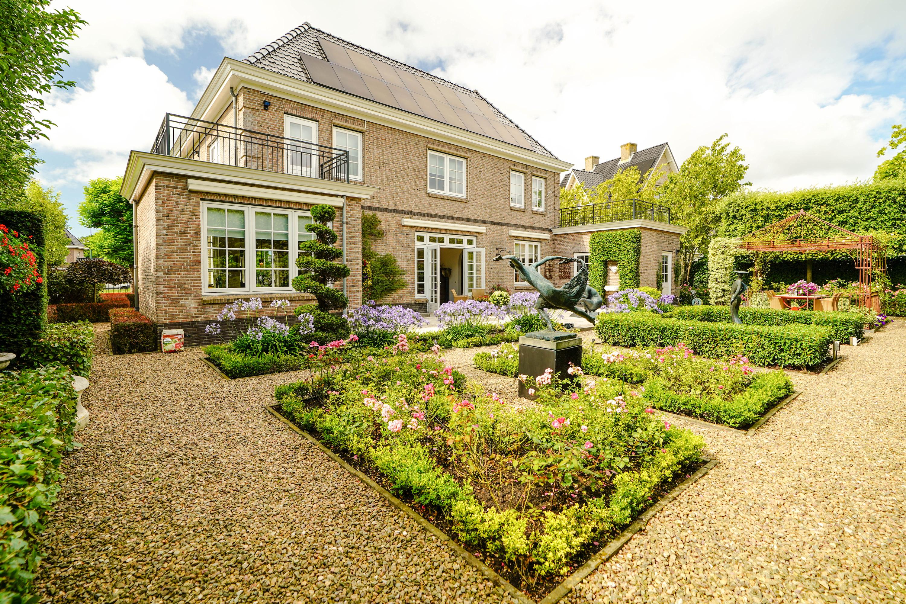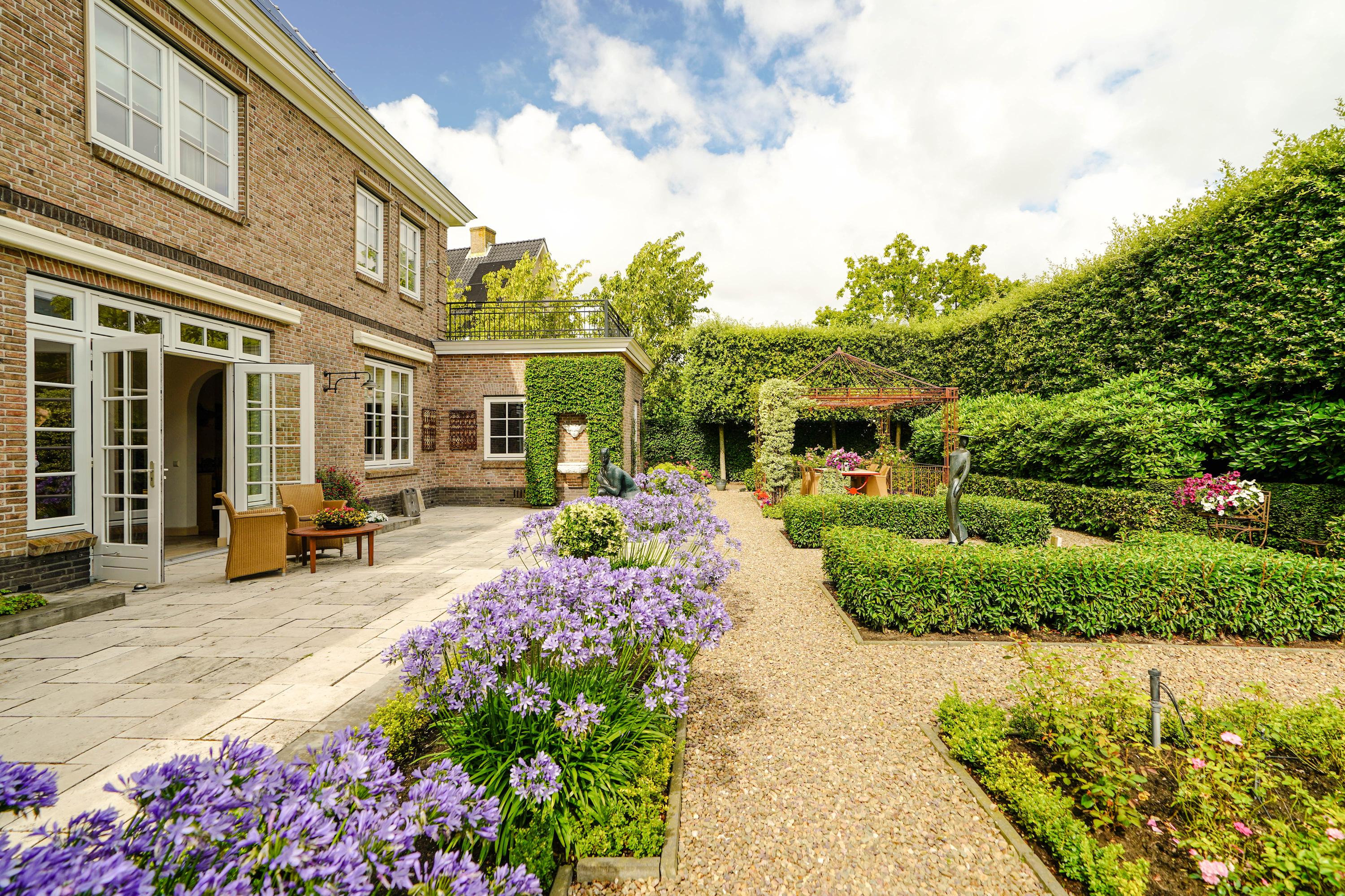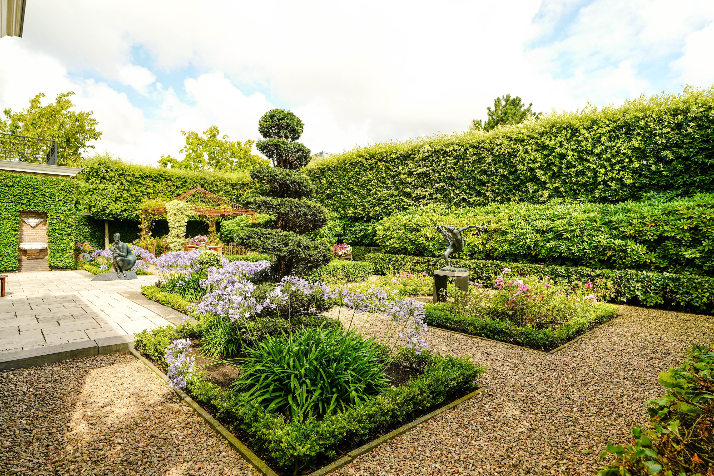 De zeer waardevolle siertuin voegt een bijzondere beleving toe aan het wonen in deze villa. De voortuin, geometrisch aangelegd in klassieke stijl, is een representatieve binnenkomer. De brede zijtuinen langs het huis zijn royaal beplant, met hagen, struiken en bomen. In de achtertuin zorgt een 3,5 meter hoge kraag van 24 wintergroene steeneiken langs de erfafscheiding het hele jaar door voor maximale privacy. Op het terras van 46 m2 is het heerlijk zonnen én feesten. Als het ijzeren prieel 's zomers versierd is met bloemborders, klimrozen en hanging baskets, is het er aangenaam toeven aan de buitentafel. De Franse fontein aan de rechterzijde en het Italiaanse fonteintje aan het terras zijn verfrissende elementen in de zomerse tuin. De bronzen sculpturen zijn apart te koop.