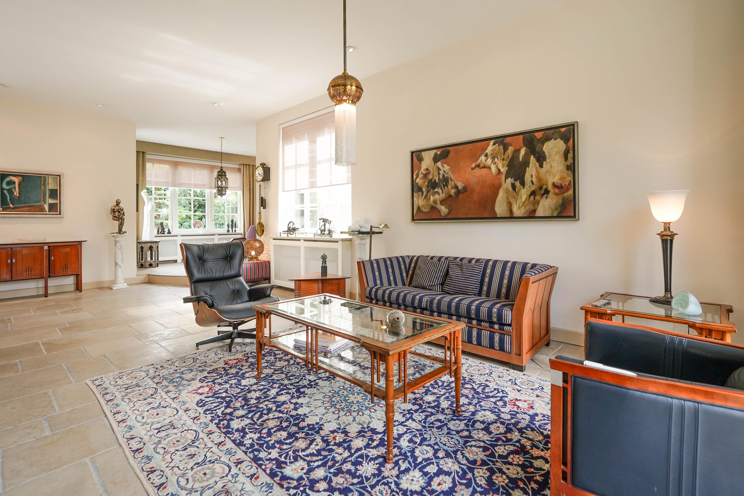 De L-vormige living heeft een plafondhoogte van 3,10 meter. De serre met verhoogd podium voegt een sfeervolle, extra dimensie toe. Een dubbele pui geeft toegang tot de tuin. De ramen op de zuid- en westkant zijn voorzien van zonwerende rolgordijnen. In het plafond zijn 15 inbouwspots aangebracht. De monumentale, Franse open haard werkt op gas.