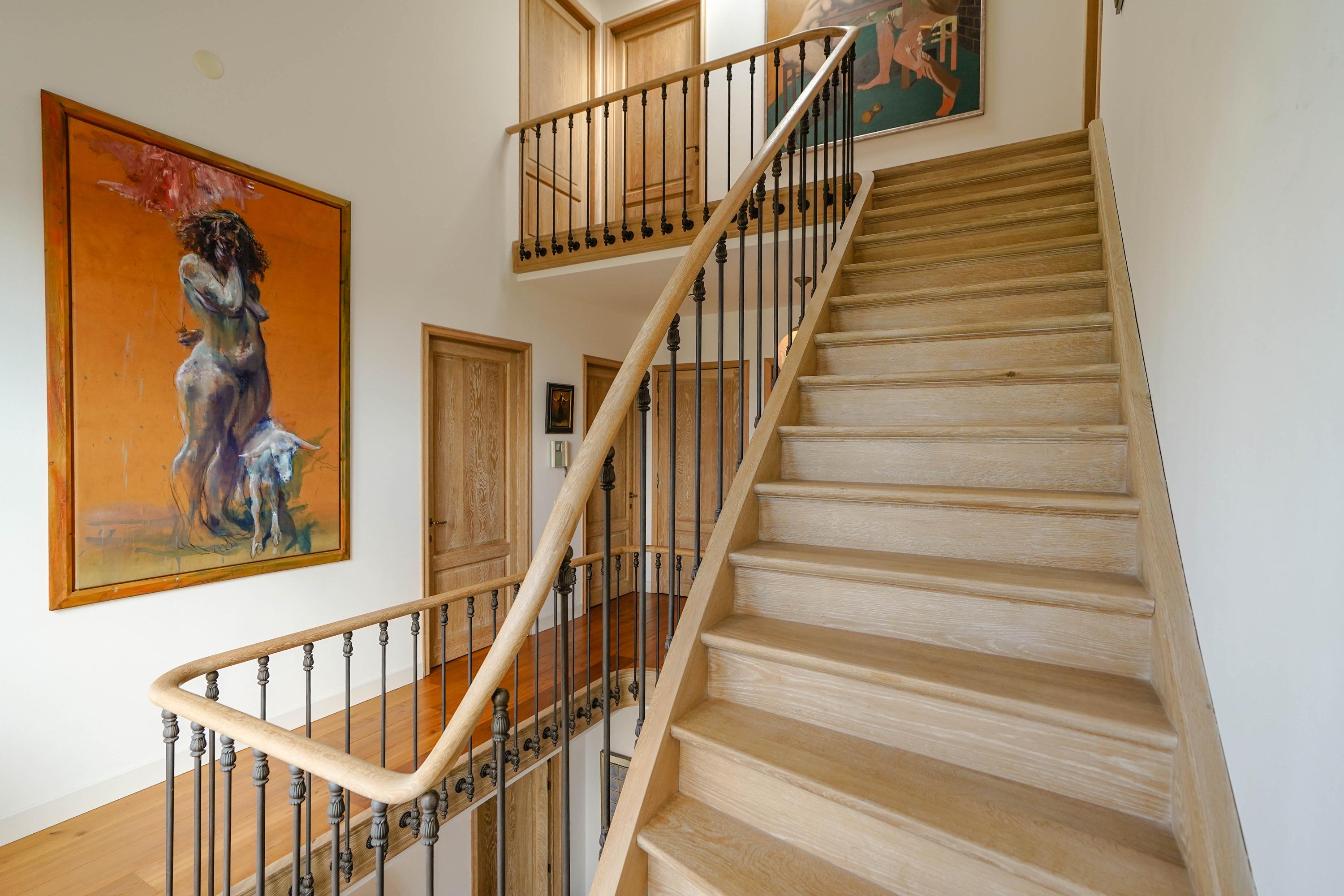 De entreehal maakt direct indruk met een fraai gesculptureerde, eiken trappartij. Vanaf de begane grond loopt een massief eiken leuning in één ononderbroken stuk door tot en met de bovenste etage, gedragen door 87 gepatineerde, gietijzeren zijbalusters. Een meesterwerk van de befaamde Belgische trappenmaker Luc Steels. Hij vervaardigde ook de eiken paneeldeuren en sponningen in het hele huis. In de hal bevinden zich het toilet en de meterkast. Het lichtvenster in het dak boven in de vide zorgt samen met de grote glaspui voor optimaal daglicht op alle etages.