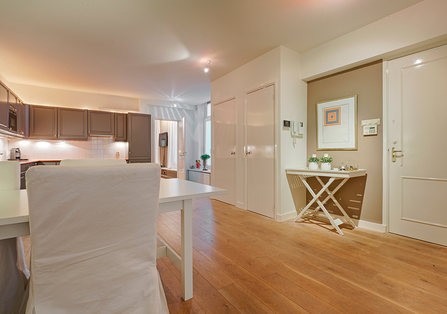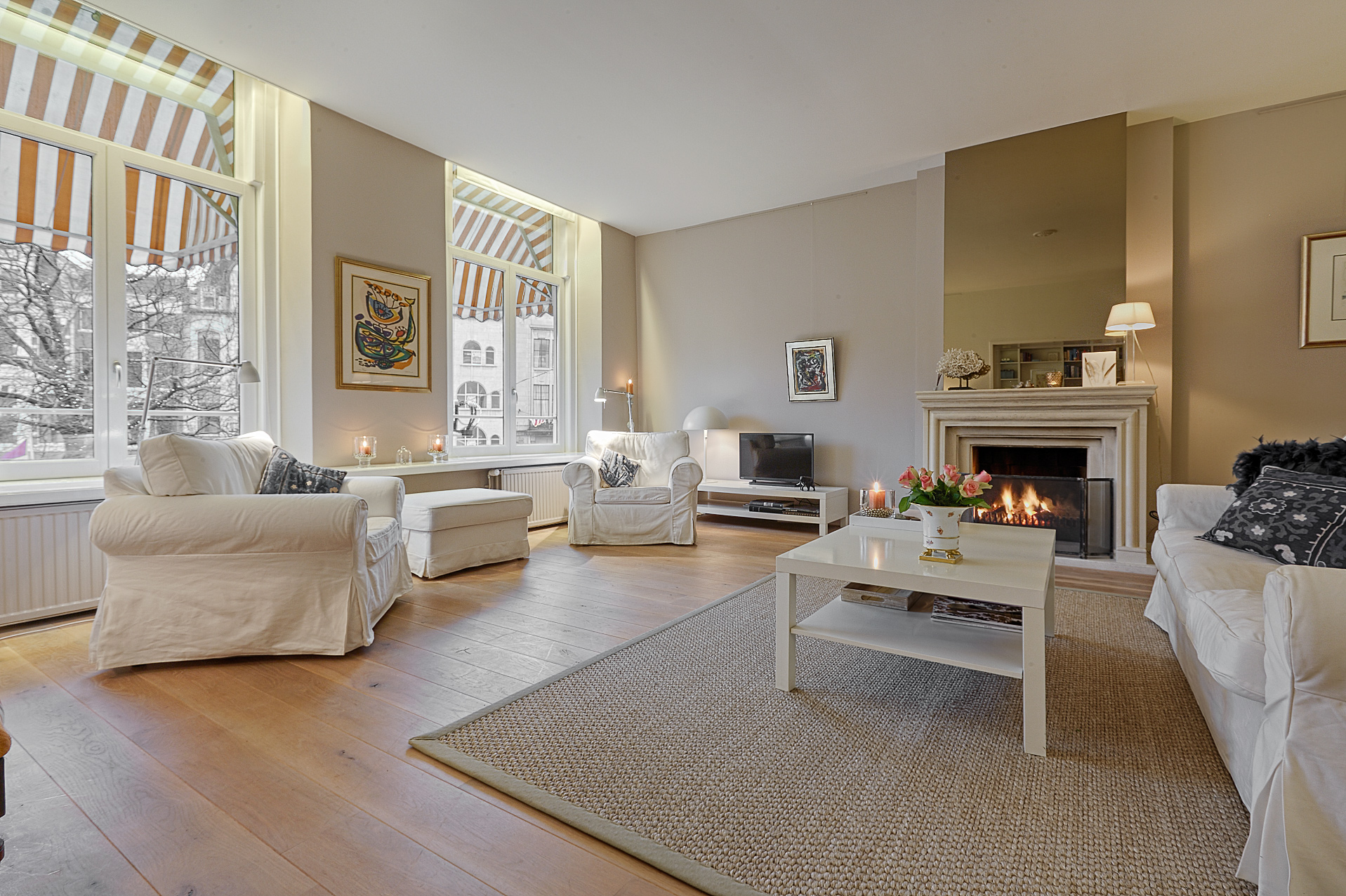 At the front of the building is the imposing living room, high ceilings, a stylish fireplace, and a phenomenal view of the Hofvijver. From the living room, there is an elegant passageway to a spacious library or bedroom, complete with open bookcases. Adjacent is a hallway with ample closet space and a finished marble bathroom with a vanity, shower, and toilet. The kitchen is equipped with built-in appliances and ample closet space. At the rear of the apartment is the very spacious master bedroom, offering peace and privacy. This room opens onto a hallway with a walk-in closet and space for the gas central heating boiler. There is also a separate laundry room with connections for a washer and dryer and additional storage space. The second, luxurious marble bathroom features a bathtub, a spacious walk-in shower, a stylish vanity with a built-in vanity, and a toilet.