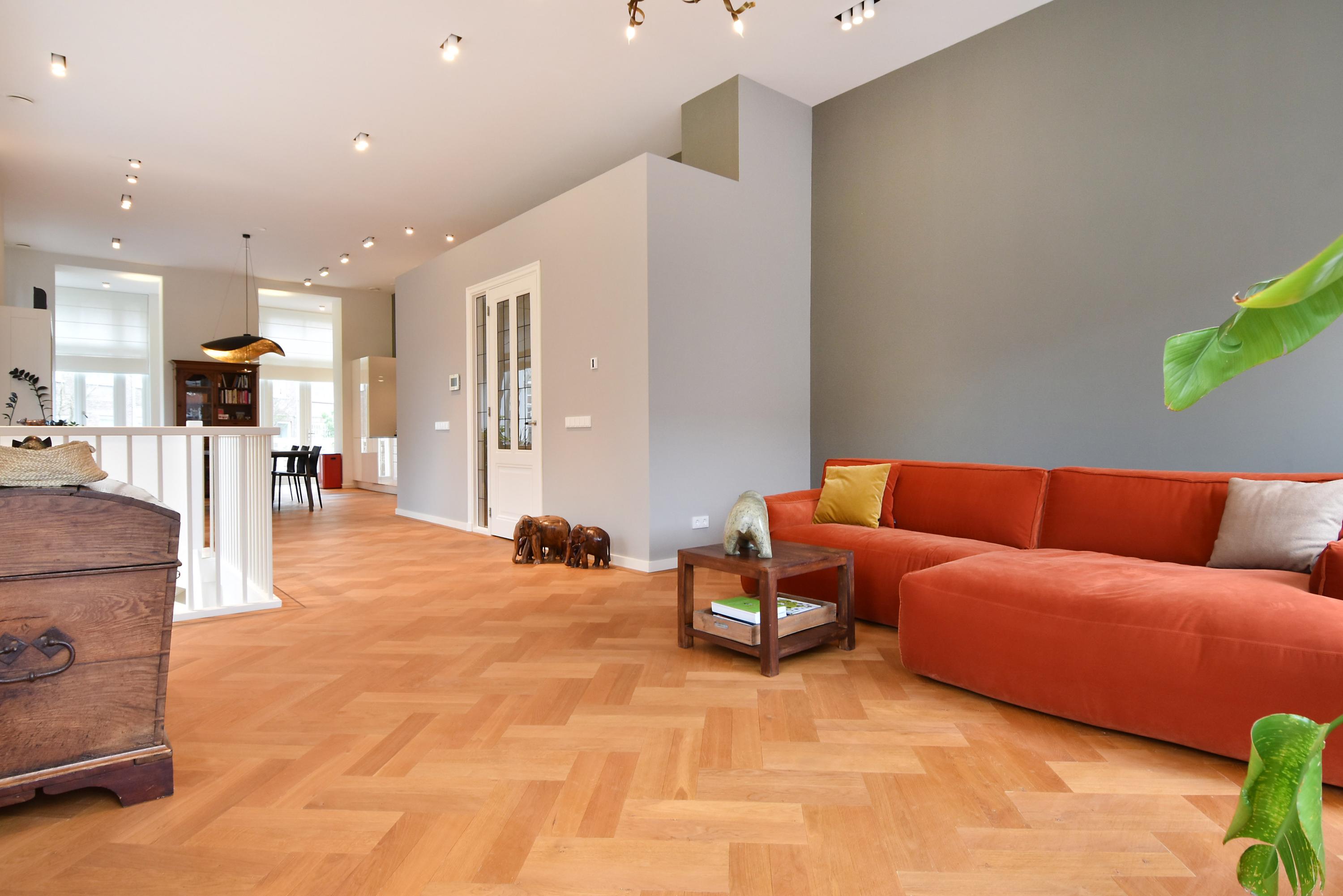 The elevated ground floor hosts the inviting living and dining space, marked by an oak herringbone parquet with underfloor heating and ceilings close to four metres. An open-plan kitchen is equipped with integrated appliances, including an induction cooktop, Quooker, and design lighting. The flow leads out to a balcony and sunlit south-facing garden with storeroom and private exterior entrance.