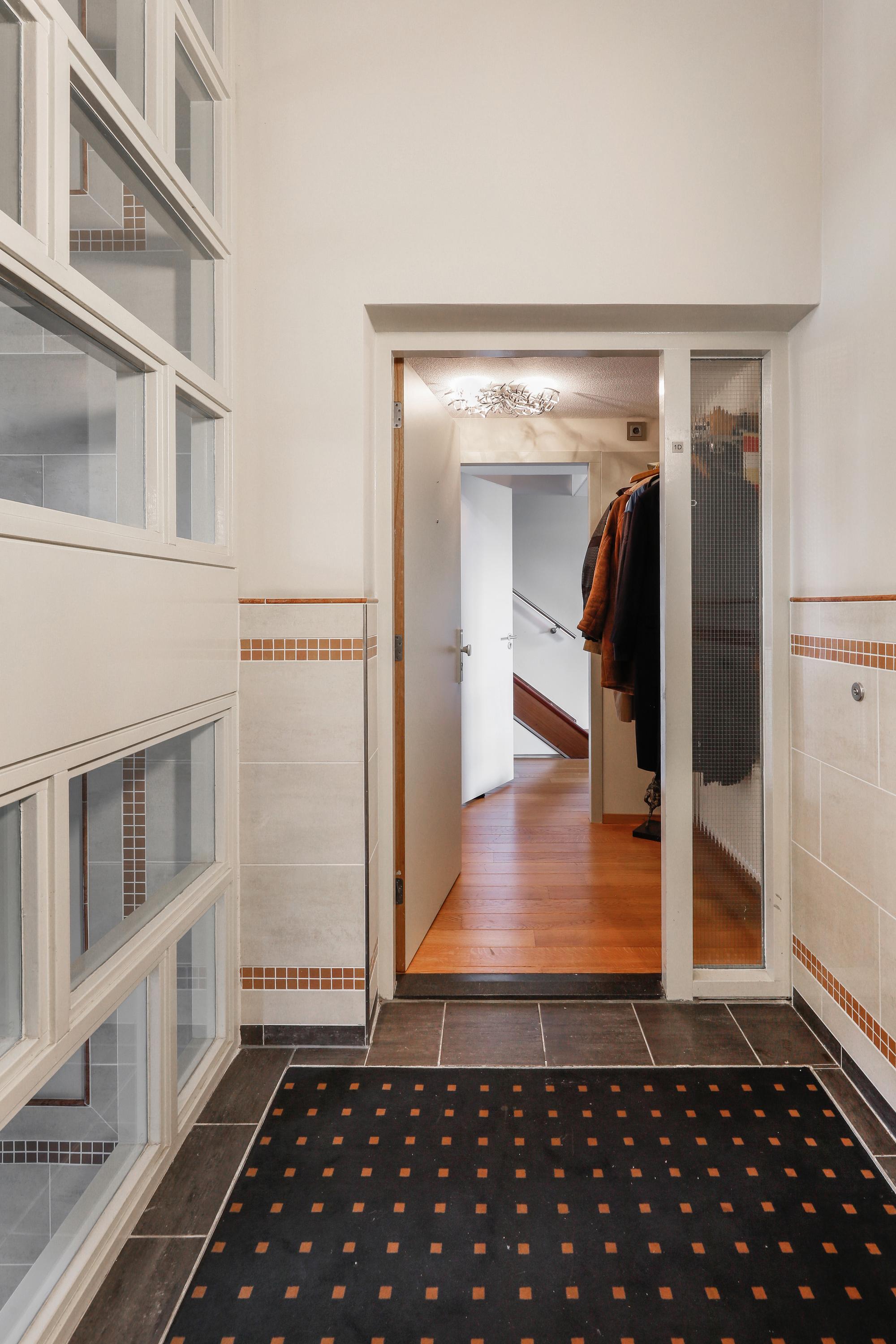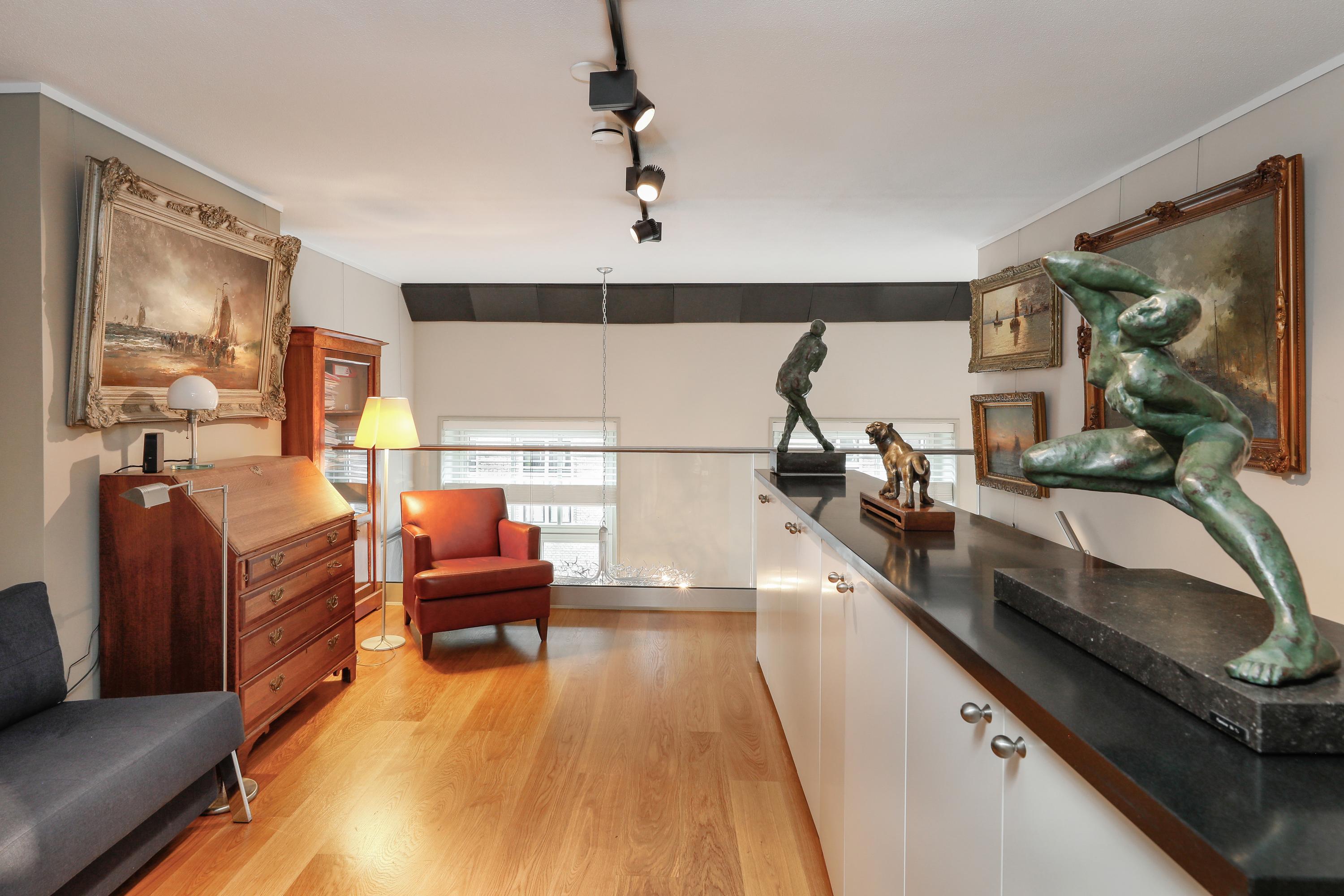 It's quite special to find this modern home behind the historic facade. During the renovation/reconstruction, only the front facade remained. With the tall windows, that history still permeates your luxury apartment. And thankfully so. The ceiling height on the facade is still approximately 580 cm. Beautiful, and it allows light to penetrate deeply into your home. Where a loggia was planned in 2001, there's now a space that can be used year-round. So even on a summer day, it can be used as a loggia by opening the large, tall windows. A cozy seating area and the kitchen are located downstairs.