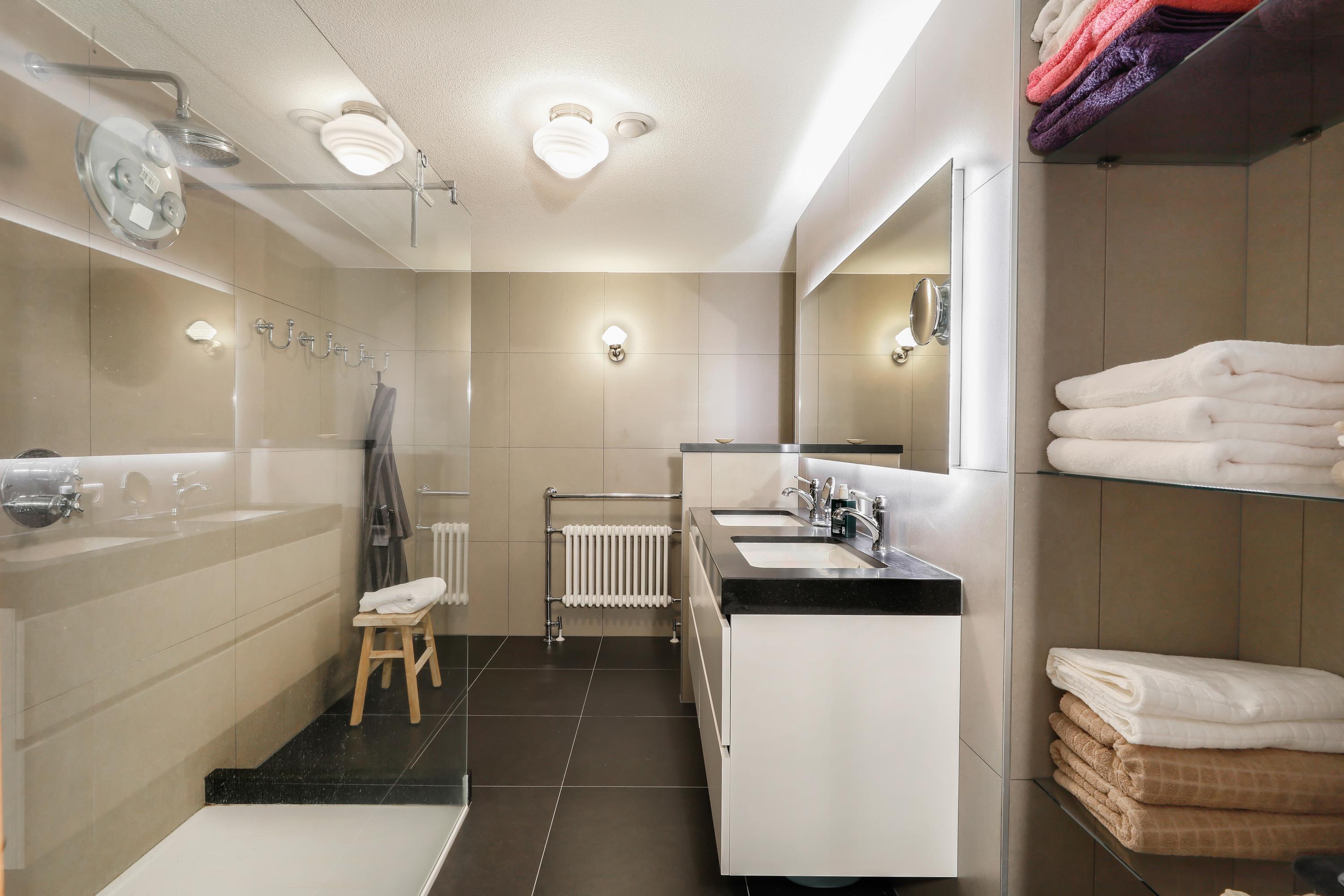 With soft tones, large tiles, and a well-designed layout, a double walk-in shower was installed in 2018, which you'll thoroughly enjoy. The floor is tiled with non-slip underfloor heating. The Geberit Mera AquaClean toilet is placed behind a low wall for privacy. There's a double shower and a slightly raised vanity with two sinks and a heated mirror. Towels and other bathroom utensils can be conveniently stored in cupboards and on open glass shelves.
