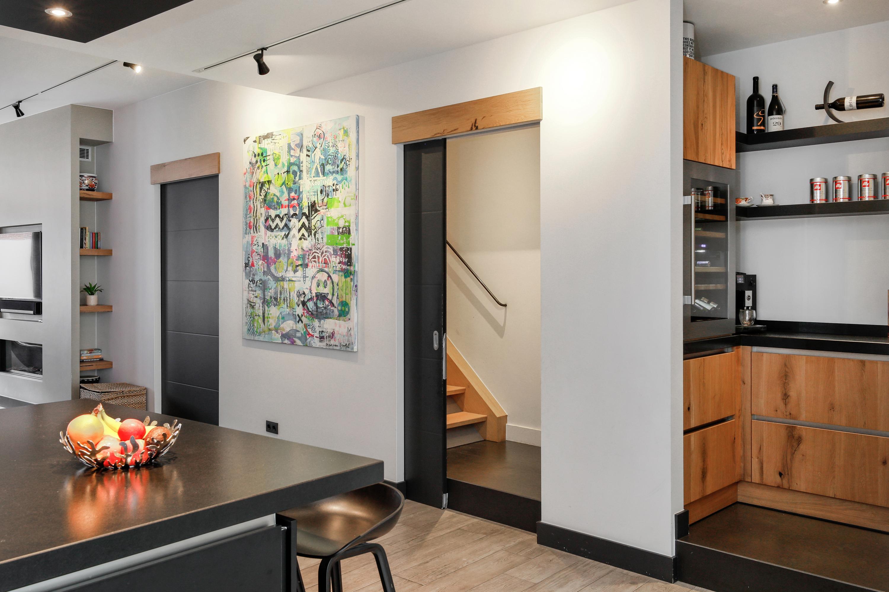 This was once an upstairs and downstairs apartment. By combining the two, a staircase could be removed. The current staircase is beautifully concealed behind a sliding door. We recognize this architect by the banister, but also by the interplay of lines on this staircase and the light line between the wall and the sloping surface. Laundry appliances are concealed in a cupboard on the spacious landing.