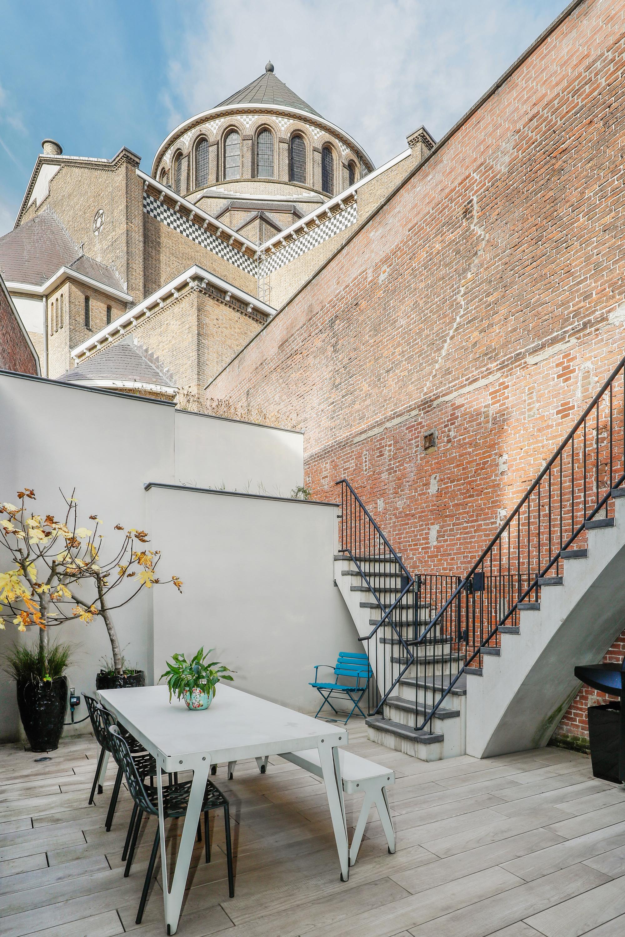 Of course, everyone is familiar with the front of St. Jacob's Church. But your visitors will still be surprised by the view from this side. The architect's approach to this project was a surprising one. By installing a huge transparent wall, the inside becomes the outside, and vice versa. The wall can be slid open in two directions from the corner. During the day, it's a wonderfully bright spot for a cozy dining table, and in the evening, you can dine with this remarkable view. The long wall of cabinets makes your home both practical and tasteful. This home also offers more outdoor space than is typical in the city center. In addition to a large courtyard garden, there are two roof terraces. So, you can choose your own spot for sun, shade, reading a book, enjoying a glass of wine together, or enjoying a delicious dinner al fresco.