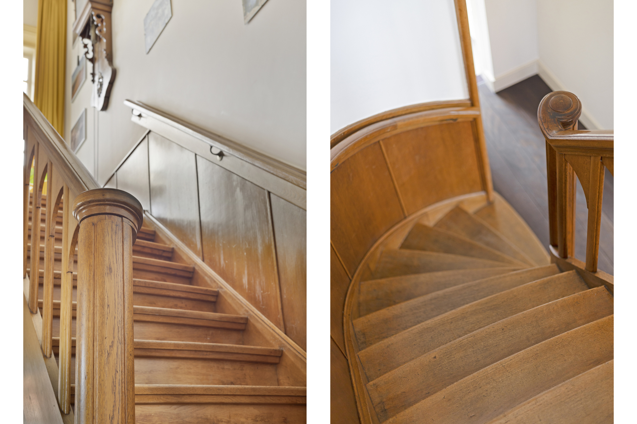 A staircase with the original balustrade leads to the entrance. You enter into the vestibule, where the original wall paneling immediately sets the historic tone of the home. The hallway provides access to a well-maintained guest toilet with washbasin and the main living areas. The living room is exceptionally spacious and features a beautiful Purpleheart wood floor, smooth plastered walls, and recessed ceiling lights. The characteristic bay window, open fireplace, high ceilings, and impressive stained glass windows add charm and grandeur to the space.