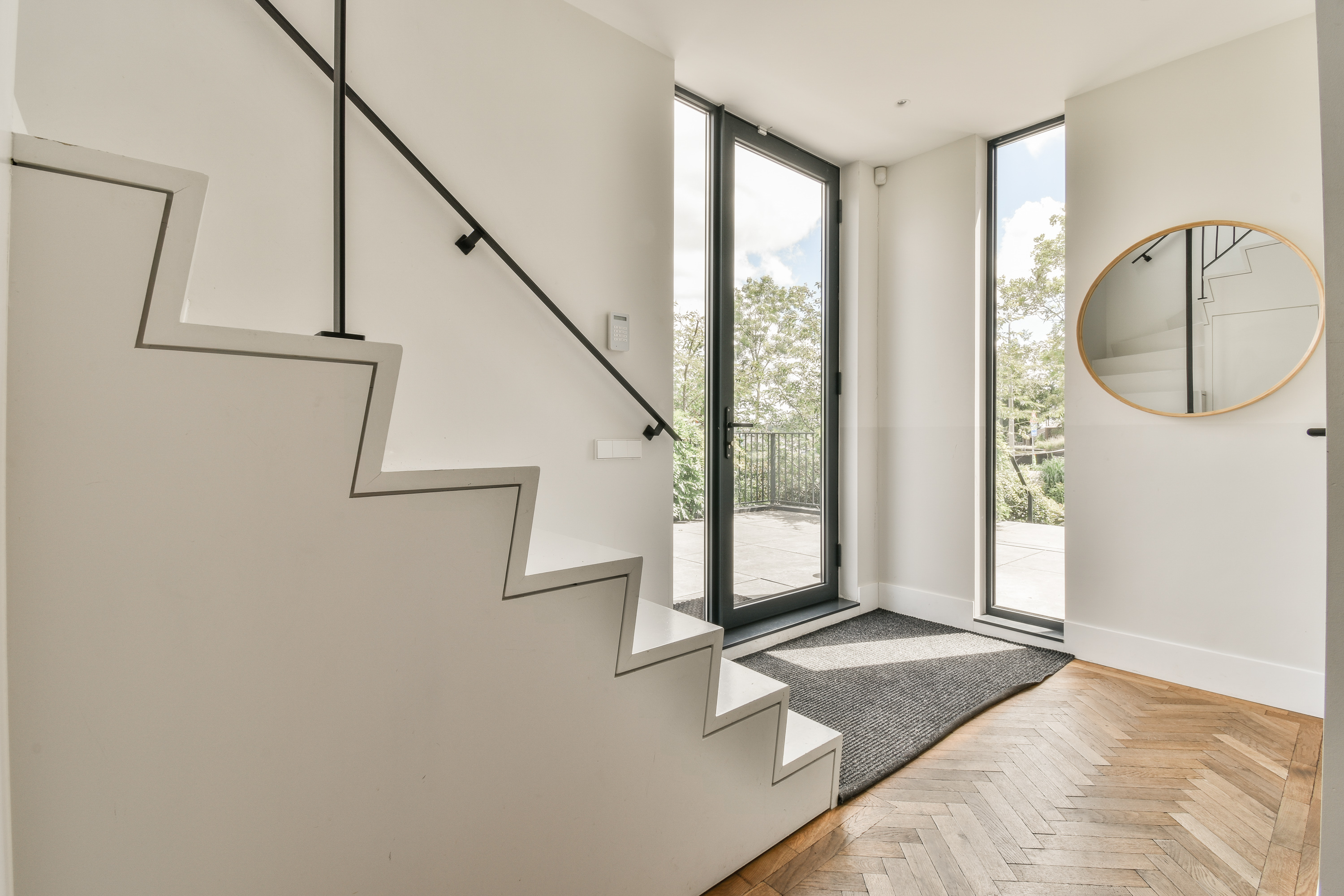The elevated ground floor can be accessed via the entrance at the front of the house. Upon entering, you will find a guest toilet and the central hallway leading to the attractive living room. At the rear is the spacious kitchen and dining area, fully equipped with high-end built-in appliances. Thanks to large windows and multiple entrances to the outdoor area, you experience a lot of light and openness here. Surrounding this floor is a spacious terrace: to the side and to the front - perfect for outdoor dining or relaxing in the sun.