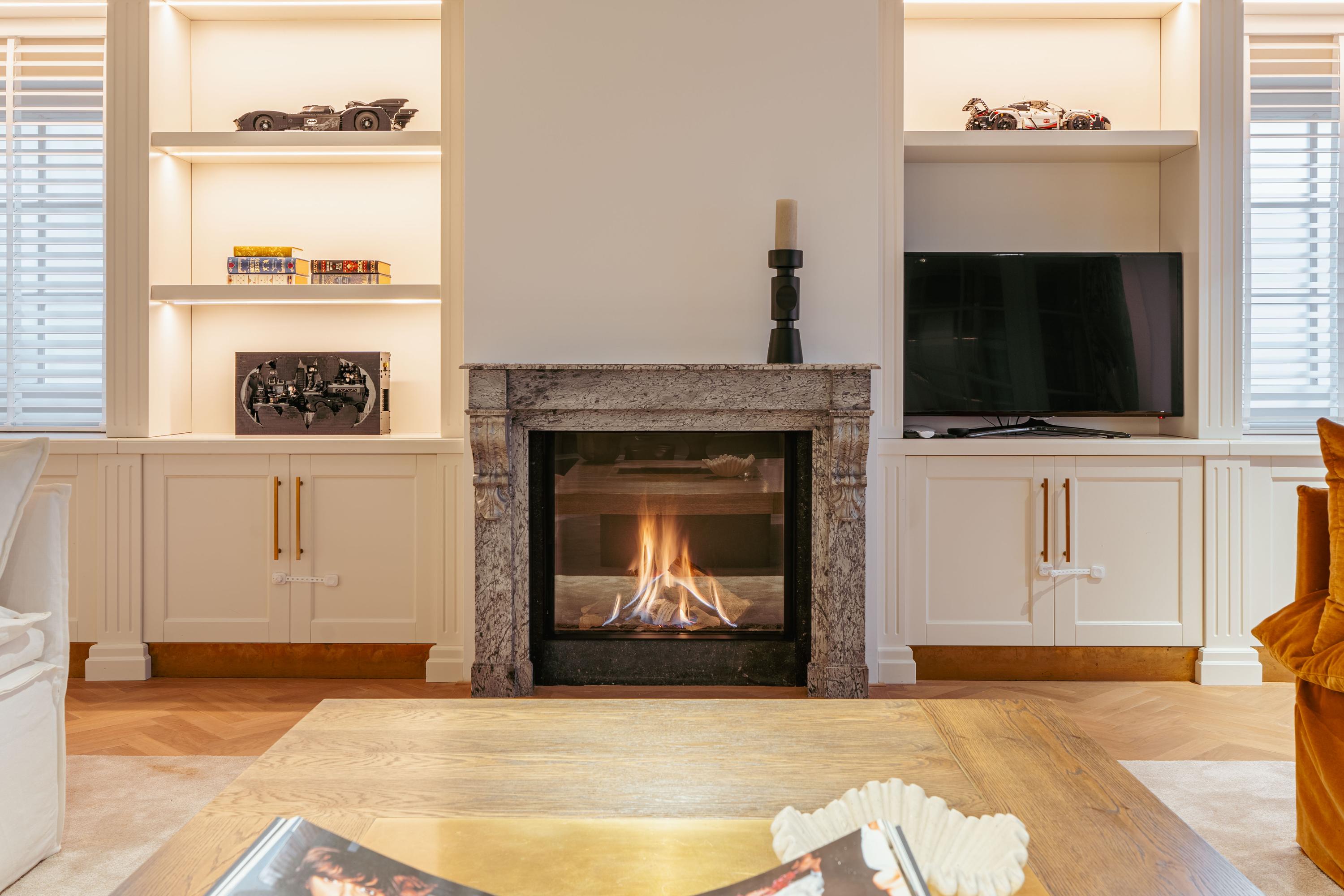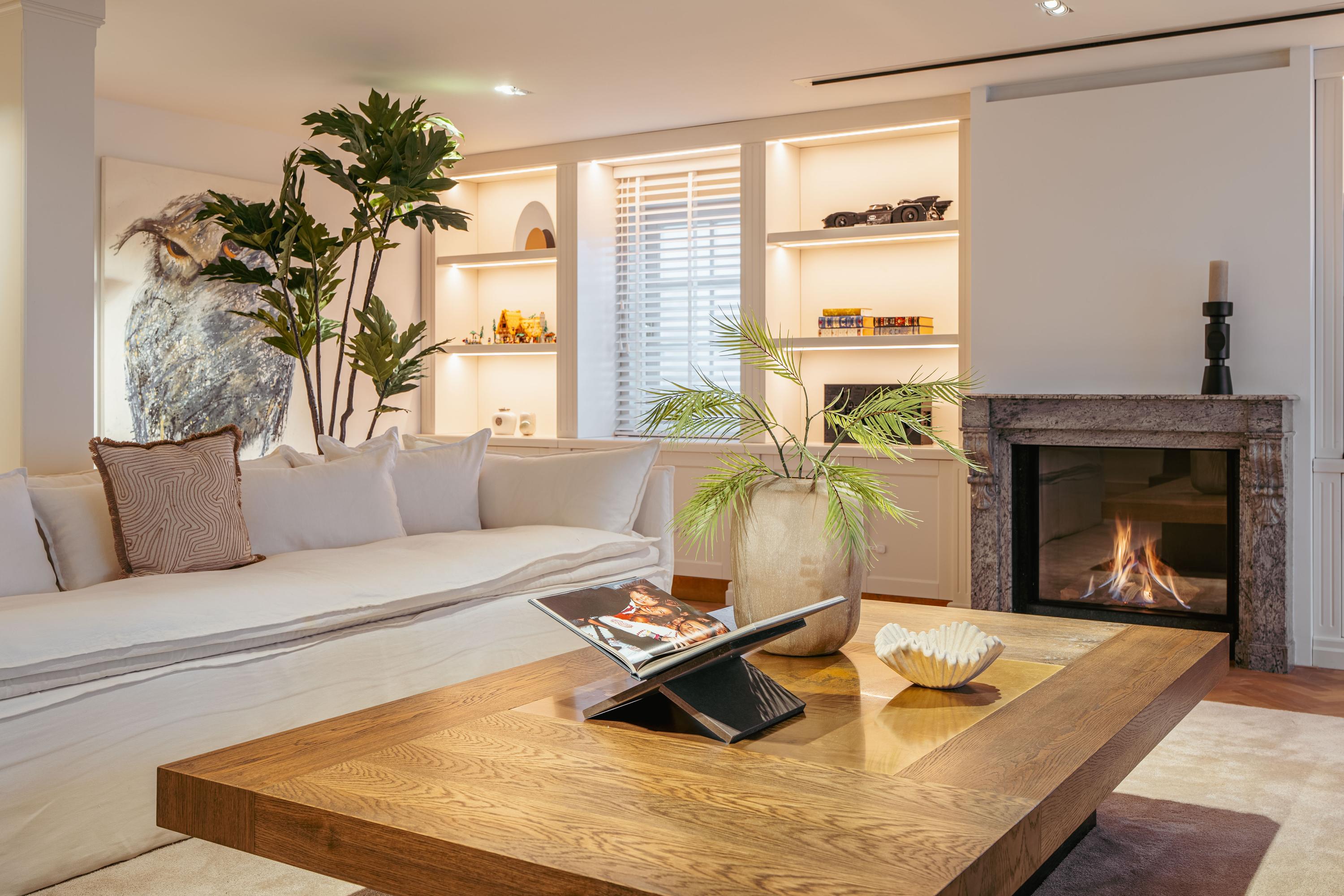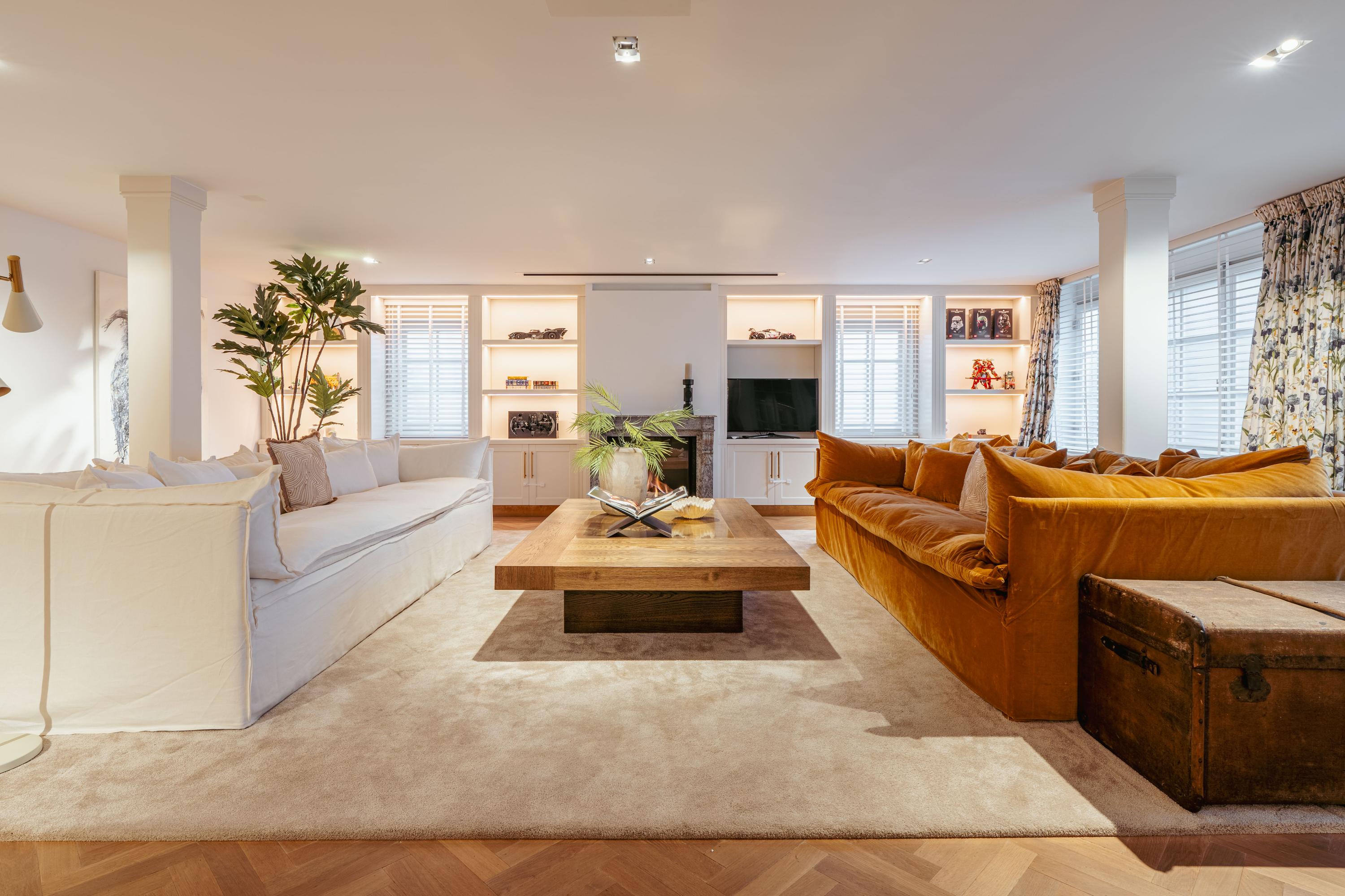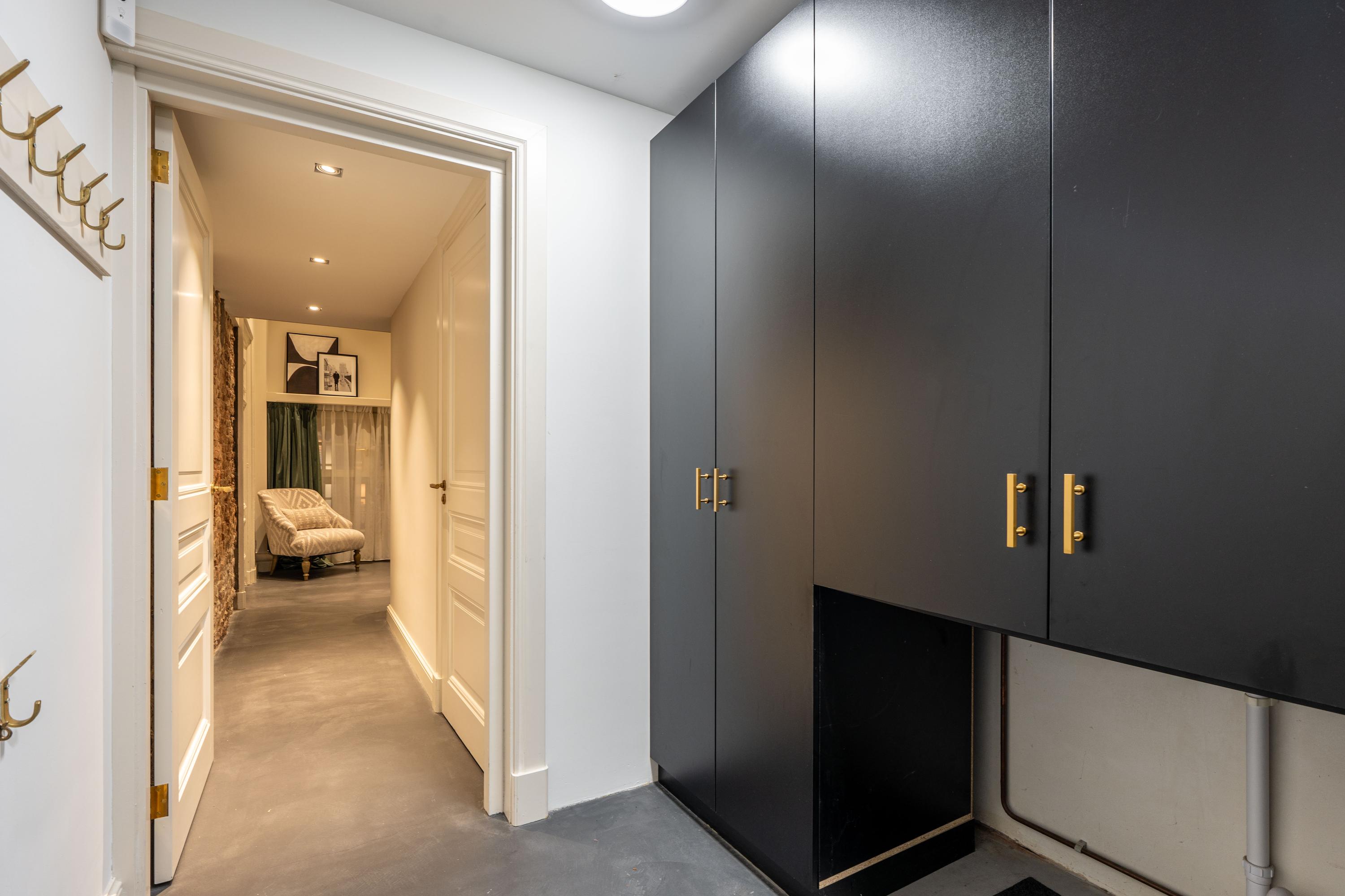 Through an elegant entrance, you step into the spacious and stylishly designed open-plan kitchen. The kitchen is equipped with various built-in appliances, including a dishwasher, gas stove with oven, and a Quooker. The varying ceiling heights in different areas add a playful and dynamic touch to the home. Between the kitchen and the sitting room, there is a study/office space and a large toilet. The living room features a beautiful herringbone parquet floor, custom-built cabinetry, and a projector with a screen. To complete the cozy ambiance, a large gas fireplace has been installed. Both the kitchen and a separate entrance from the street provide access to the guest quarters, which include an additional kitchen, bathroom, and laundry facilities. This space is perfect for accommodating guests or an au pair.