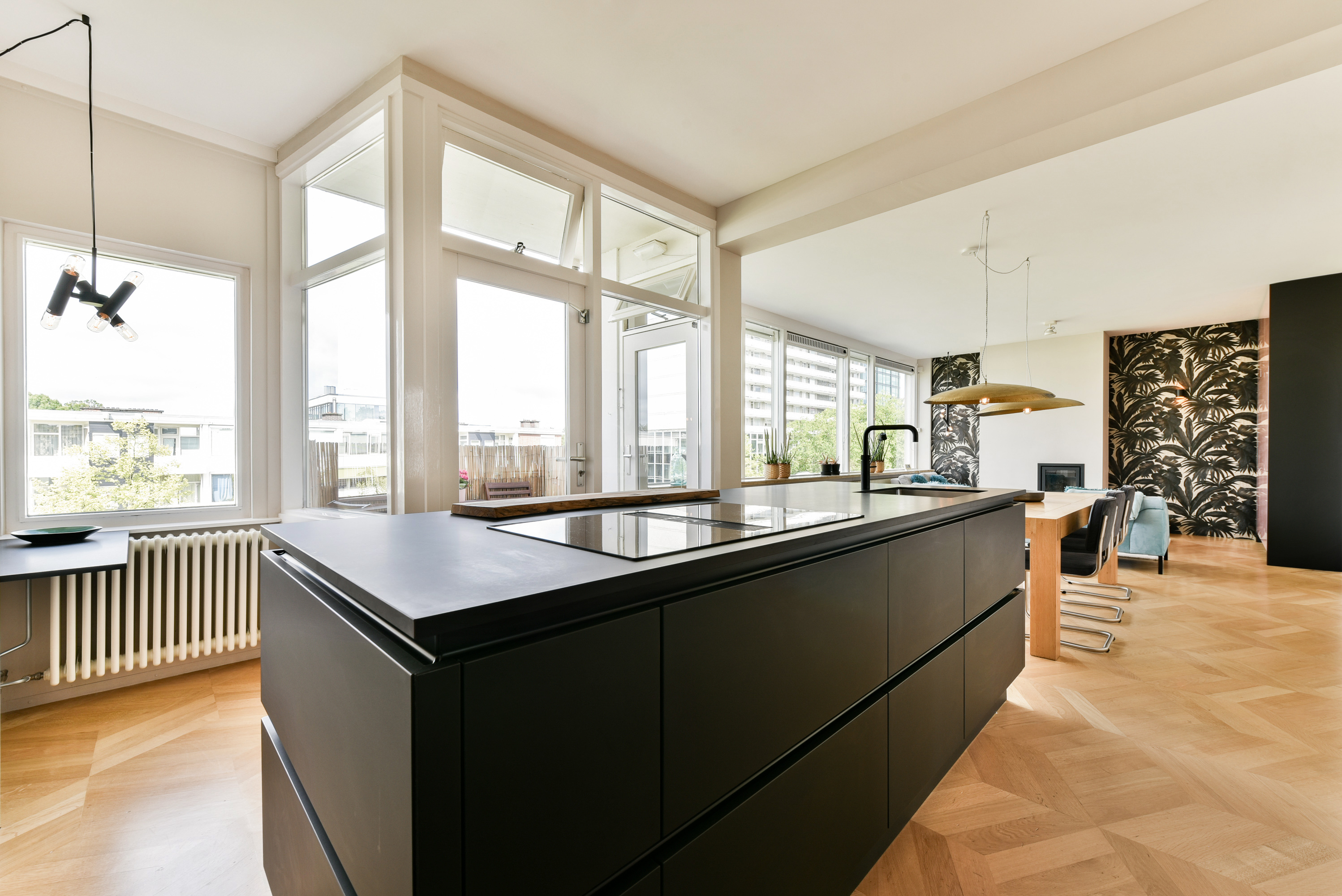 Upon entering, you are welcomed by a spacious hallway with an elegant parquet floor and practical built-in cupboards. The bright living area comprises a generous open-plan kitchen, dining space, and a comfortable lounge featuring a built-in wood-burning stove. The modern kitchen, finished in black Fenix, is equipped with a cooking island including an induction hob, oven, combi-oven, dishwasher, large refrigerator, and Quooker. Thanks to the glass façade and two French doors opening onto the west-facing balcony, the living room is bathed in natural light. The apartment offers three bedrooms. The master bedroom, located at the front of the apartment, features an entire wall of wardrobes, an original built-in cabinet with safe, and direct access to the balcony. The other bedrooms also enjoy access to the balcony. The luxurious bathroom is fitted with a rain shower, bathtub, double washbasin, and a second toilet. Additional built-in storage spaces are available throughout the apartment, including a spacious utility room with connections for a washing machine and dryer. The entire apartment is finished with a herringbone floor and atmospheric lighting by Zuiver. With large windows on both sides, the home enjoys abundant natural light throughout the day. Morning sun streams into the bedrooms, while in the afternoon and evening the kitchen and living area are filled with warm sunlight. This not only creates an exceptionally bright and airy atmosphere but also enhances the overall sense of space and comfort.