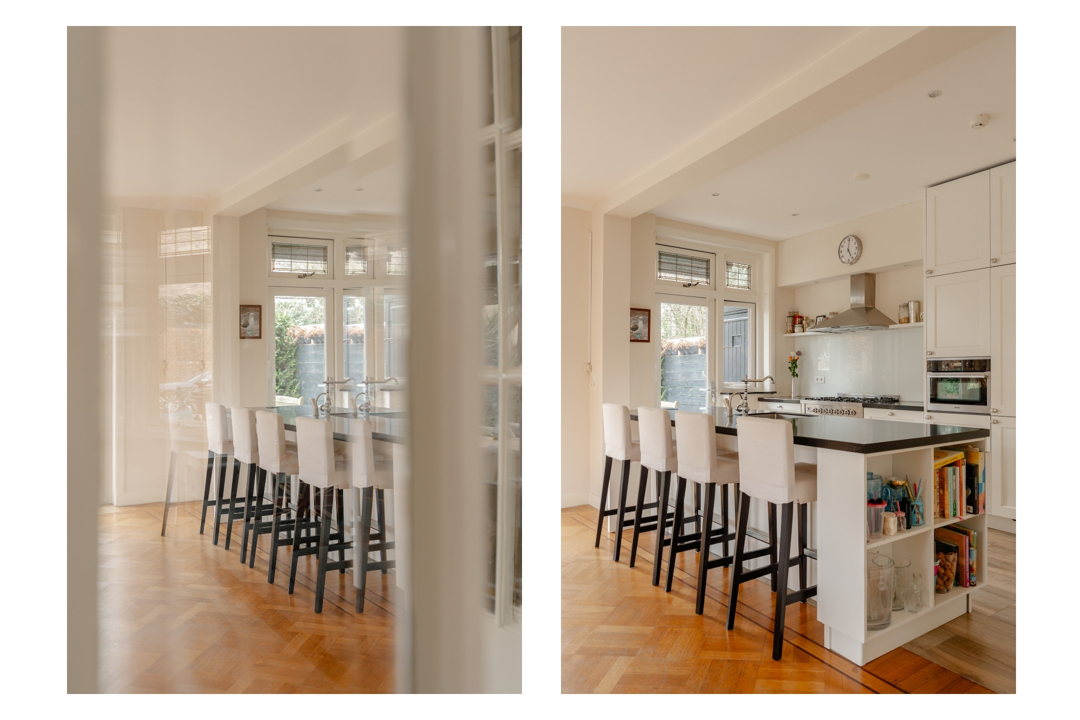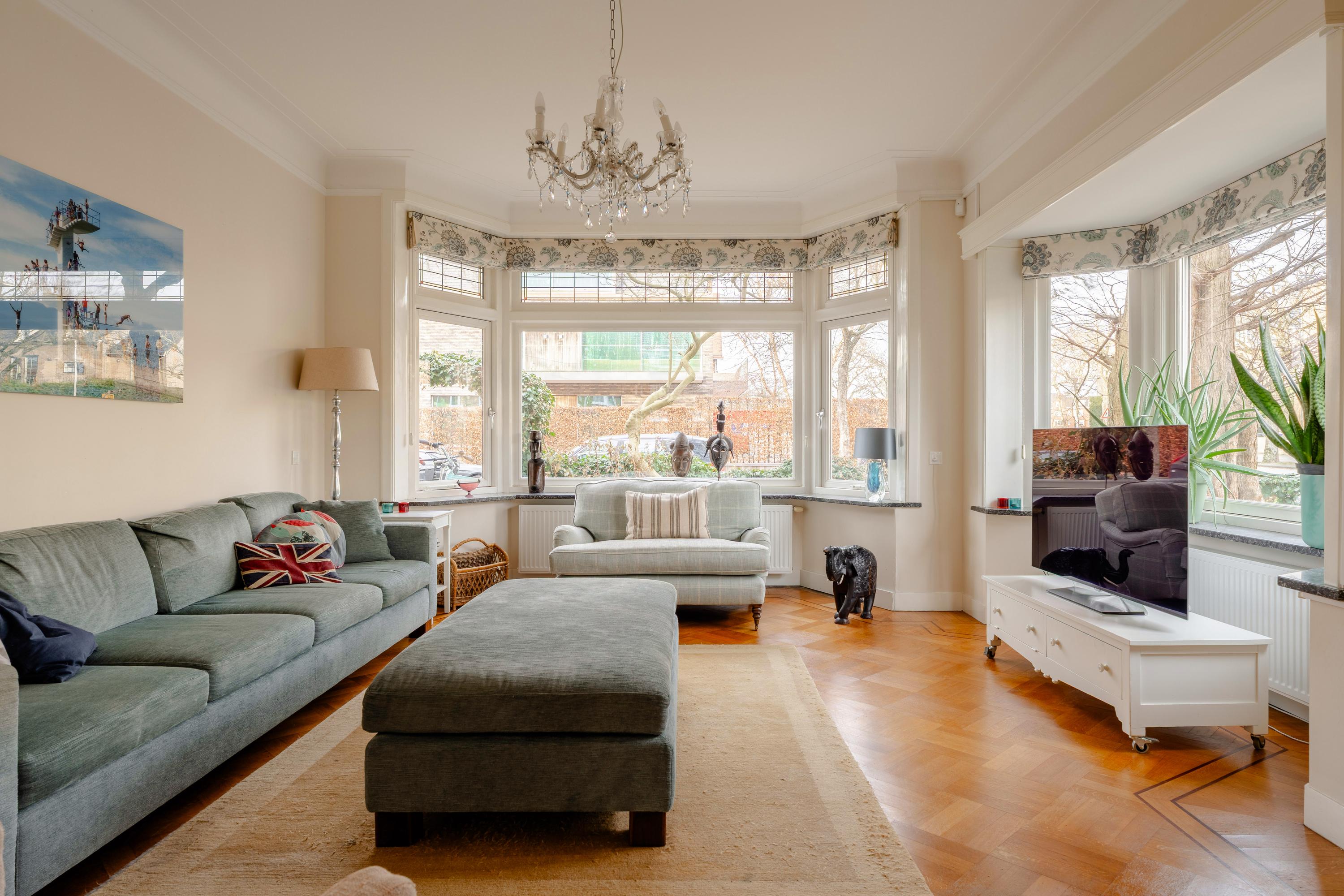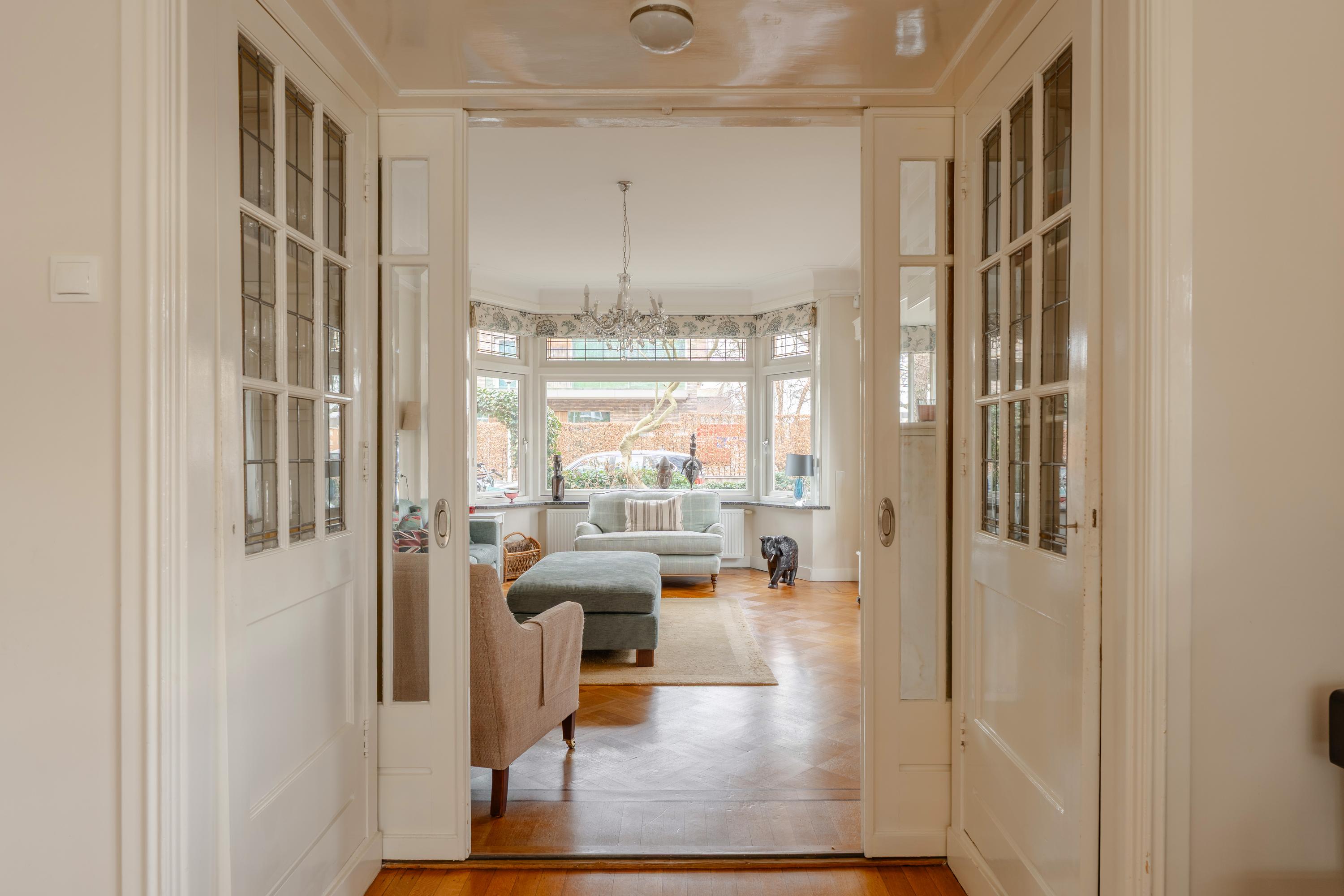 This floor is characterised by beautiful original stained-glass windows and an elegant parquet floor with border. At the front of the house is the spacious and bright en-suite living room with fireplace, creating a warm and inviting living space.