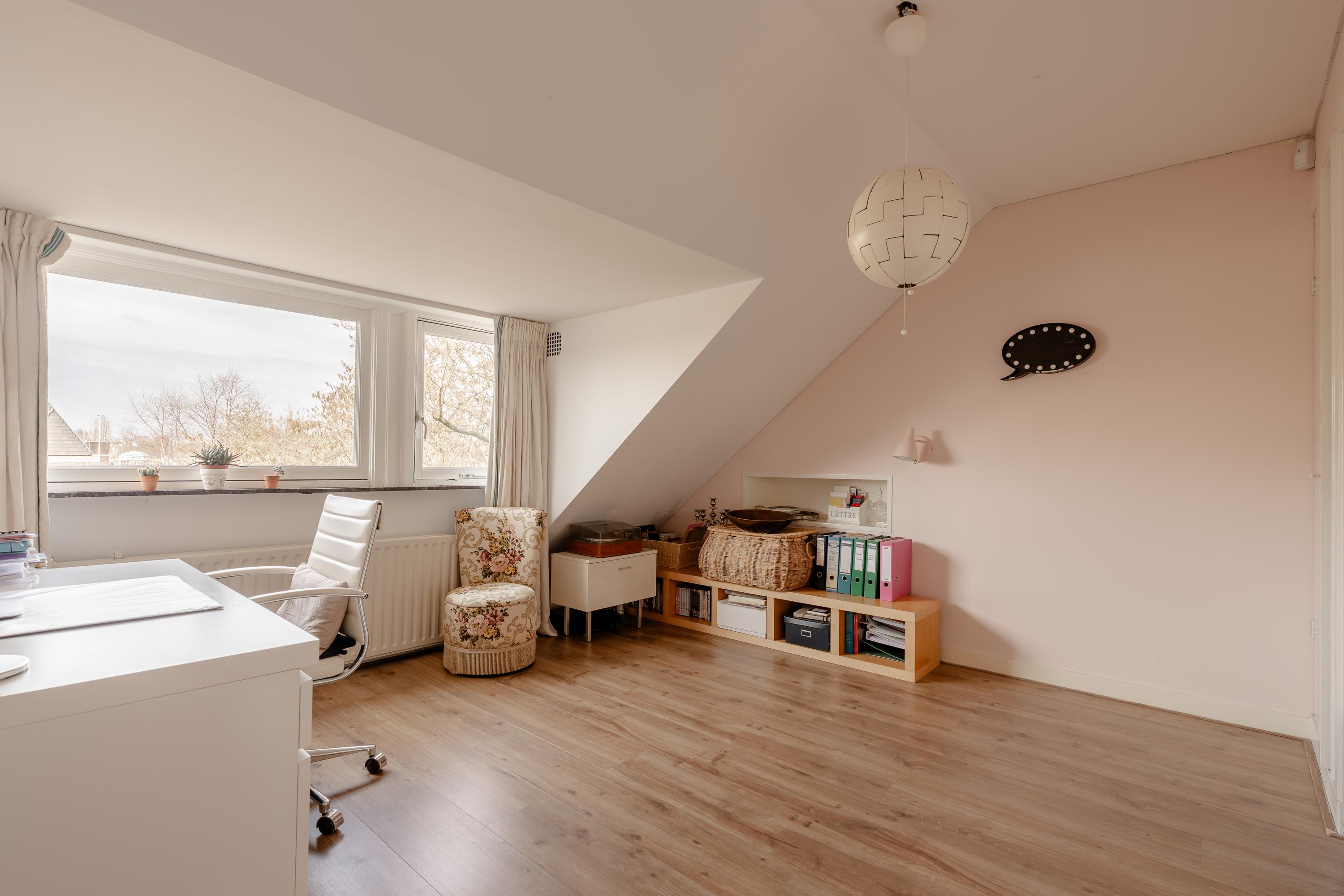 The room is currently arranged as a bedroom with a sitting area, but could easily serve as a master bedroom, studio or multifunctional space. Practical storage space is available in the knee walls.
