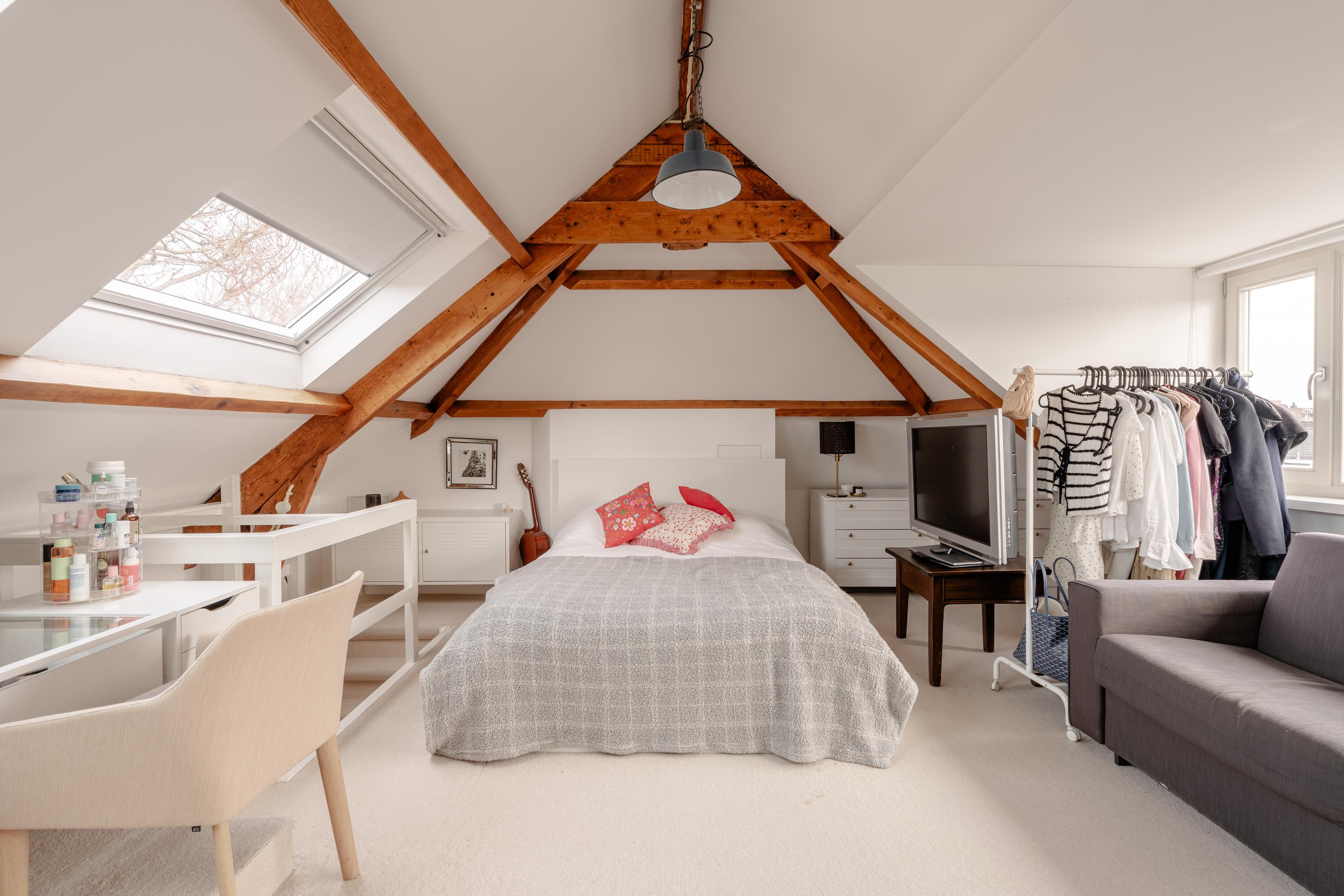 A fixed staircase leads to the third floor. Here you will find a very spacious and charming bedroom with visible wooden roof construction. Thanks to the dormer window and skylights, this level enjoys abundant natural light, creating a wonderful sense of space.