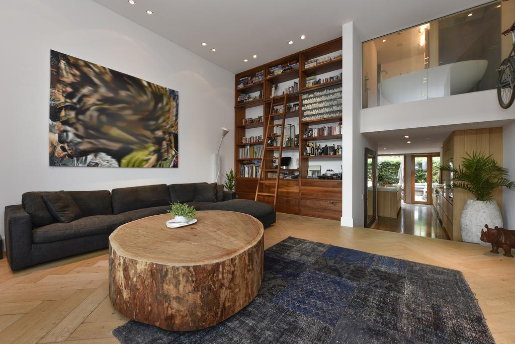 The living room is on the street side of the building and this means it has a gorgeous view out over the waters of the Boerenwetering. This area has a ceiling height of 3.90 metres and is fitted with a gas fireplace. There is a lovely view through from this space to the kitchen and garden, as well as to the freestanding bath.