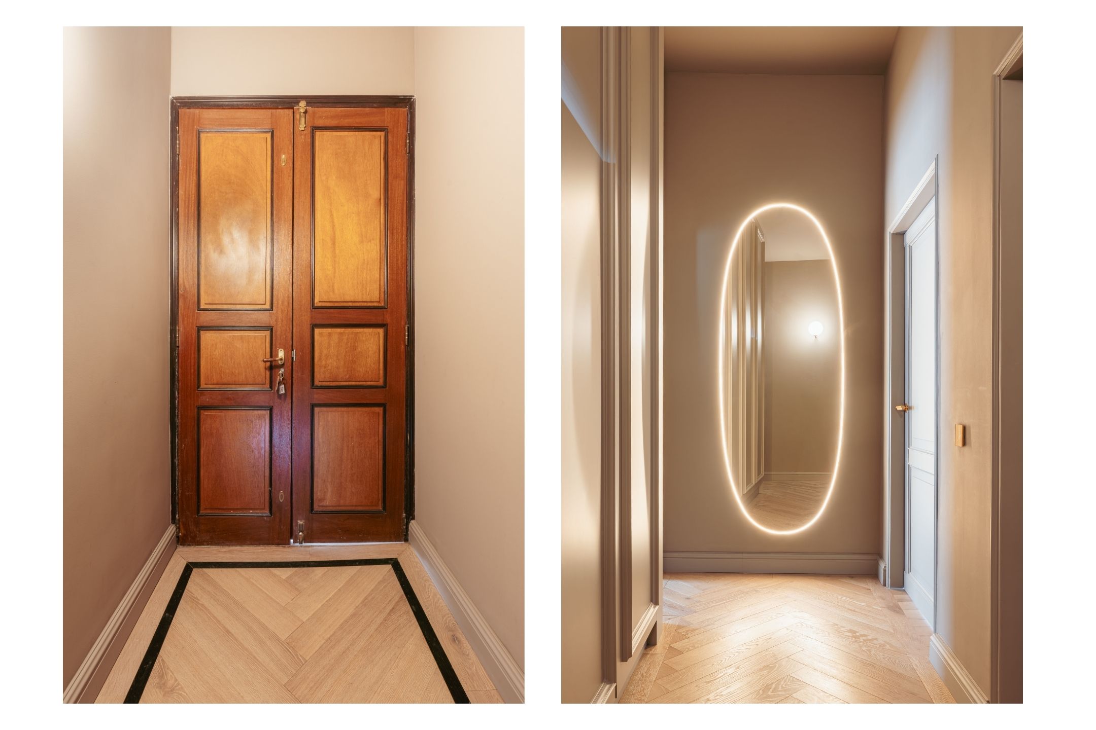 As soon as you step inside, the refined finishes are immediately apparent: high ceilings, paneled doors, a wooden floor with a black inlay border, and tasteful color choices create a luxurious and warm atmosphere.