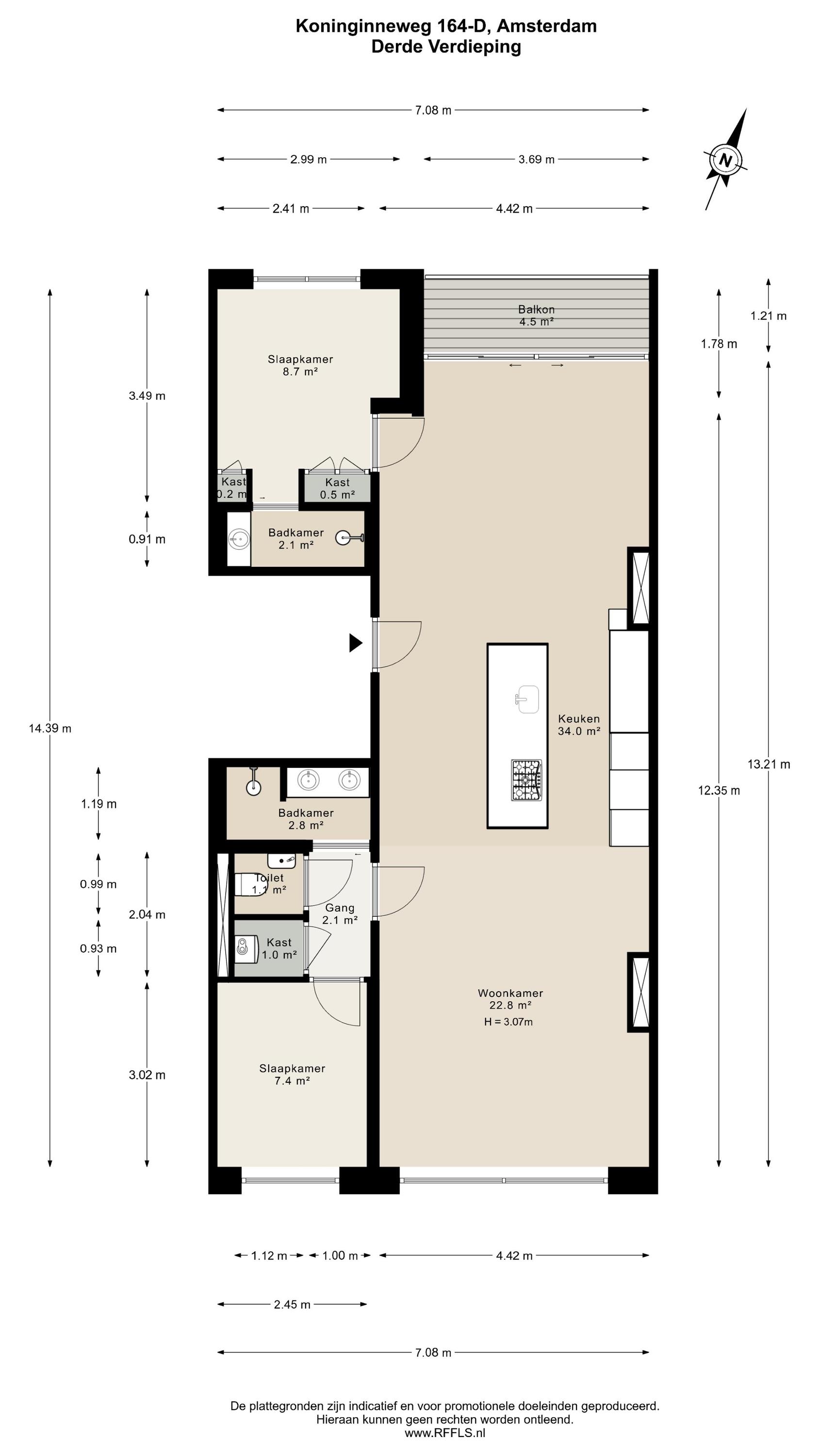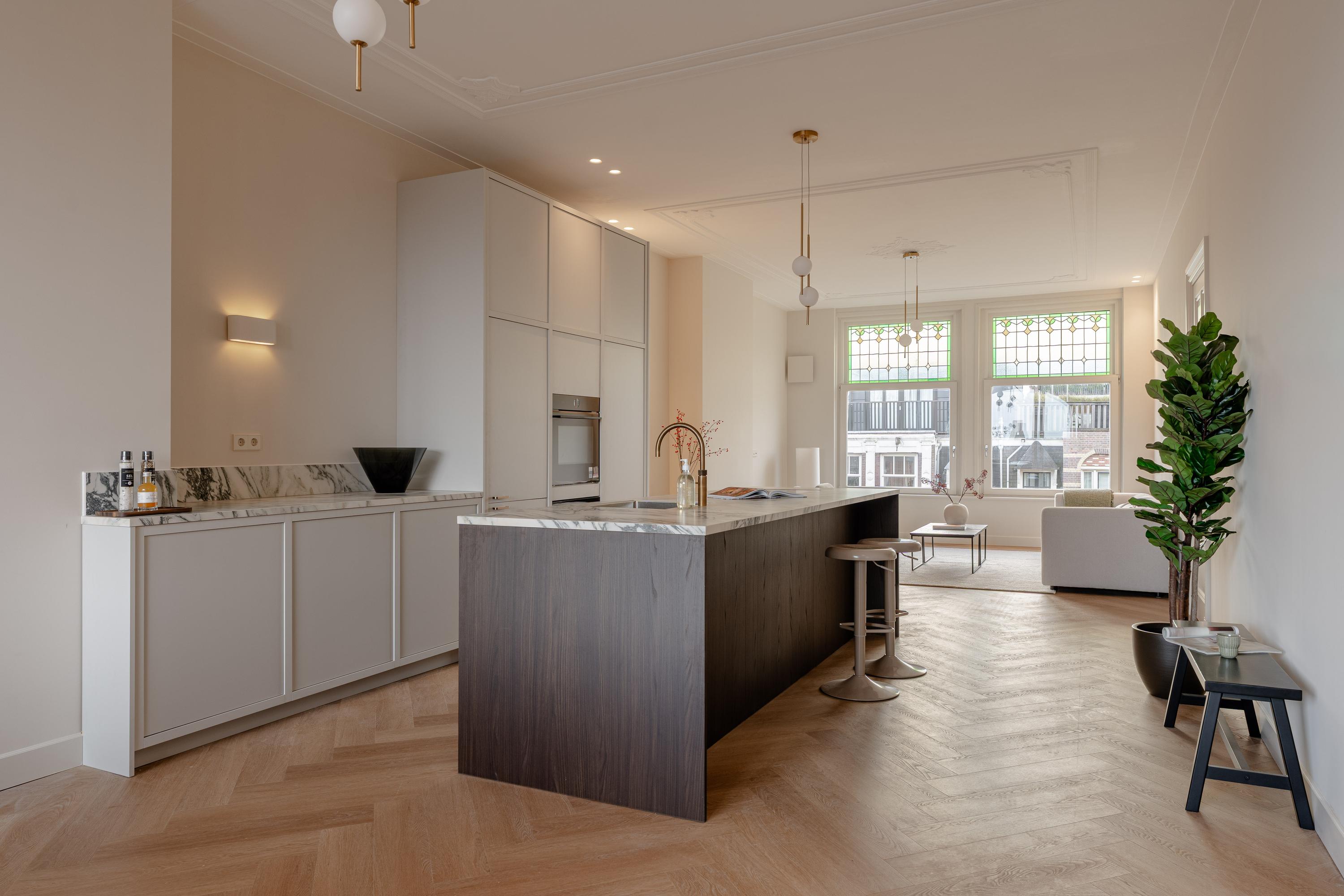 This luxurious apartment is located on the third floor and is characterised by a spacious and open layout, with large windows at both the front and rear providing pleasant natural light throughout the day. The apartment is finished to a high standard and offers a comfortable living environment with a calm and refined atmosphere. The living room is situated at the front of the apartment and features a ceiling height of approximately 3.07 metres. Together with the kitchen and dining area, it forms one generous open-plan living space. The luxurious kitchen is centrally positioned within the apartment and is designed around a spacious cooking and sink island, fitted with an induction hob, sink and Quooker. In addition, the kitchen is equipped with a refrigerator, freezer, combi oven, climate cabinet and ample cupboard space. The island also functions as a comfortable bar area. At the rear of the apartment is the covered balcony, offering attractive views over the green gardens at the back and providing a peaceful outdoor space to relax. At the front of the apartment, the hallway provides access to the first bedroom, the separate toilet, the laundry/storage room and the first bathroom. This bathroom is fitted with a walk-in shower and a double washbasin with vanity unit. The second bedroom is located at the rear of the apartment and features fixed wardrobe space and an en-suite bathroom, equipped with a walk-in shower and a washbasin with vanity unit.