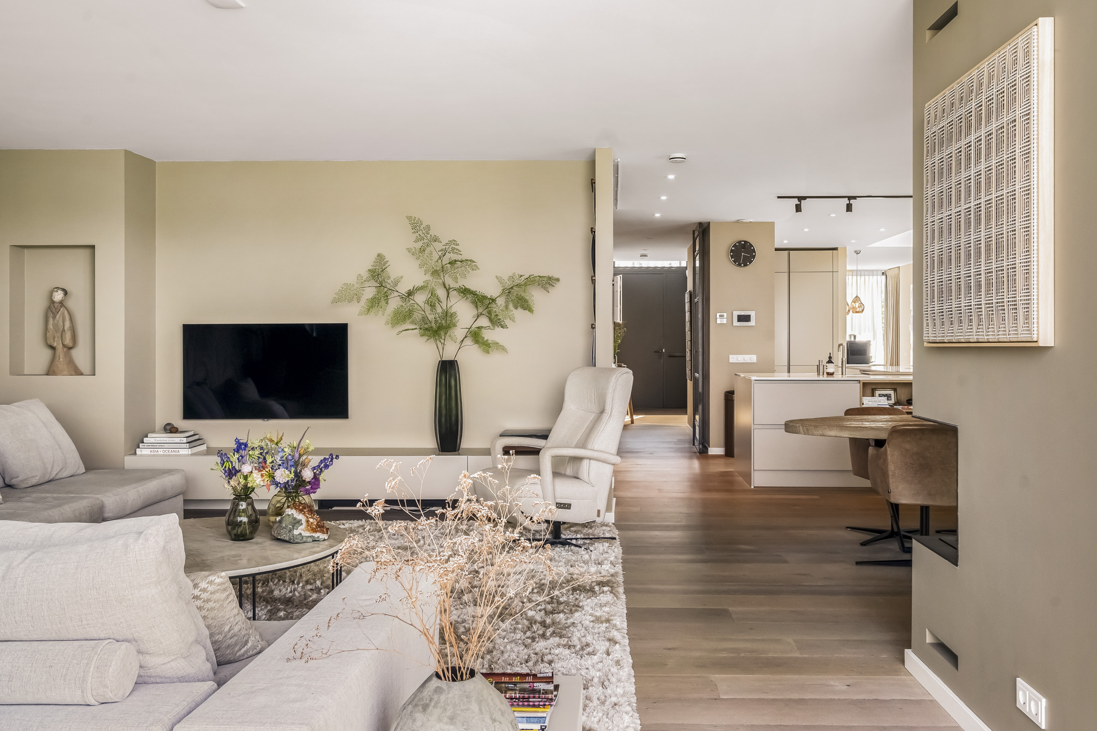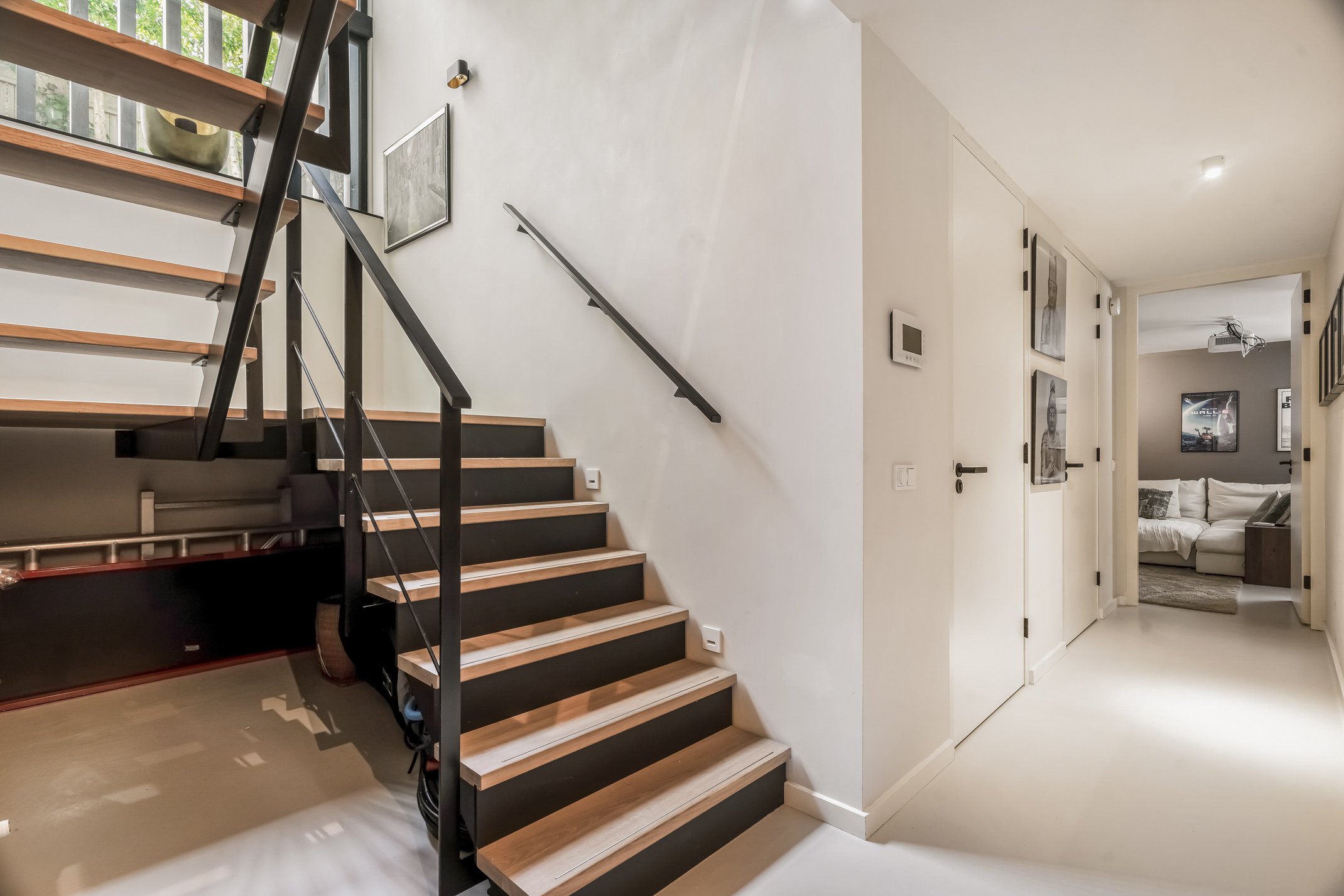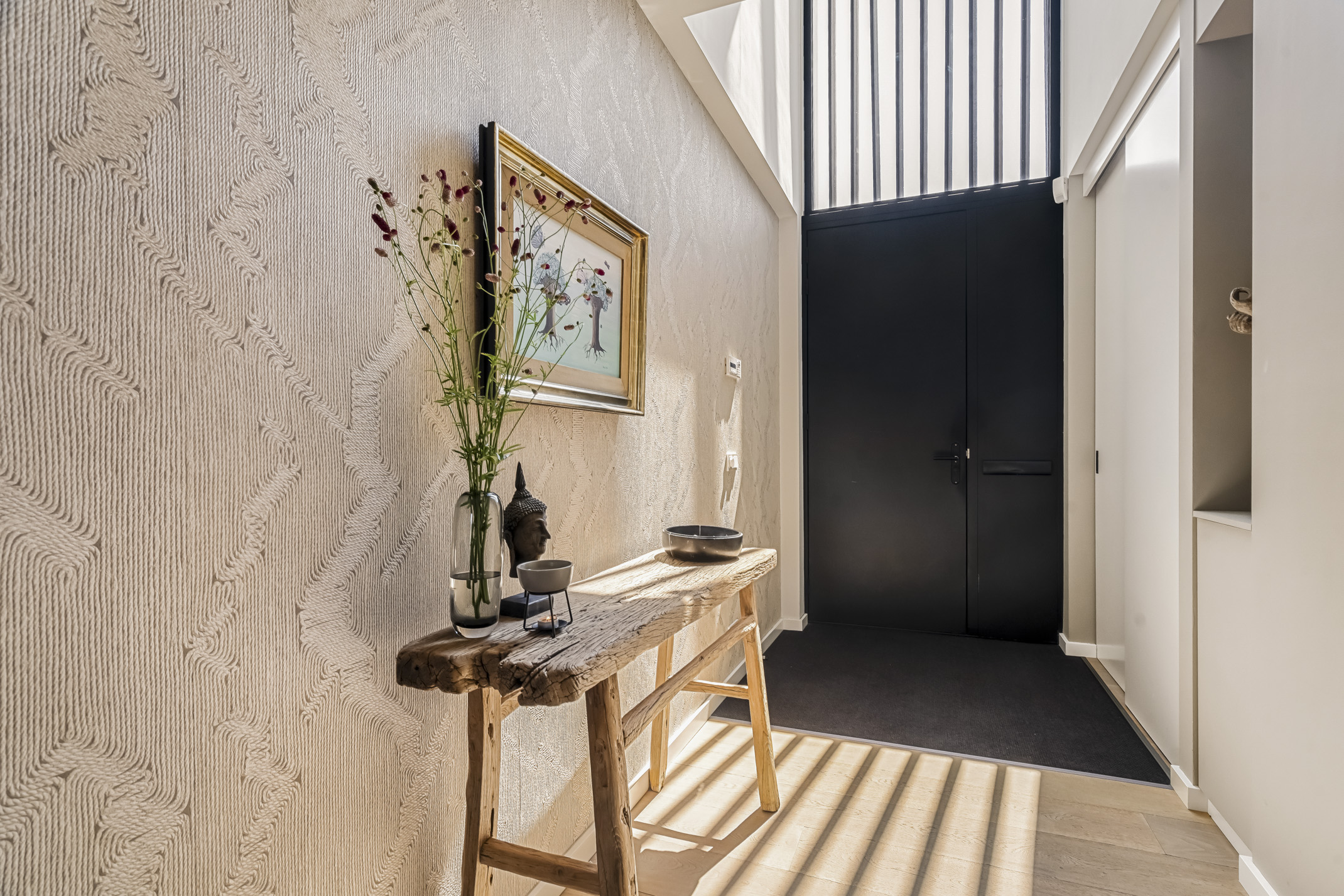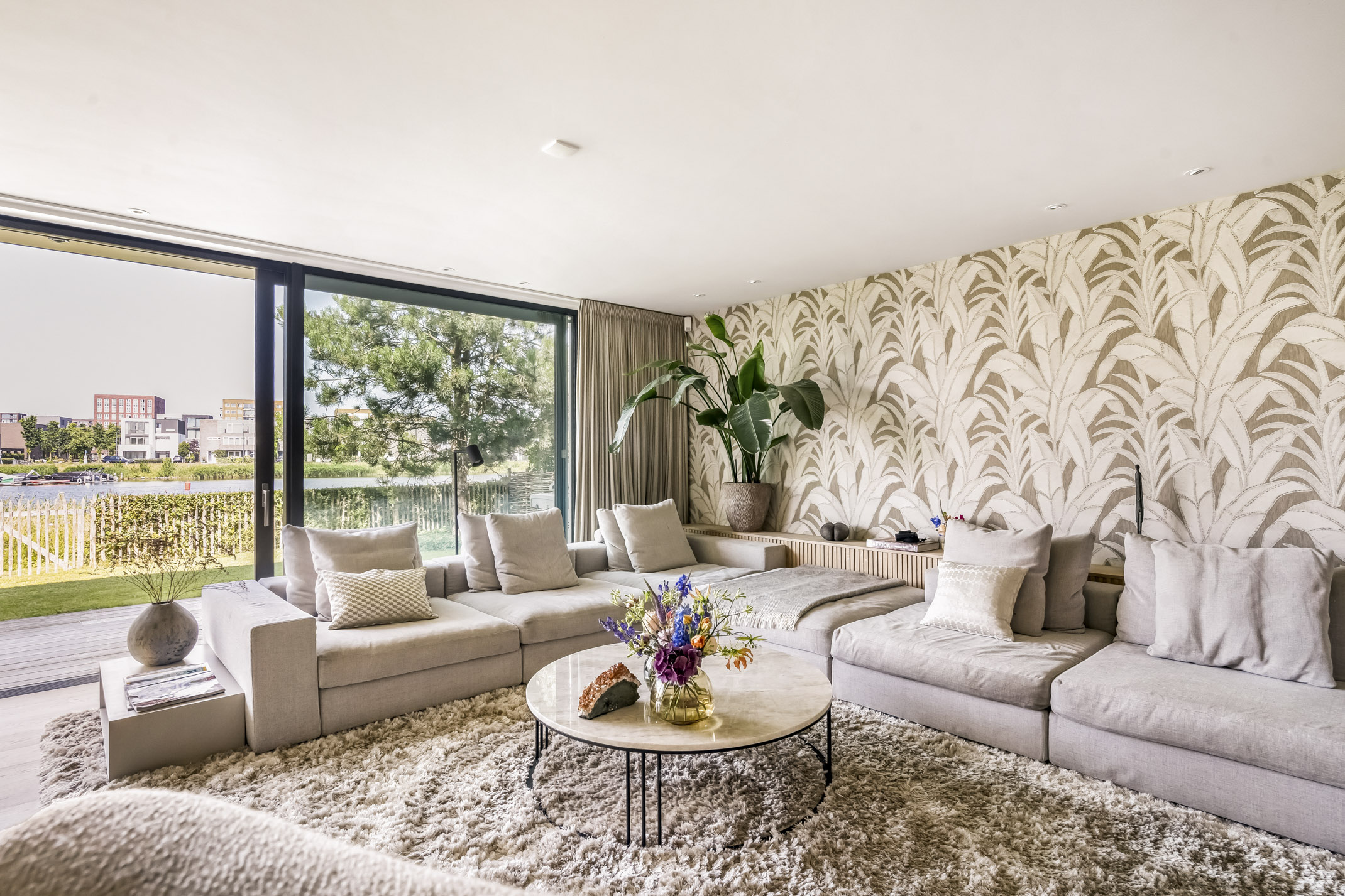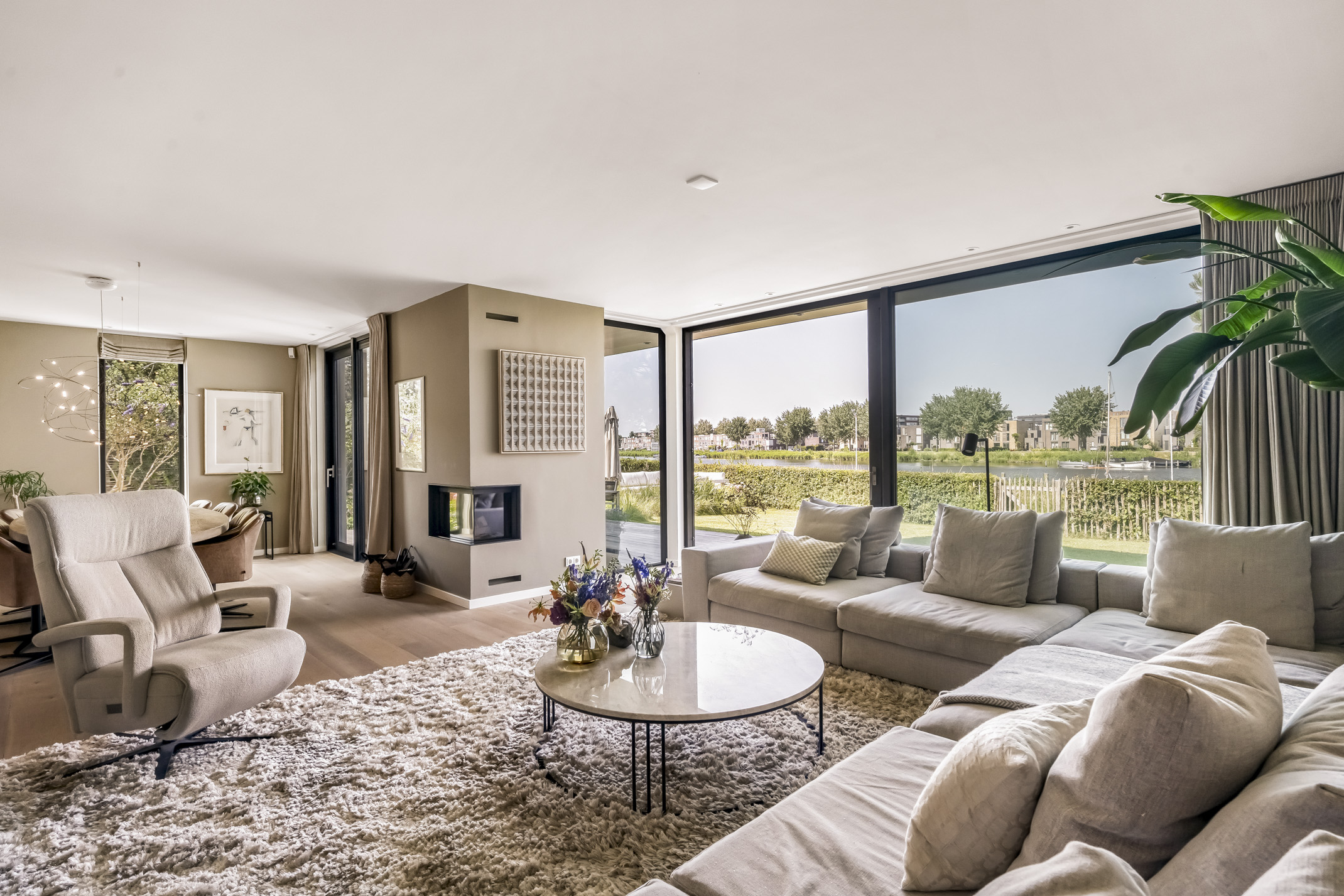 From the spacious hall with high ceilings, you enter the generous living area with large glass windows that immediately offer a beautiful view. The space has an impressive ceiling height and a cozy fireplace. Various sliding doors lead to the carefully landscaped garden with its own dock on the water. The garden features a large hardwood terrace, lawn and green borders.