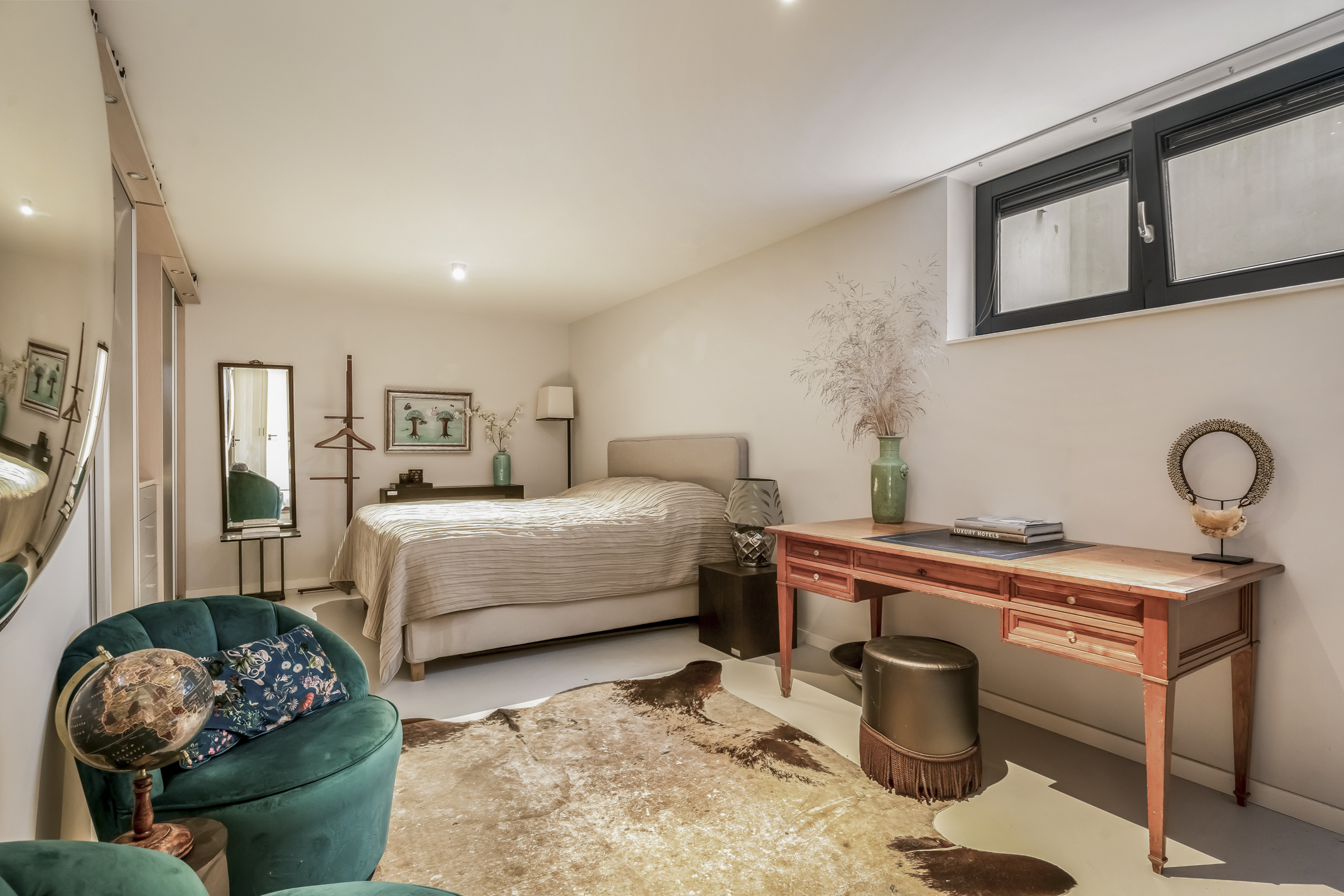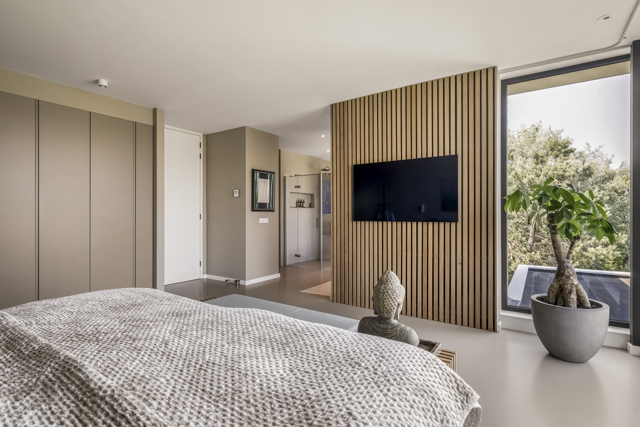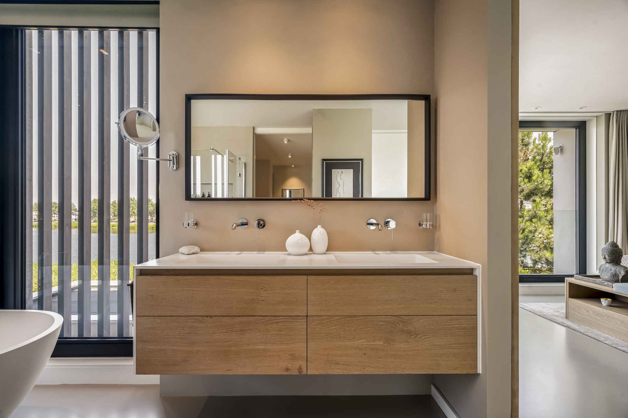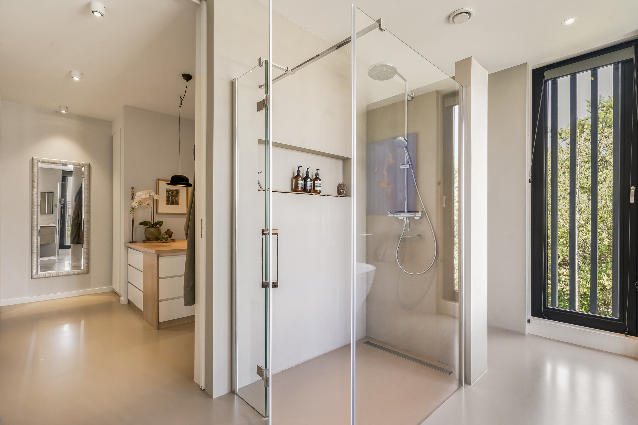 The luxurious kitchen is a dream for any chef, equipped with all modern appliances such as a Quooker, a Bora induction cooktop with integrated extraction system, dishwasher, extra large fridge and freezer, steam oven and a combi-oven. The coffee bar separates the kitchen from the study. There is also an outdoor kennel accessible from inside for your beloved pet.
