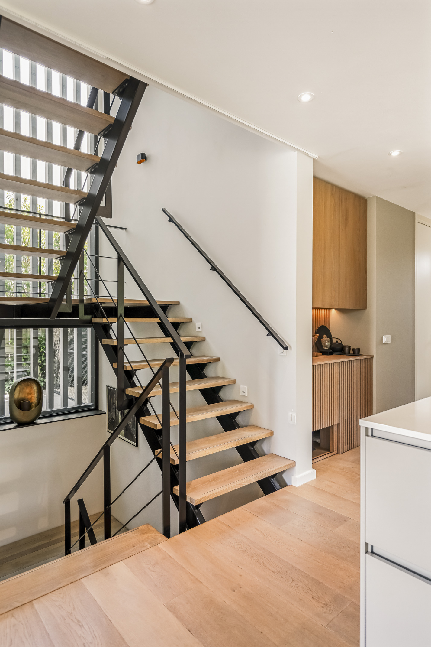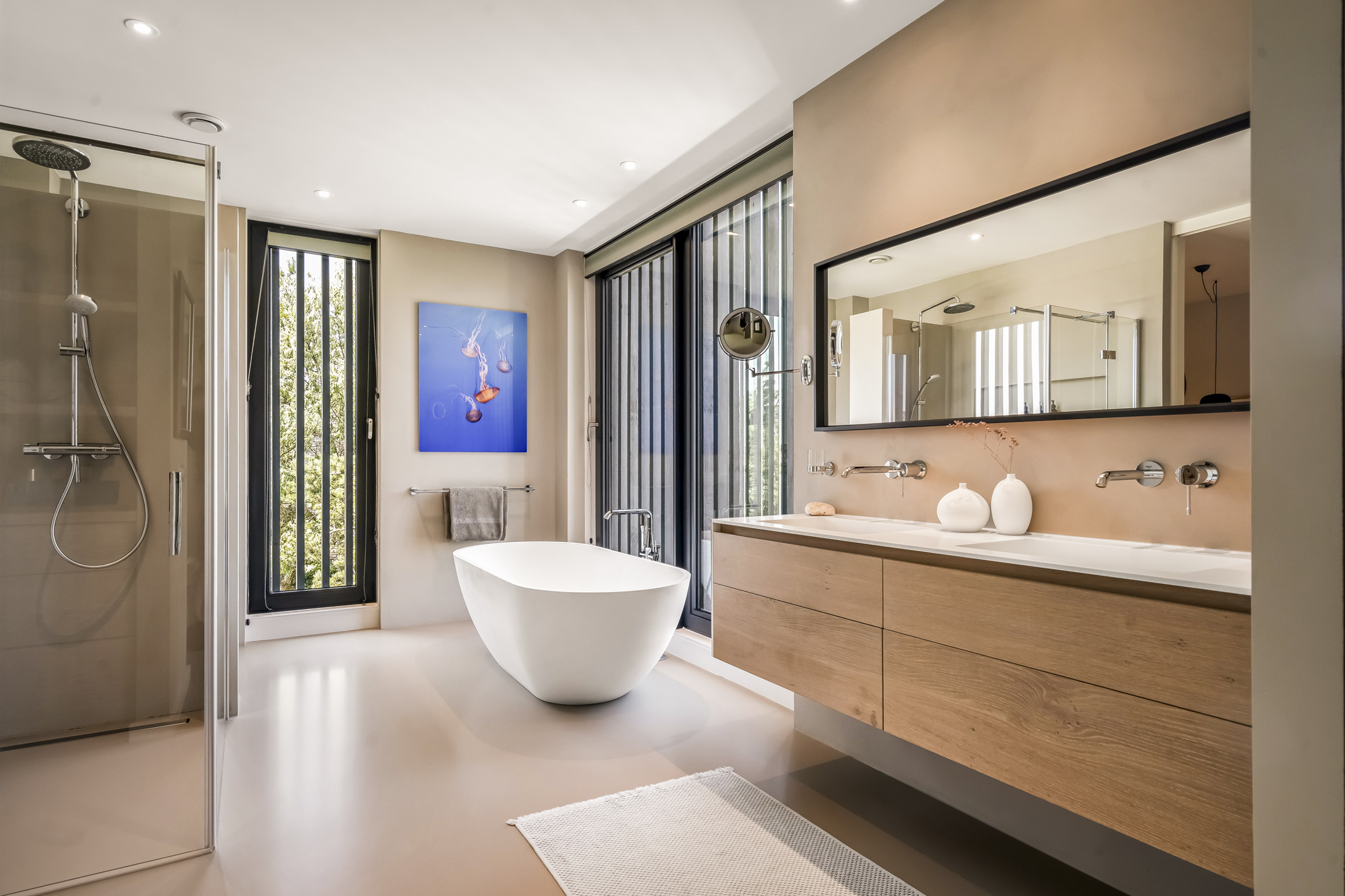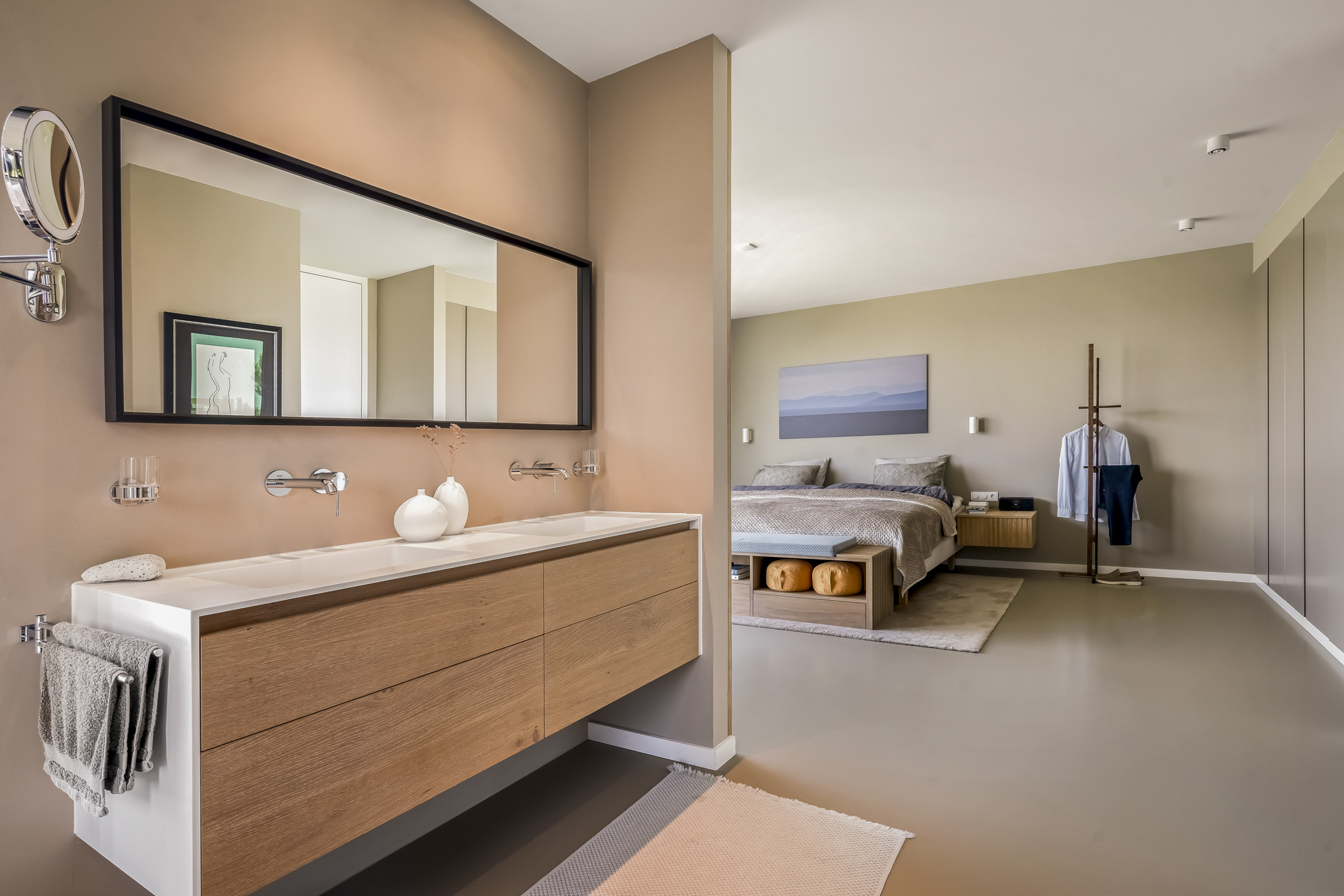 The luxurious kitchen is a dream for any chef, equipped with all modern appliances such as a Quooker, a Bora induction cooktop with integrated extraction system, dishwasher, extra large fridge and freezer, steam oven and a combi-oven. The coffee bar separates the kitchen from the study. There is also an outdoor kennel accessible from inside for your beloved pet.