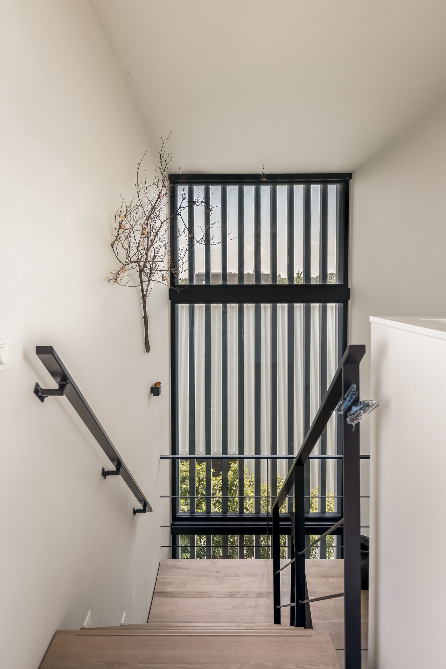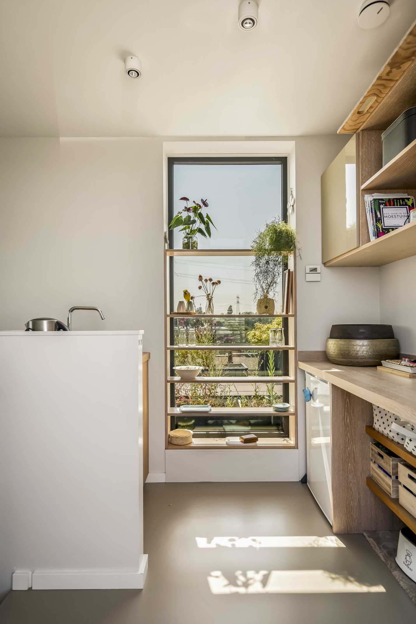 The second floor provides access to the sunny rooftop terrace with unparalleled privacy. On the landing, there is a kitchenette with a fridge and sink.