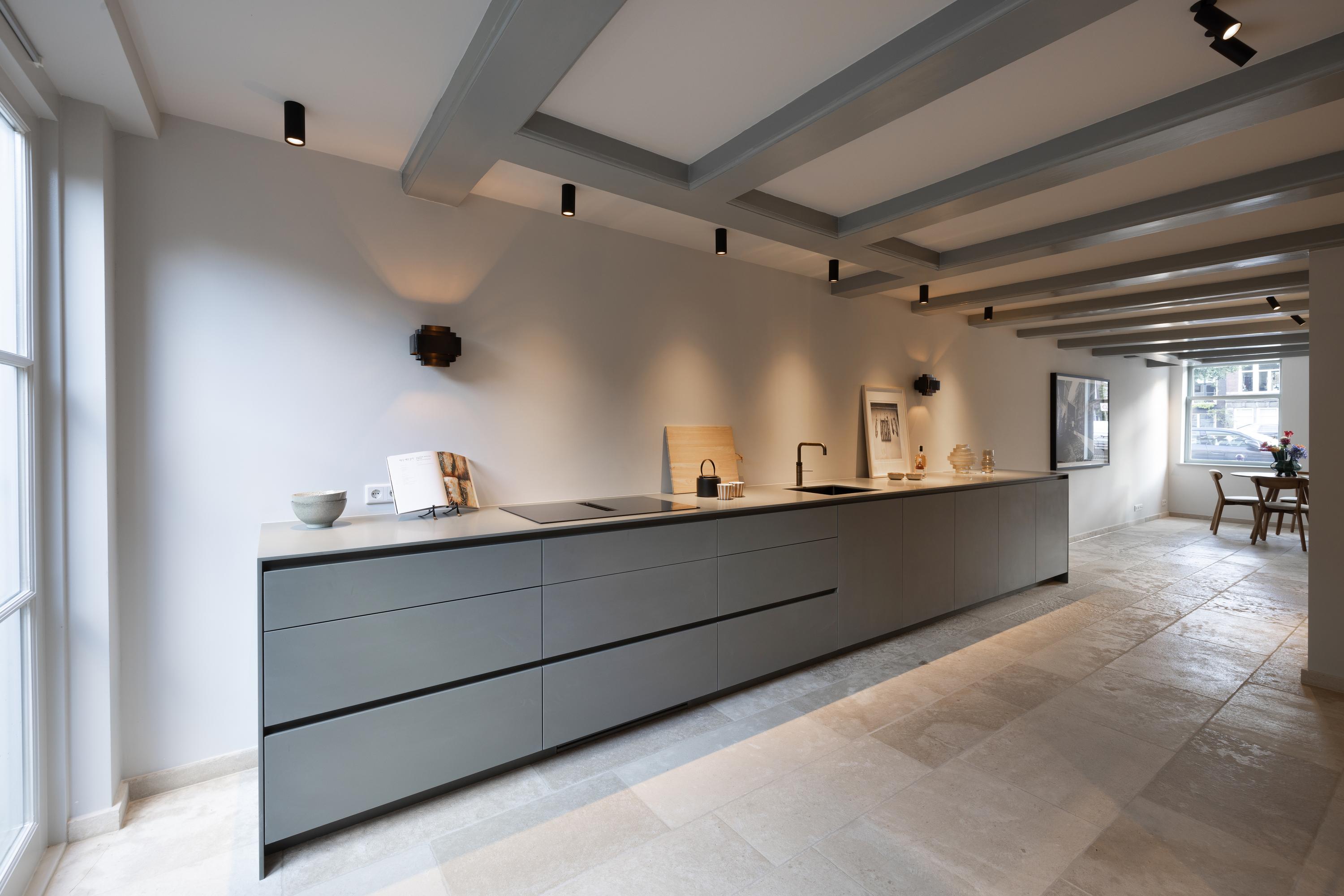 The living room is accessed via a passageway in which antique white tiles have been carefully preserved. The living room has a microcement floor and fireplace and a big tunnel gas fire. A wonderful sliding door gives access to a second patio with original tiling. Both the patios and skylights flood the living room with light. The ground floor is more than 30 metres long in total, which is unique for a canal property in Amsterdam.