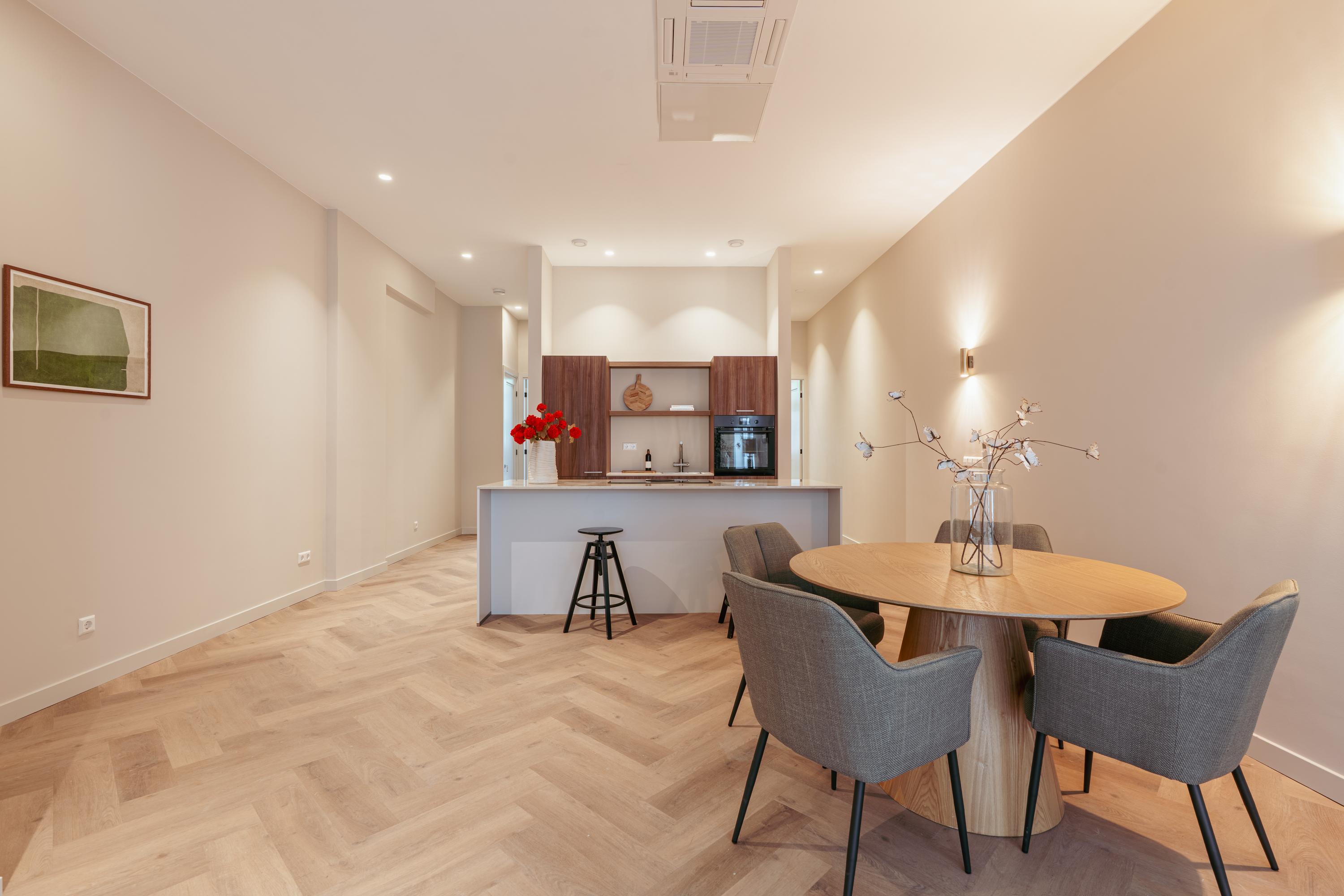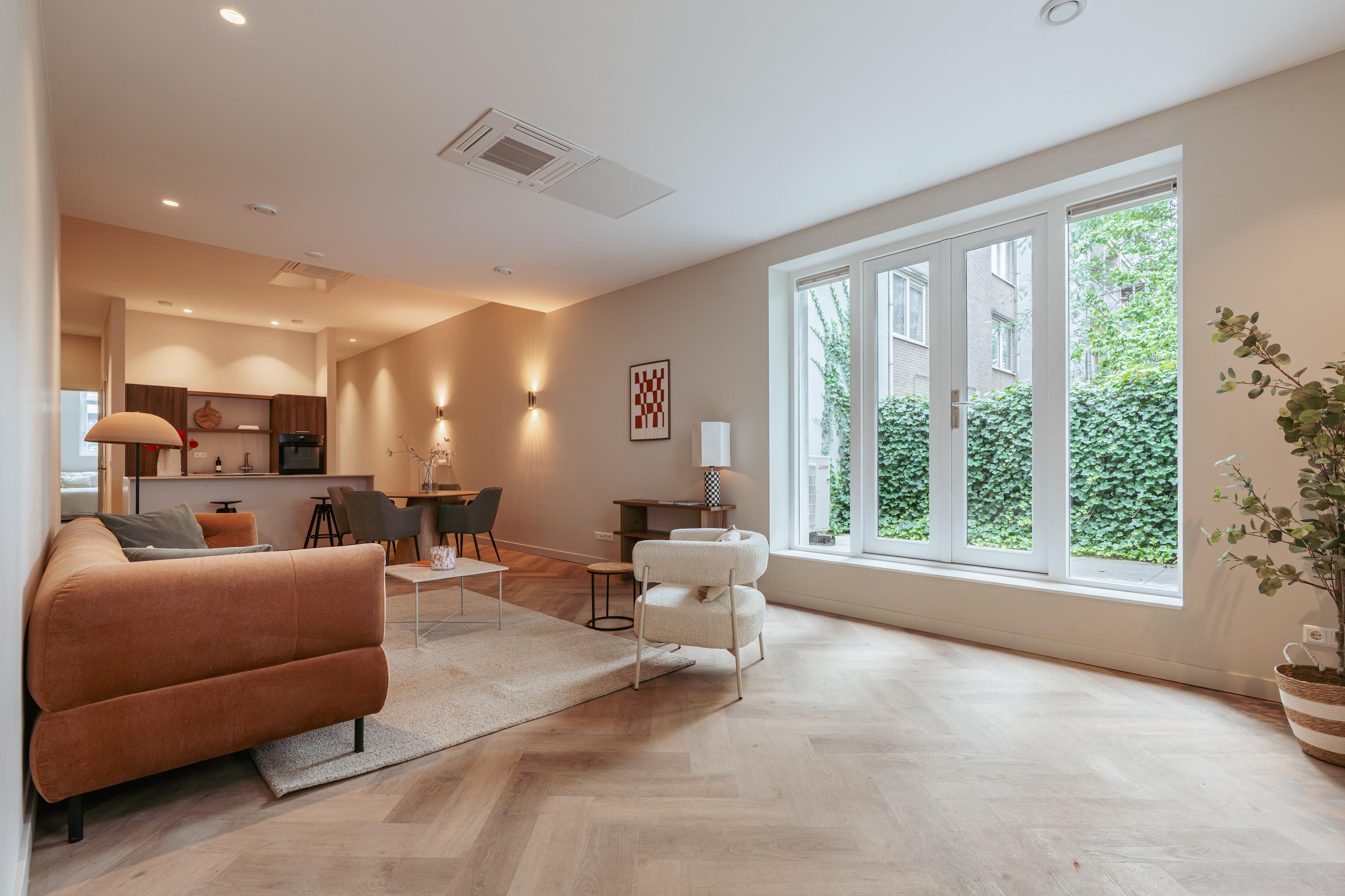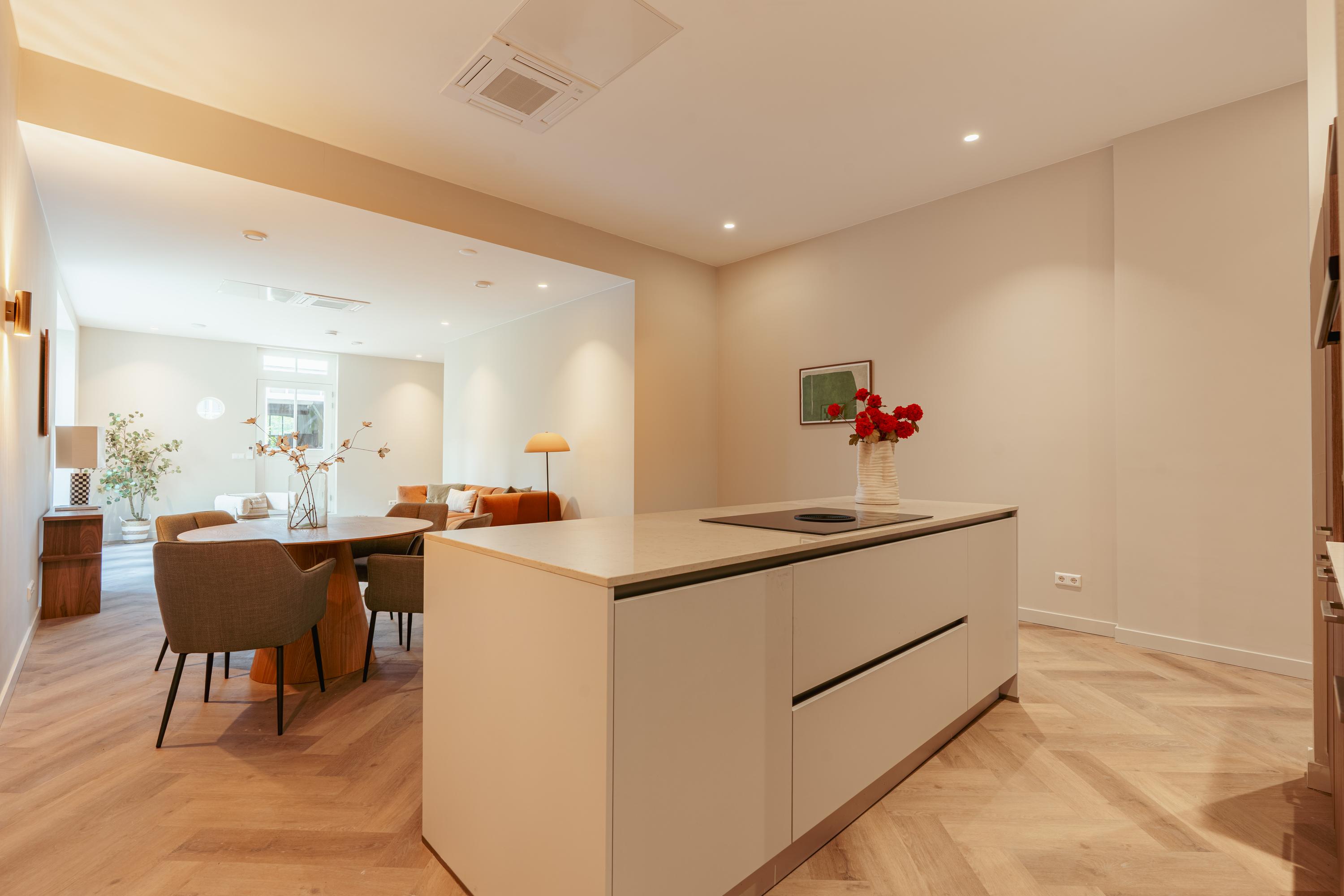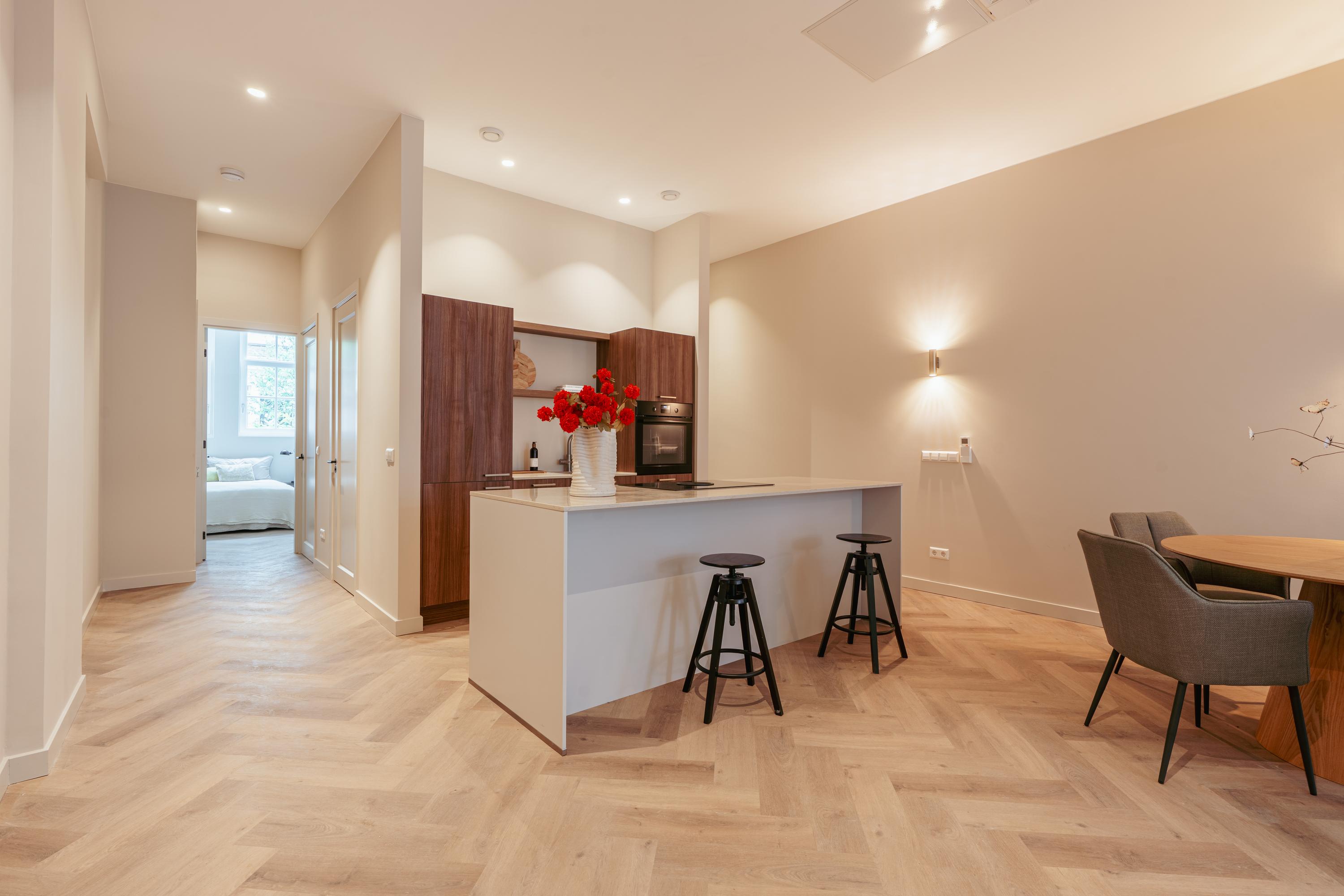 Via a private alleyway, you reach the apartment’s own front door. The entrance hall provides space for a generous coat cupboard. Upon entering, the high ceilings and impressive depth of the property immediately stand out, as well as the double doors leading to the northwest-facing garden—an inviting outdoor area of approximately 12 m², perfect for an afternoon drink in the sun. The home is laid out and finished with a great sense of style and practicality. Think beautiful flooring, sleek plasterwork, and air conditioning. The spacious kitchen-diner is the heart of the home, with an elegant cooking island equipped with all modern built-in appliances. At the front of the apartment are two generous bedrooms, cleverly separated from the living area to offer peace and privacy. Between them lies a stylish bathroom with walk-in shower and second toilet. There is also a separate laundry room and an additional guest toilet. Every detail has been carefully considered, with attention to luxury and comfort.