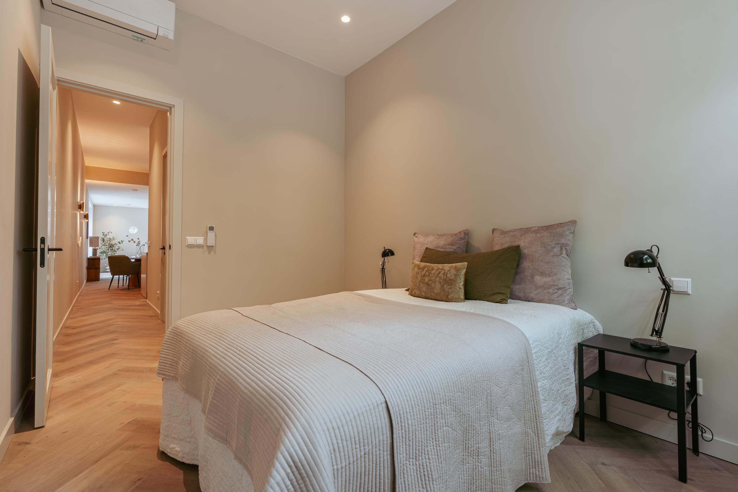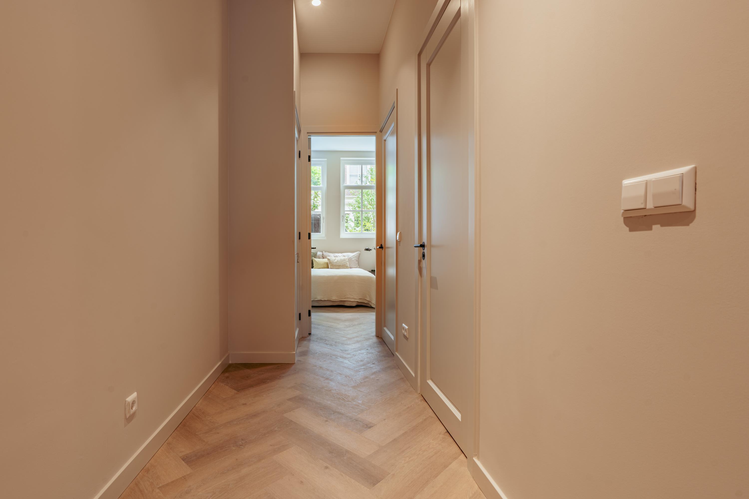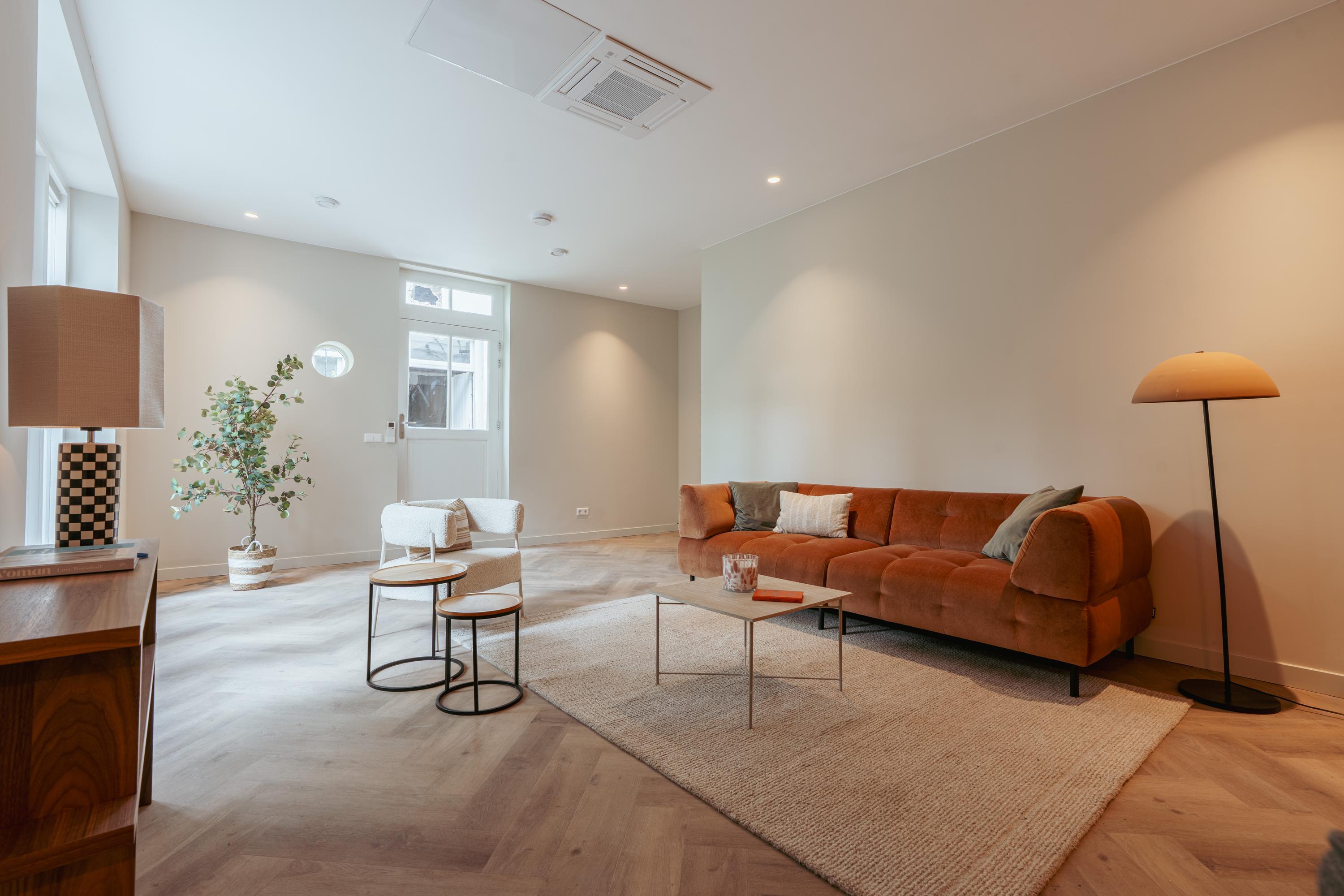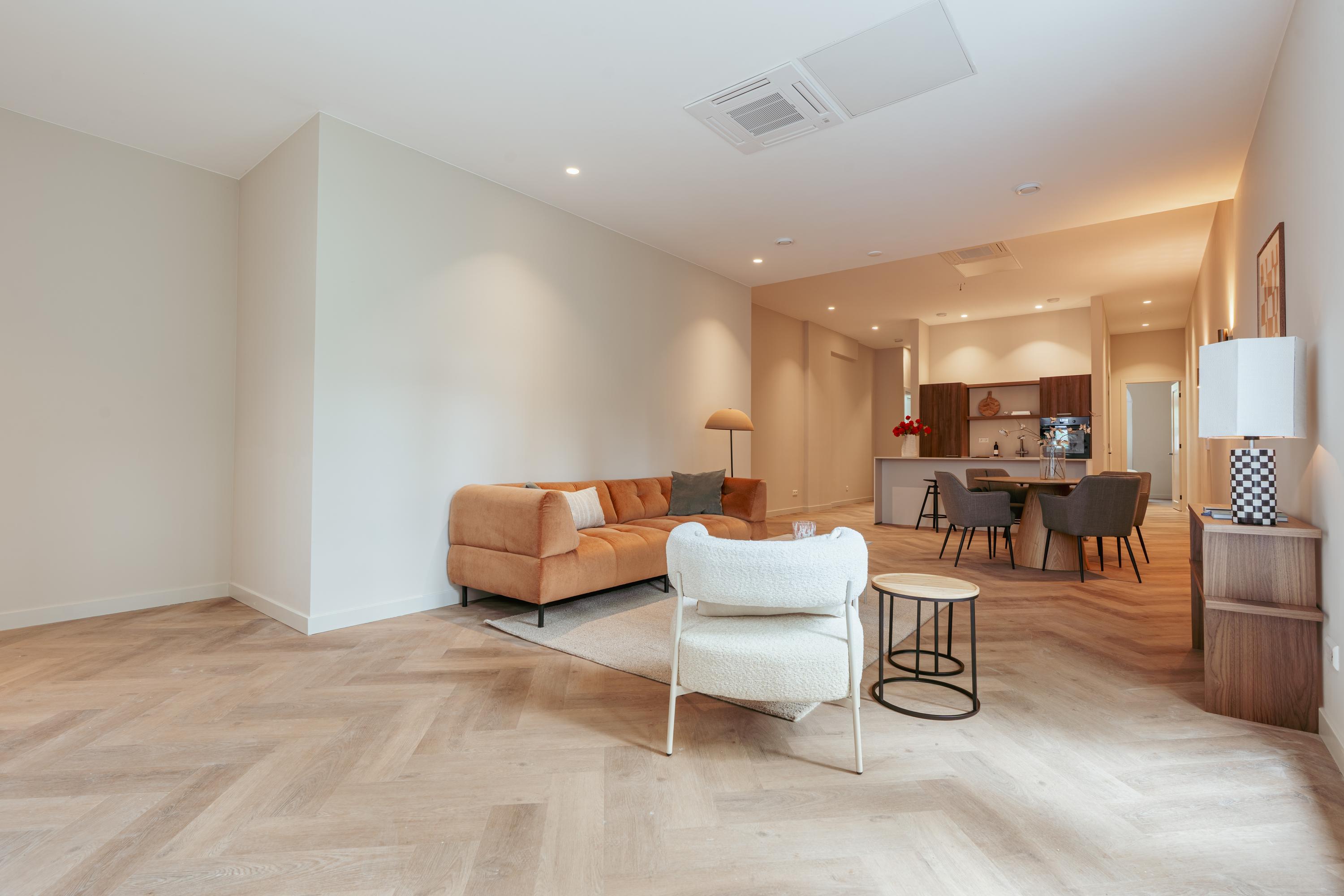 Via a private alleyway, you reach the apartment’s own front door. The entrance hall provides space for a generous coat cupboard. Upon entering, the high ceilings and impressive depth of the property immediately stand out, as well as the double doors leading to the northwest-facing garden—an inviting outdoor area of approximately 12 m², perfect for an afternoon drink in the sun. The home is laid out and finished with a great sense of style and practicality. Think beautiful flooring, sleek plasterwork, and air conditioning. The spacious kitchen-diner is the heart of the home, with an elegant cooking island equipped with all modern built-in appliances. At the front of the apartment are two generous bedrooms, cleverly separated from the living area to offer peace and privacy. Between them lies a stylish bathroom with walk-in shower and second toilet. There is also a separate laundry room and an additional guest toilet. Every detail has been carefully considered, with attention to luxury and comfort.