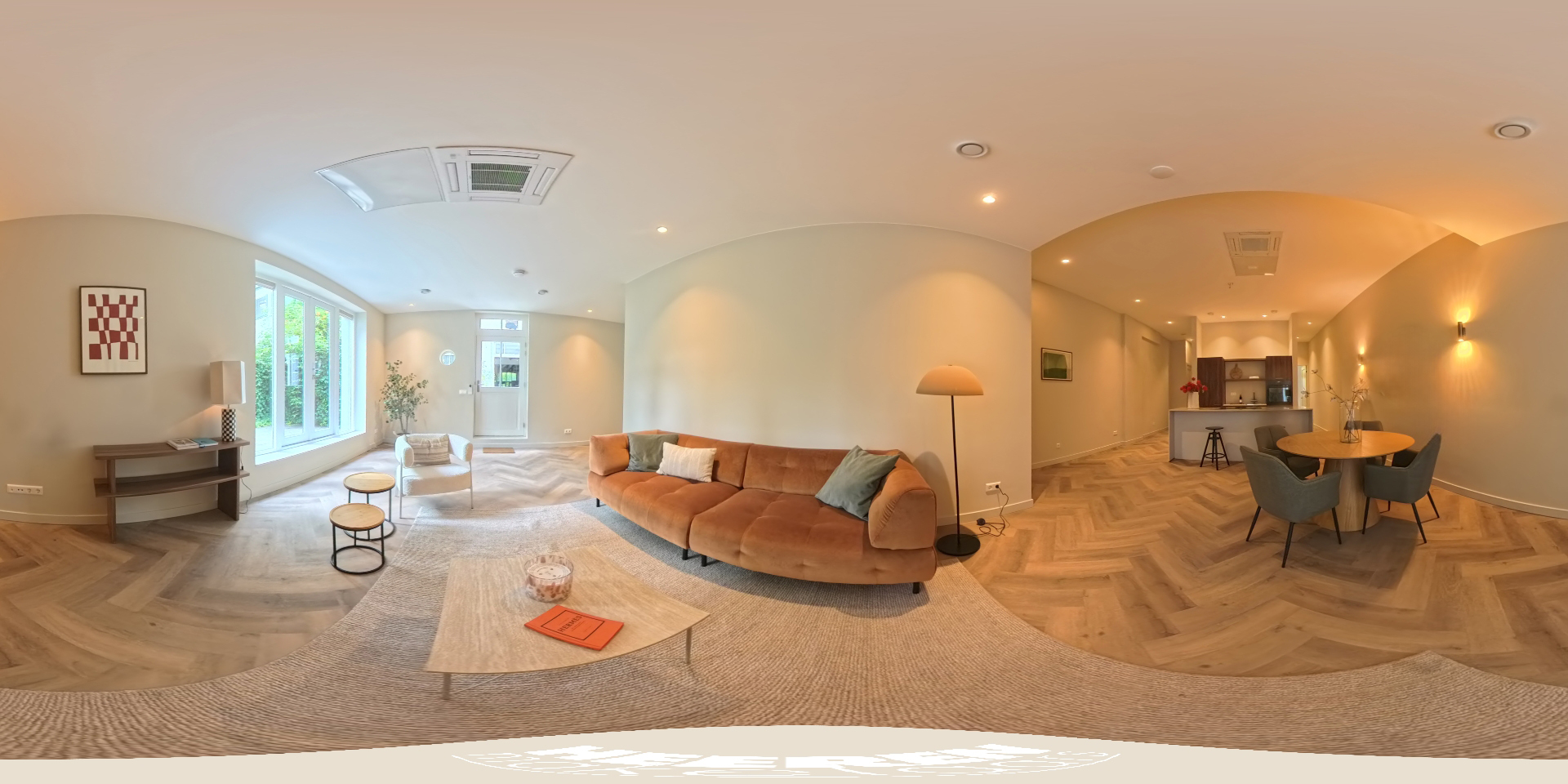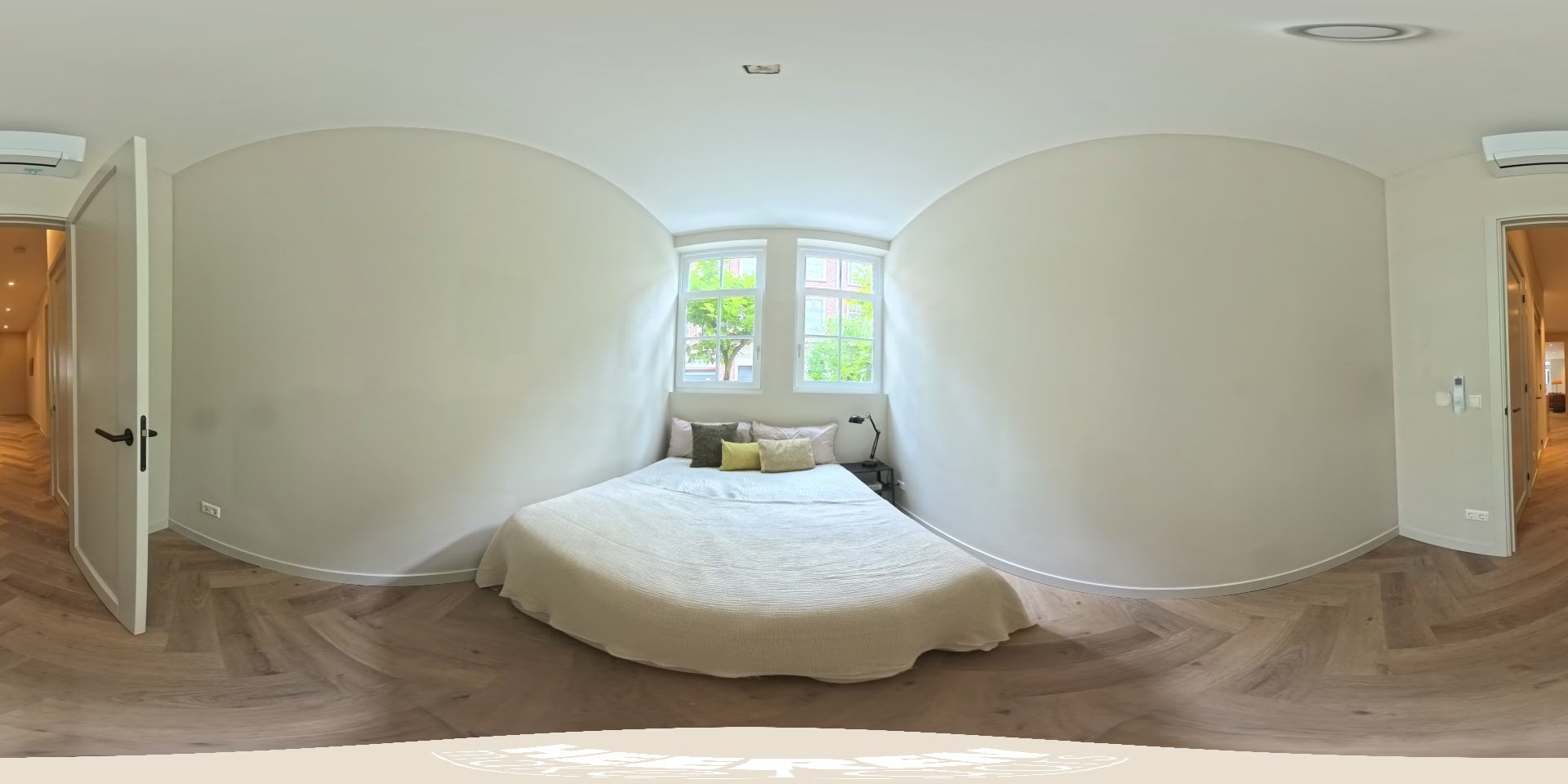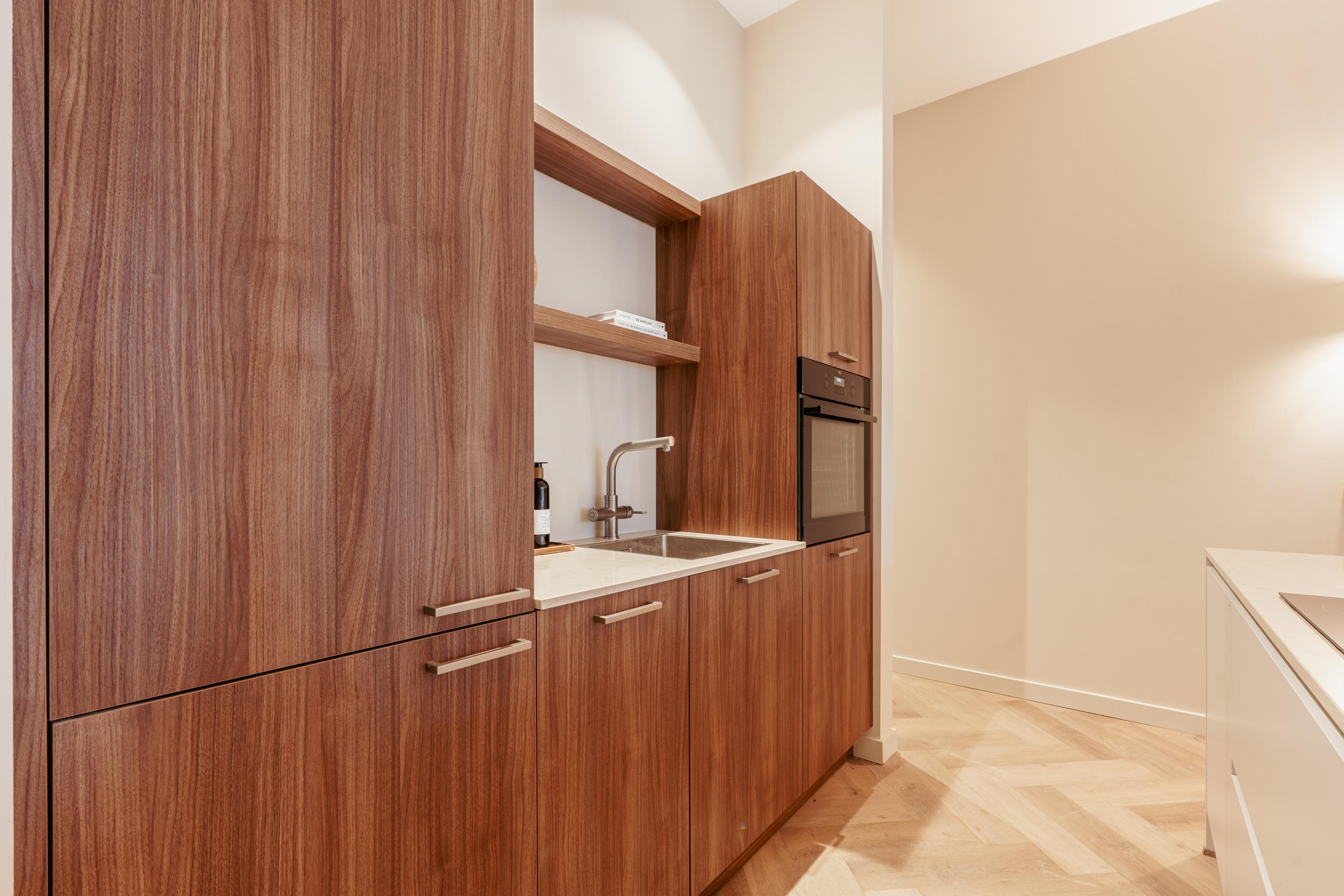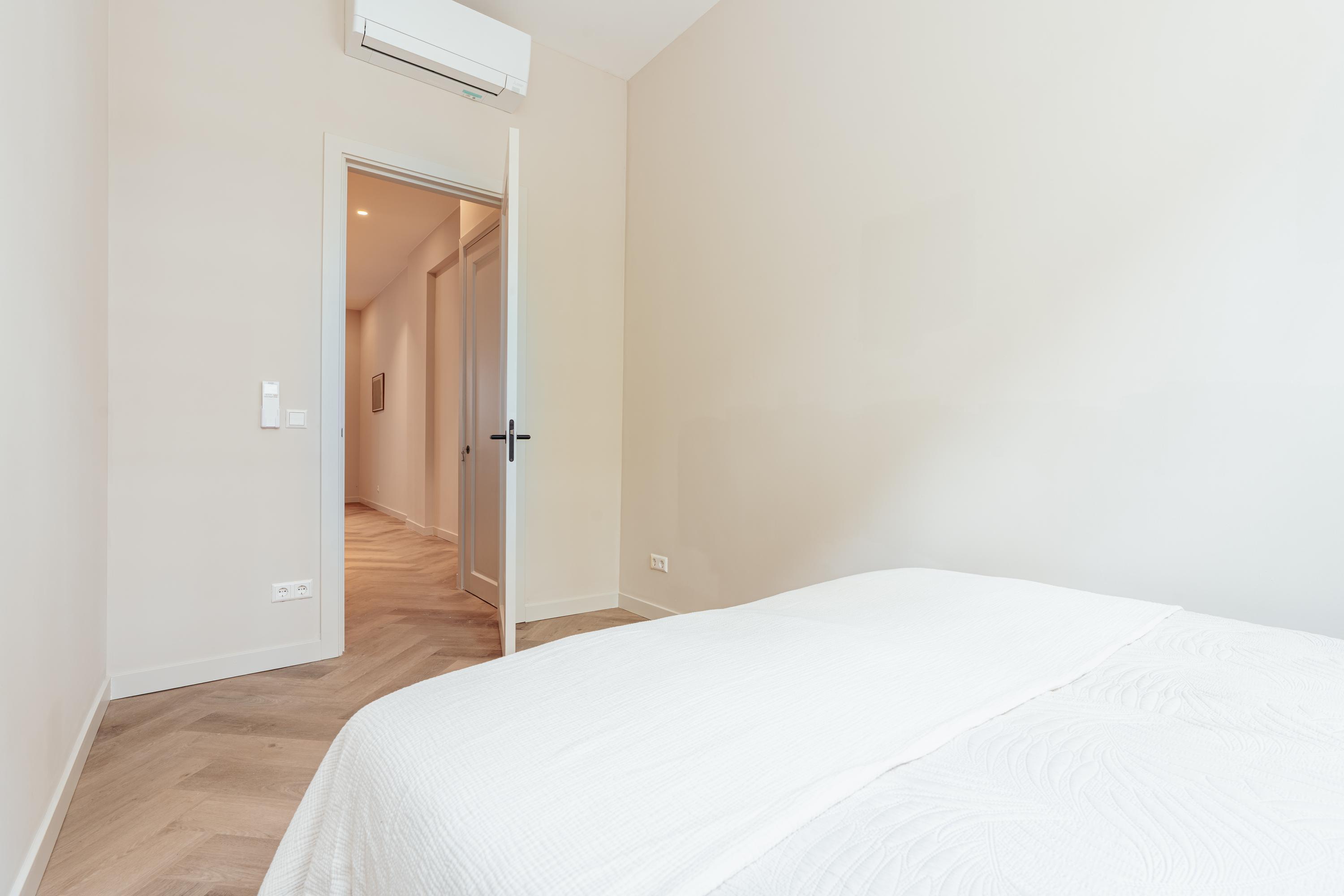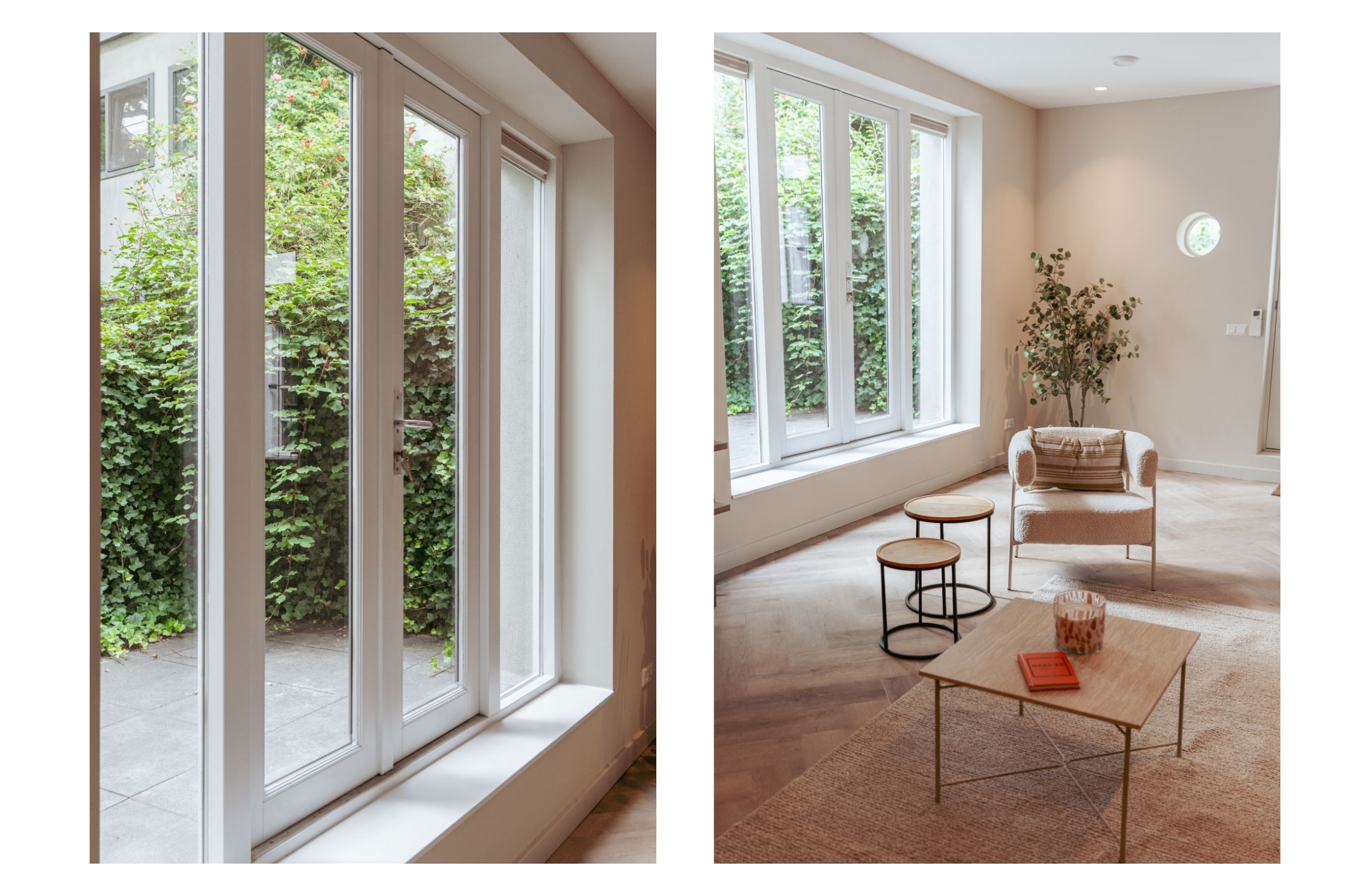 Via a private alleyway, you reach the apartment’s own front door. The entrance hall provides space for a generous coat cupboard. Upon entering, the high ceilings and impressive depth of the property immediately stand out, as well as the double doors leading to the northwest-facing garden—an inviting outdoor area of approximately 12 m², perfect for an afternoon drink in the sun. The home is laid out and finished with a great sense of style and practicality. Think beautiful flooring, sleek plasterwork, and air conditioning. The spacious kitchen-diner is the heart of the home, with an elegant cooking island equipped with all modern built-in appliances. At the front of the apartment are two generous bedrooms, cleverly separated from the living area to offer peace and privacy. Between them lies a stylish bathroom with walk-in shower and second toilet. There is also a separate laundry room and an additional guest toilet. Every detail has been carefully considered, with attention to luxury and comfort.
