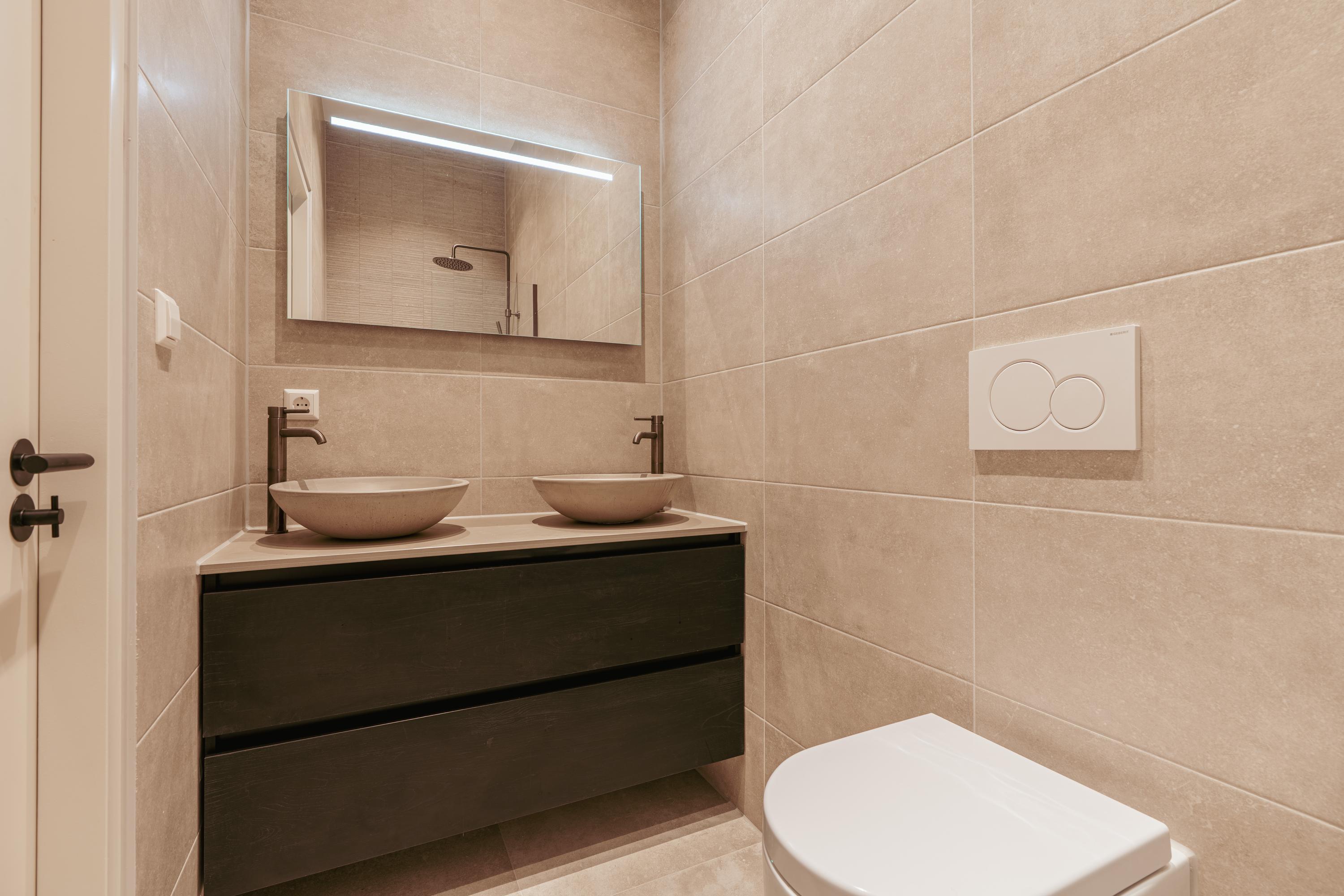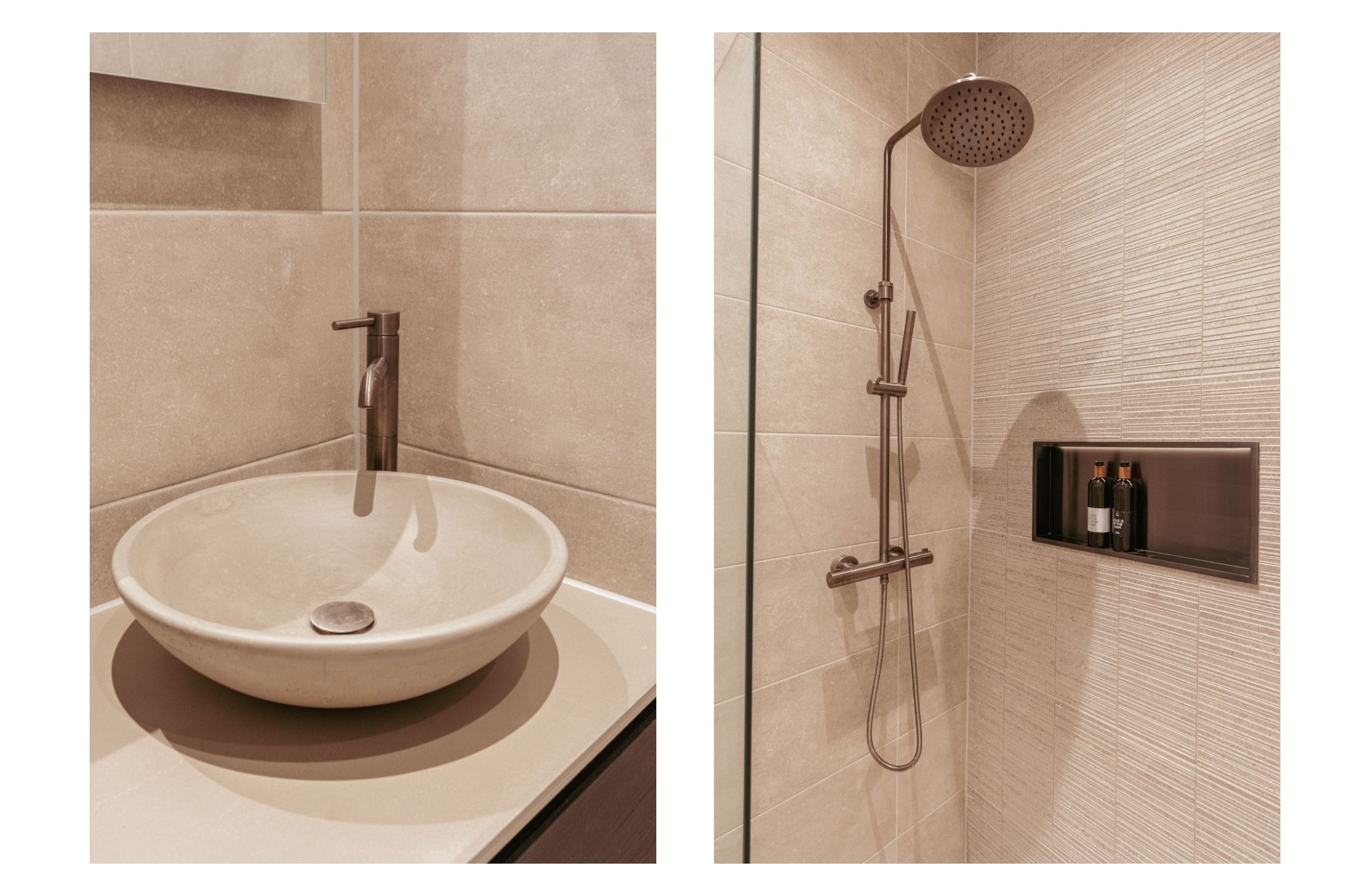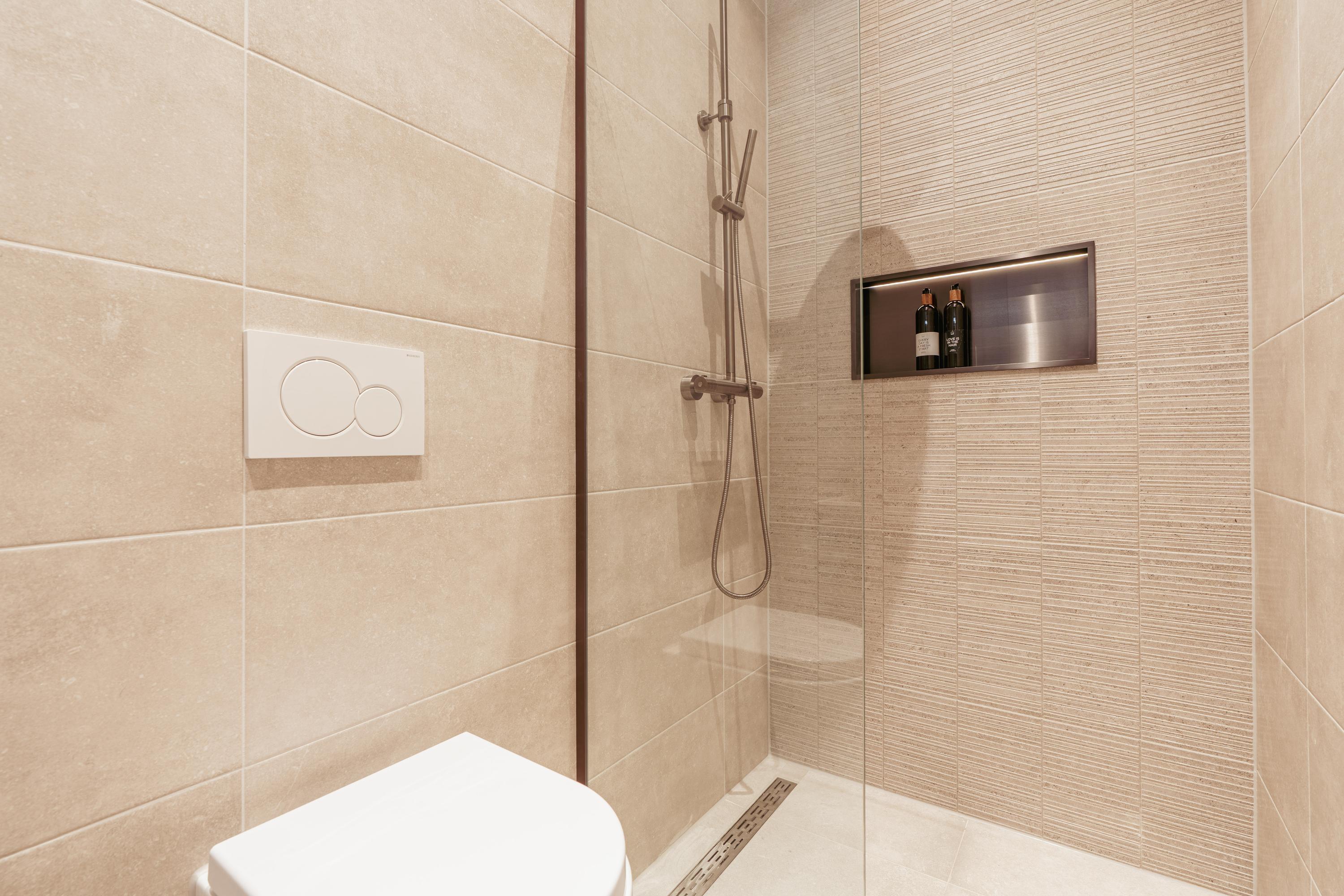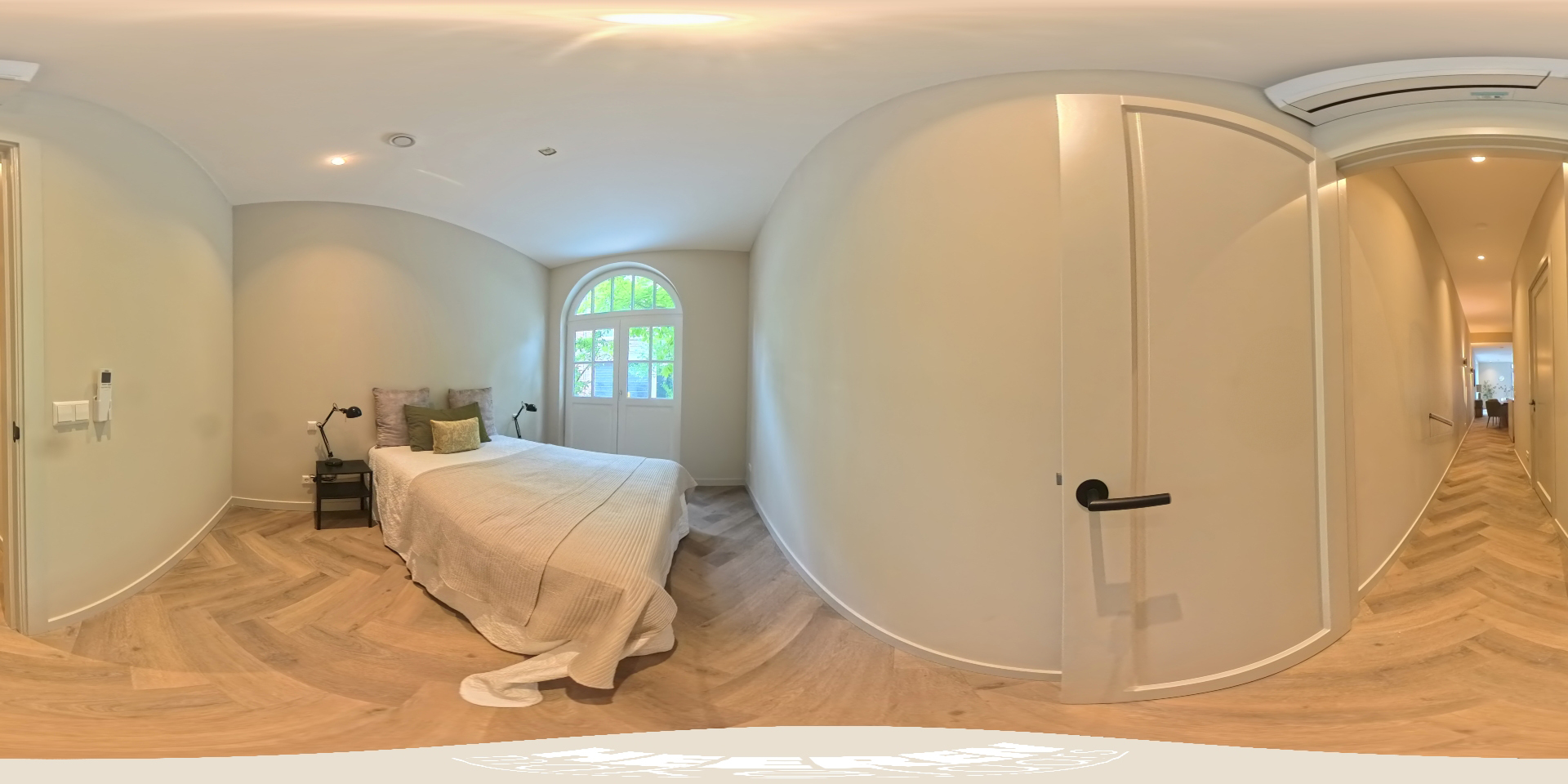 Via a private alleyway, you reach the apartment’s own front door. The entrance hall provides space for a generous coat cupboard. Upon entering, the high ceilings and impressive depth of the property immediately stand out, as well as the double doors leading to the northwest-facing garden—an inviting outdoor area of approximately 12 m², perfect for an afternoon drink in the sun. The home is laid out and finished with a great sense of style and practicality. Think beautiful flooring, sleek plasterwork, and air conditioning. The spacious kitchen-diner is the heart of the home, with an elegant cooking island equipped with all modern built-in appliances. At the front of the apartment are two generous bedrooms, cleverly separated from the living area to offer peace and privacy. Between them lies a stylish bathroom with walk-in shower and second toilet. There is also a separate laundry room and an additional guest toilet. Every detail has been carefully considered, with attention to luxury and comfort.