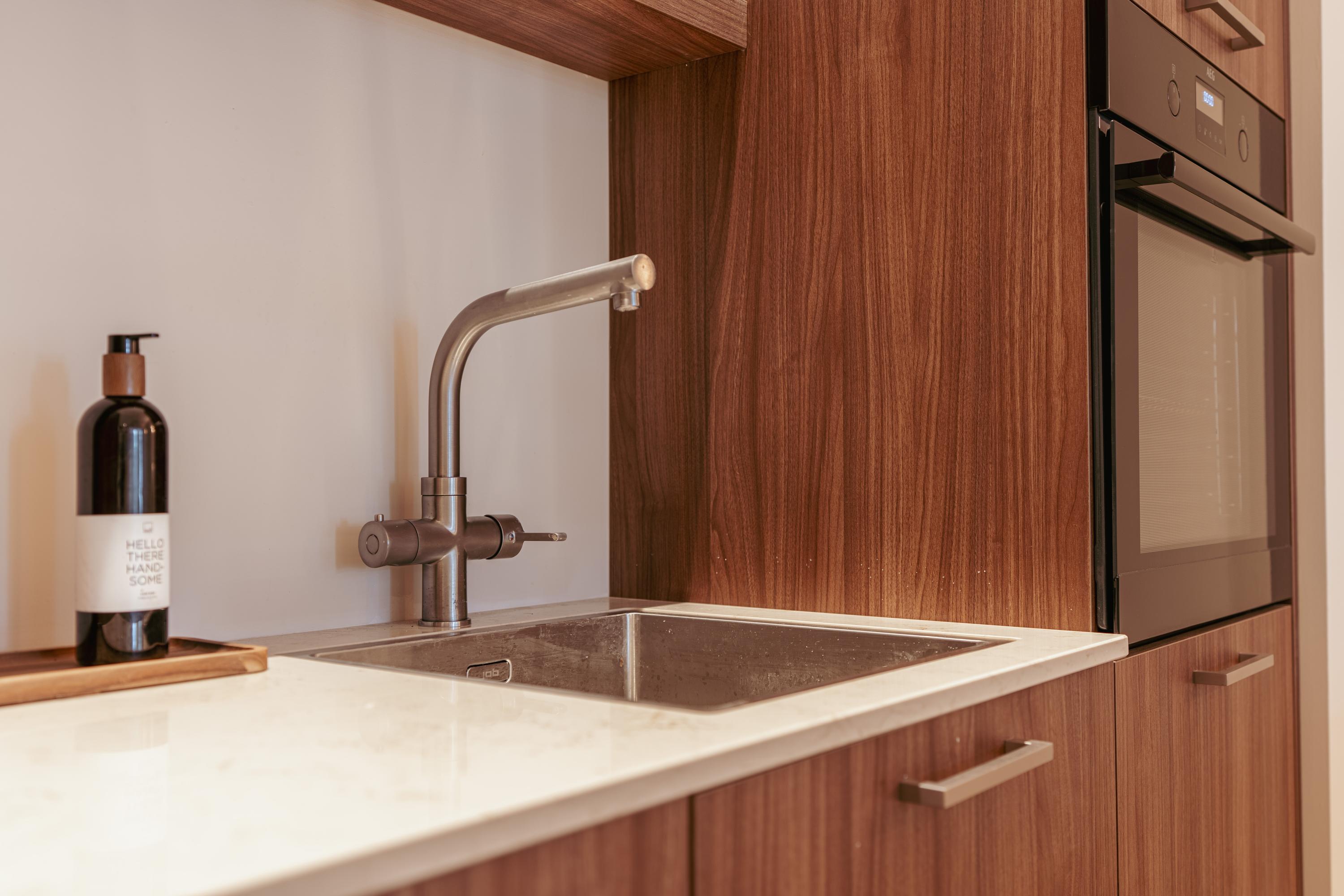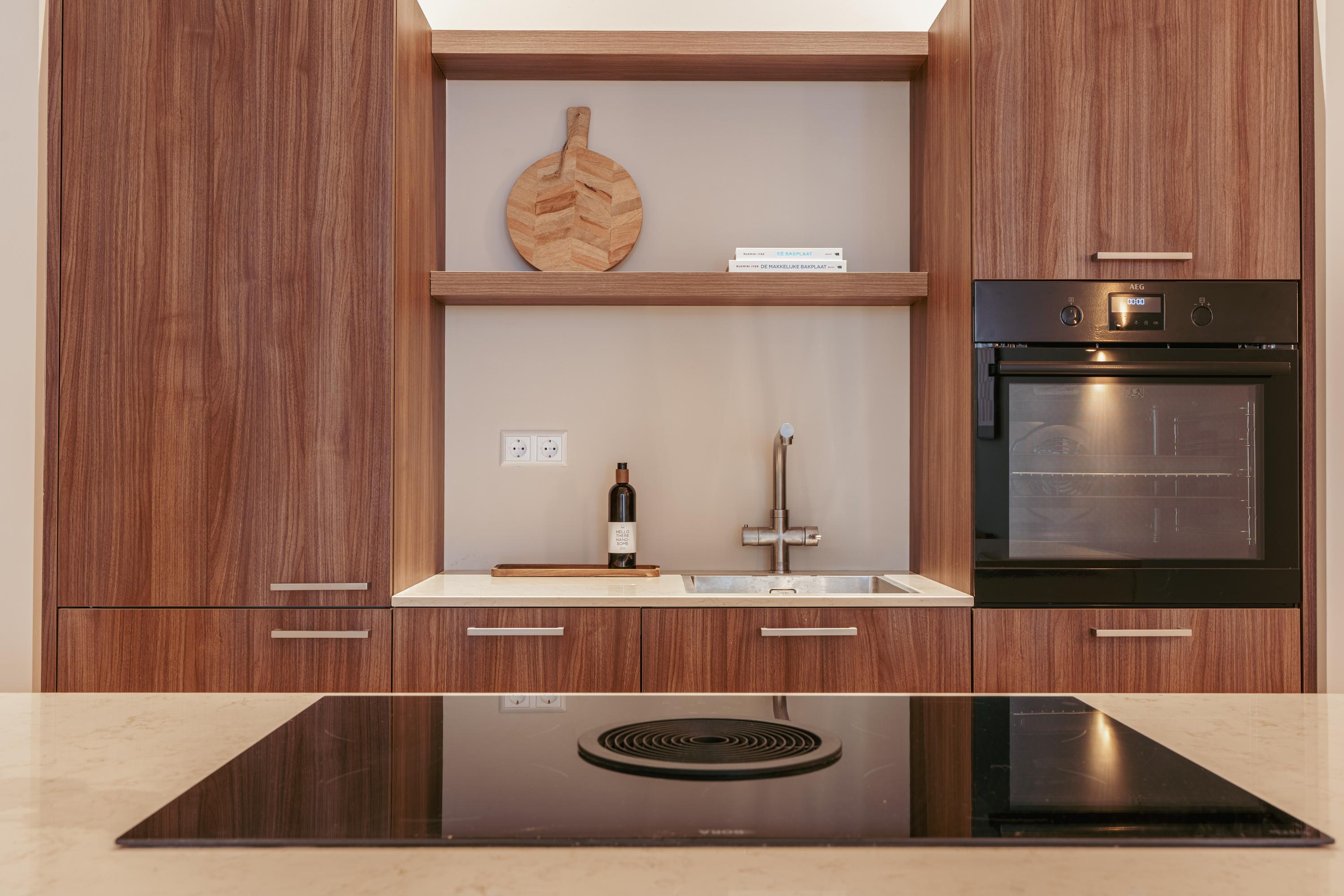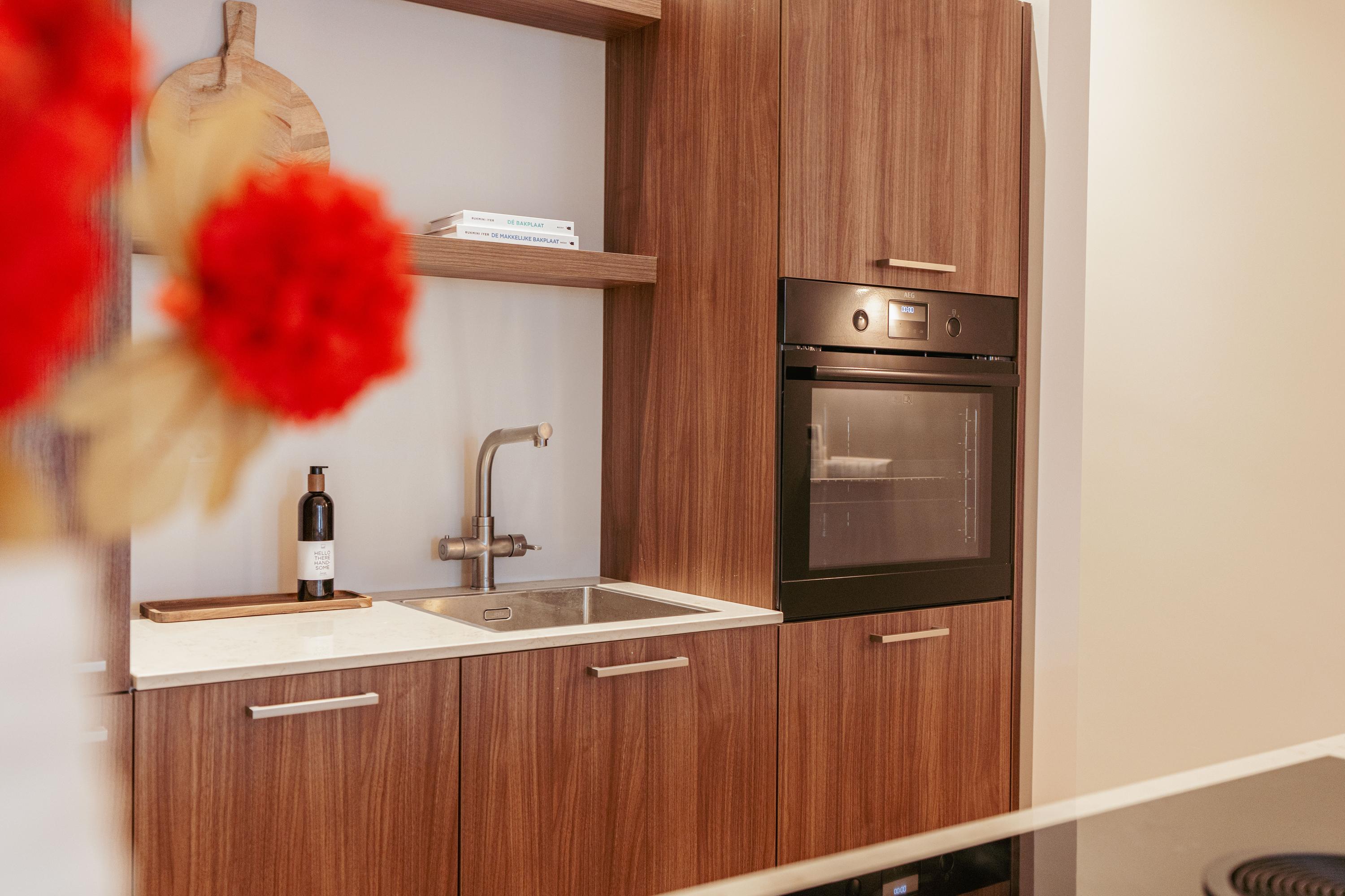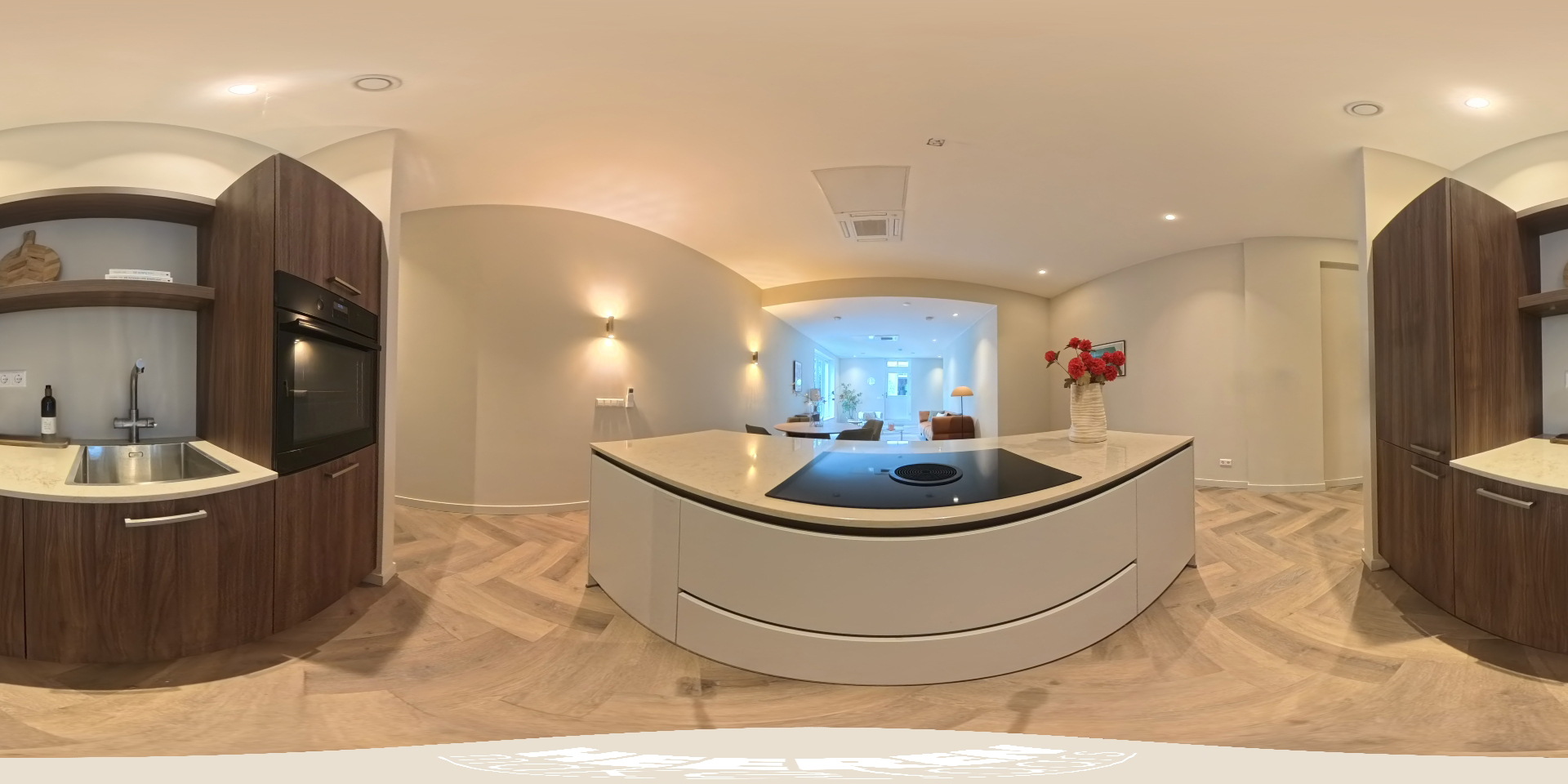 Via a private alleyway, you reach the apartment’s own front door. The entrance hall provides space for a generous coat cupboard. Upon entering, the high ceilings and impressive depth of the property immediately stand out, as well as the double doors leading to the northwest-facing garden—an inviting outdoor area of approximately 12 m², perfect for an afternoon drink in the sun. The home is laid out and finished with a great sense of style and practicality. Think beautiful flooring, sleek plasterwork, and air conditioning. The spacious kitchen-diner is the heart of the home, with an elegant cooking island equipped with all modern built-in appliances. At the front of the apartment are two generous bedrooms, cleverly separated from the living area to offer peace and privacy. Between them lies a stylish bathroom with walk-in shower and second toilet. There is also a separate laundry room and an additional guest toilet. Every detail has been carefully considered, with attention to luxury and comfort.