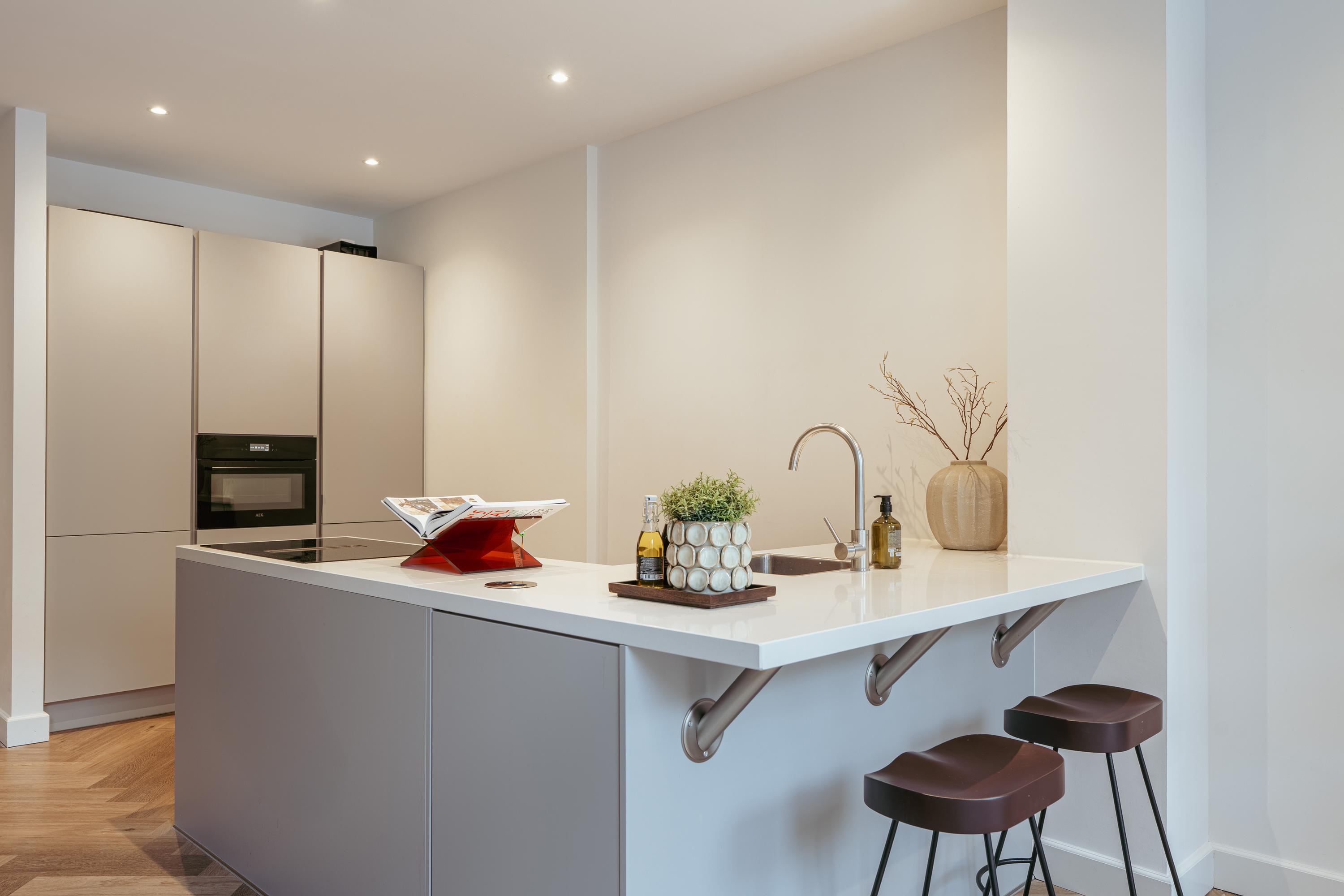 The property is accessed via a private entrance from the street. The entrance hall features a separate toilet with washbasin and a meter cupboard, and provides access to the main living area. The spacious and inviting living room extends across the full depth of the apartment and offers a comfortable layout with a natural division between the sitting and dining areas. Centrally positioned within the home is the recently renovated open-plan kitchen, finished in a modern design and equipped with all contemporary conveniences. These include a built-in induction hob with integrated extractor, dishwasher, oven, fridge/freezer combination, and a practical bar area with fixed seating for three—ideal for informal dining or entertaining. Adjacent to the dining area, sliding doors open onto the rear garden of approximately 65 m². This generous outdoor space is low-maintenance and offers ample room for a dining table, lounge area, and barbecue. A wonderful place to enjoy peace and privacy outdoors, right in the heart of the city.