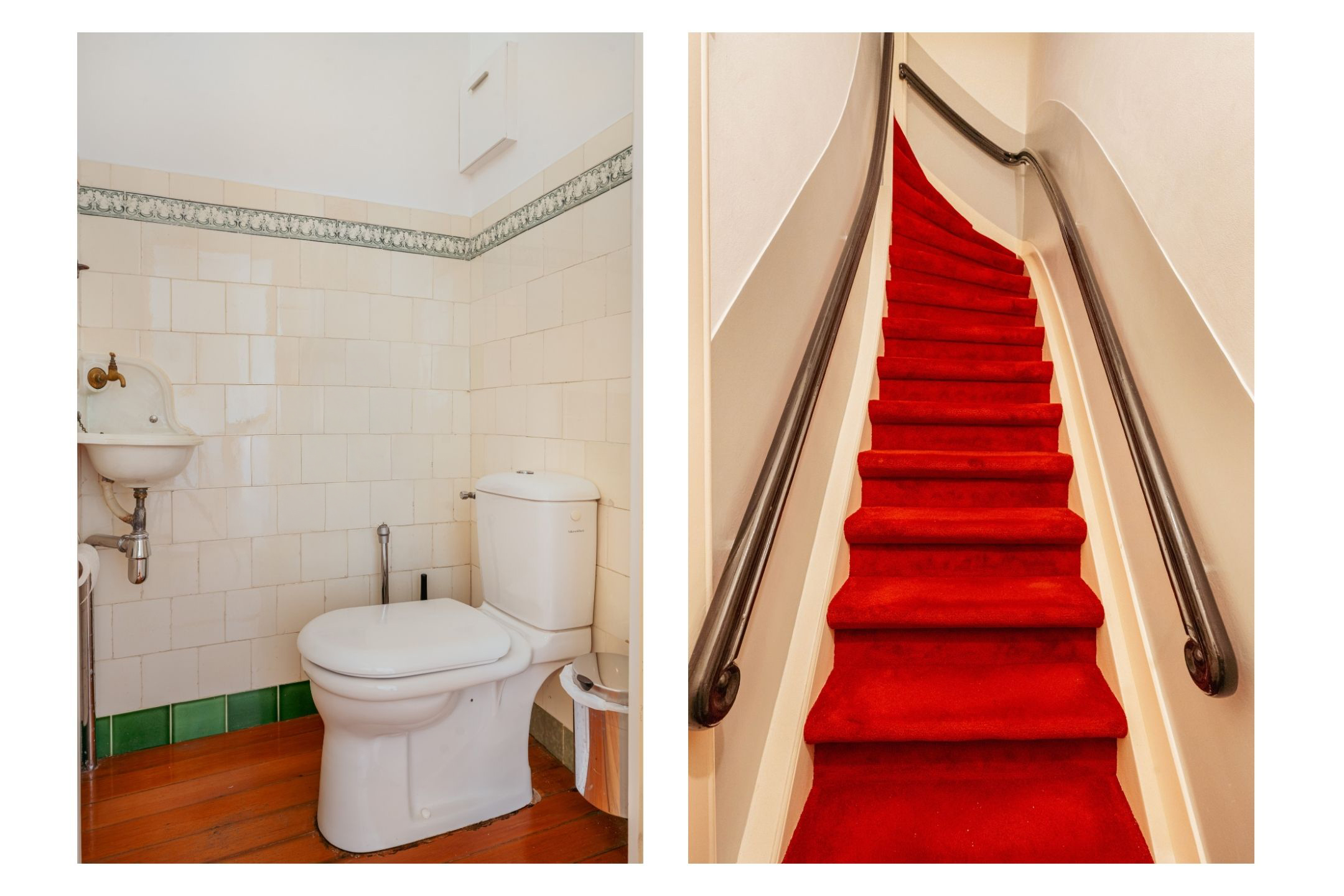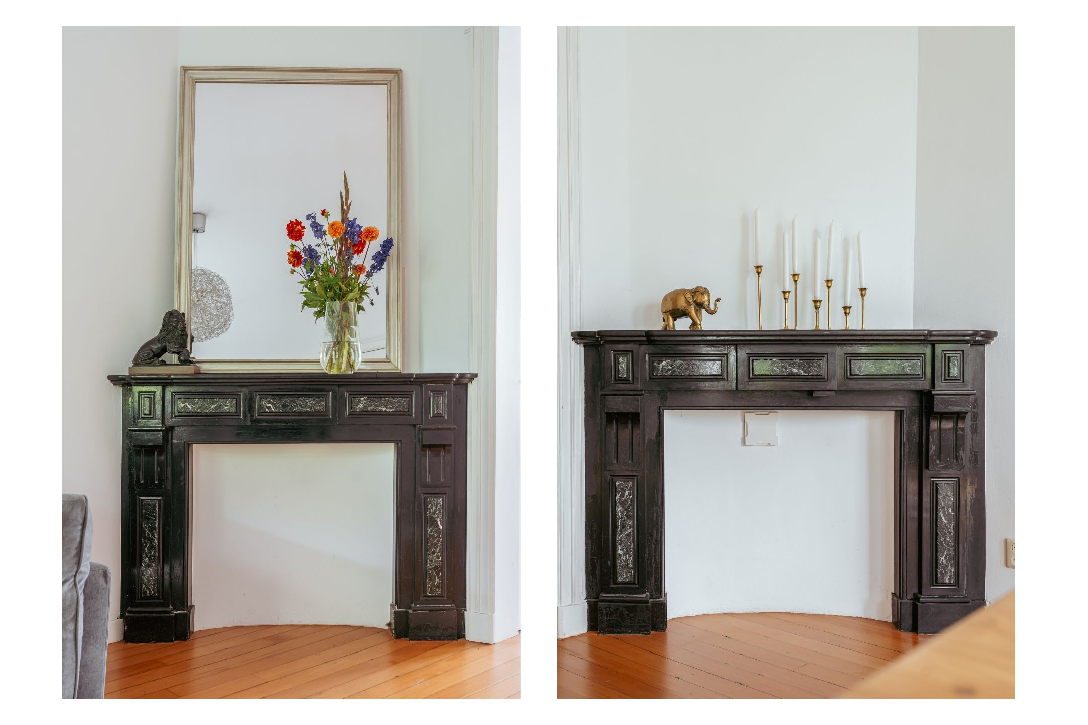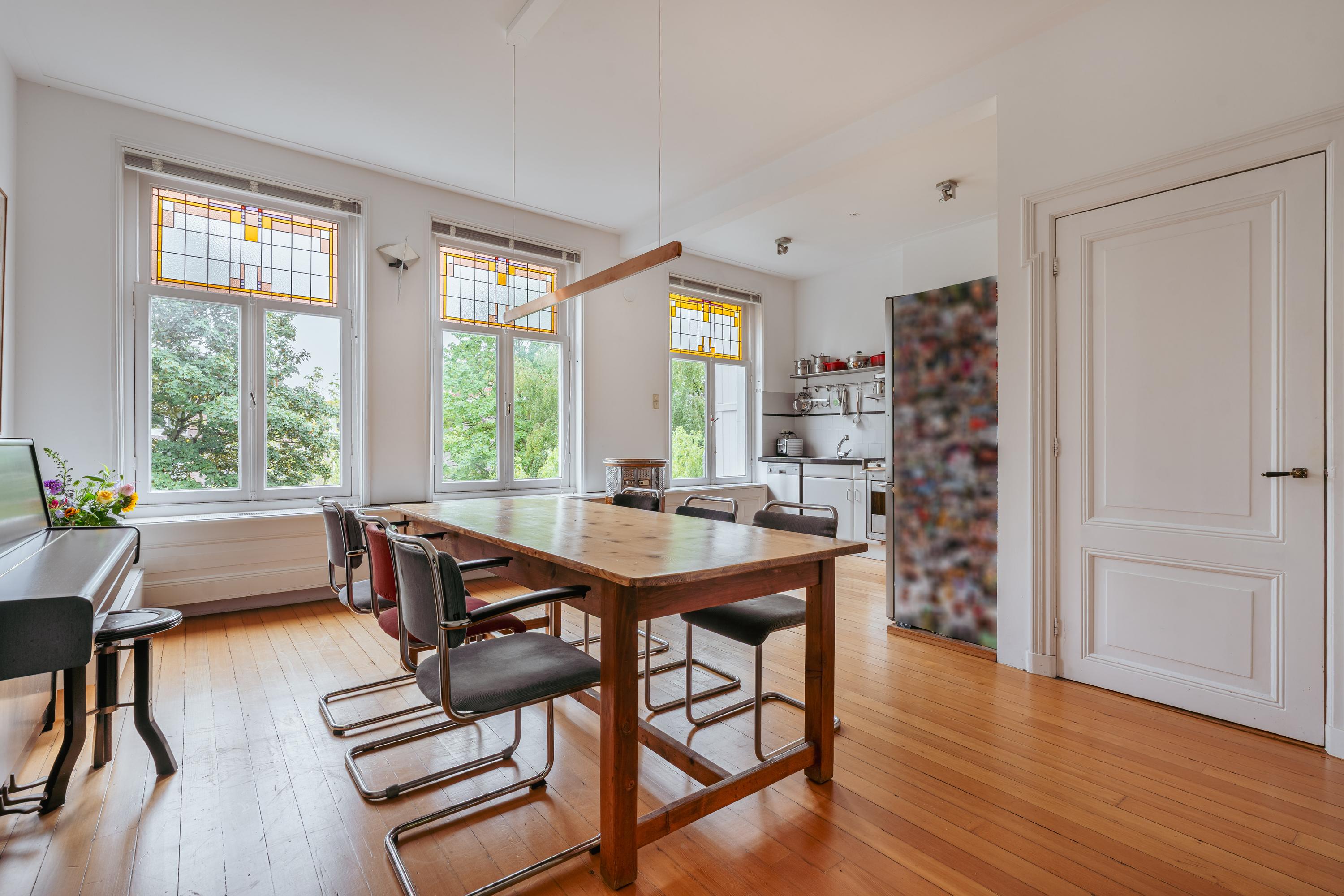 This entire floor is characterized by high ceilings, wooden flooring, and large windows with stained-glass details. At the front, the living room spans the full width of the house and overlooks the green of the Sarphatipark. The abundance of natural light and the generous layout give this space a calm and inviting feel.