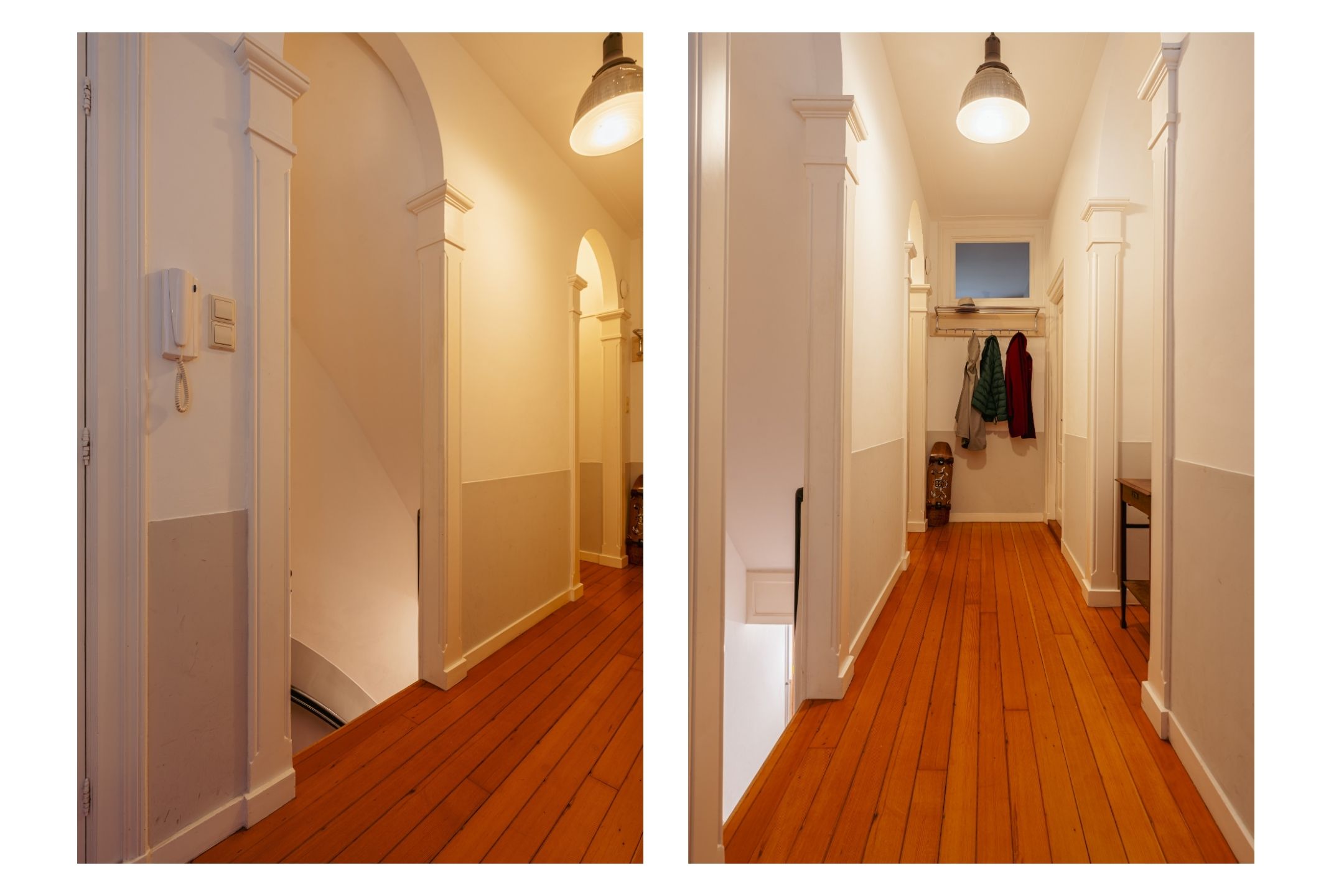 The property has a stately entrance with double wooden front doors and distinctive architectural details. The well-maintained shared hallway and staircase lead to the second floor, where the private entrance to the apartment is located.