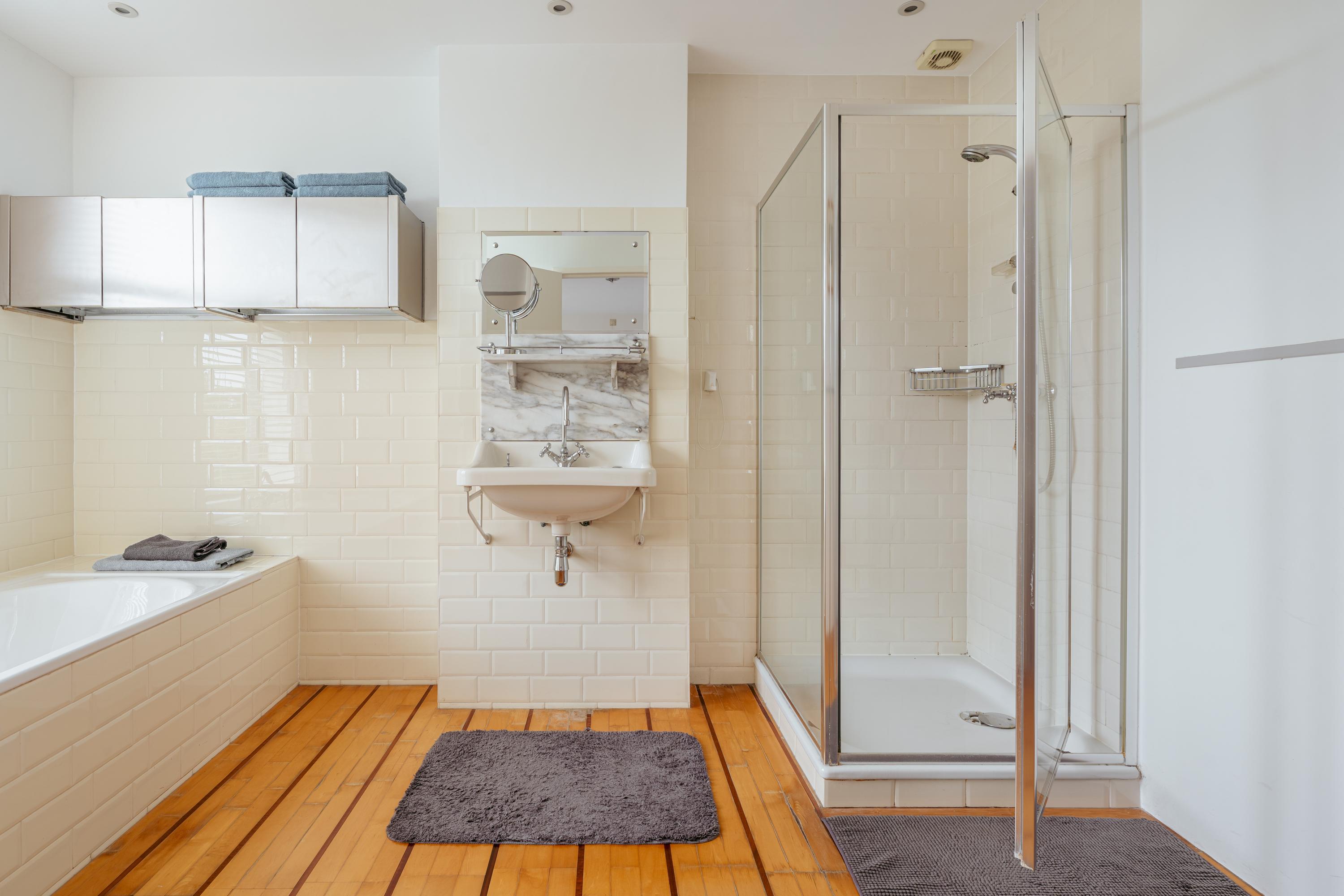 At the rear is the spacious master bedroom, filled with natural light thanks to the large windows and with direct access to the bathroom. The bathroom is modern and well equipped with a bathtub, separate shower, washbasin, and ample built-in storage. The separate toilet is accessible both from the bathroom and from the landing.
