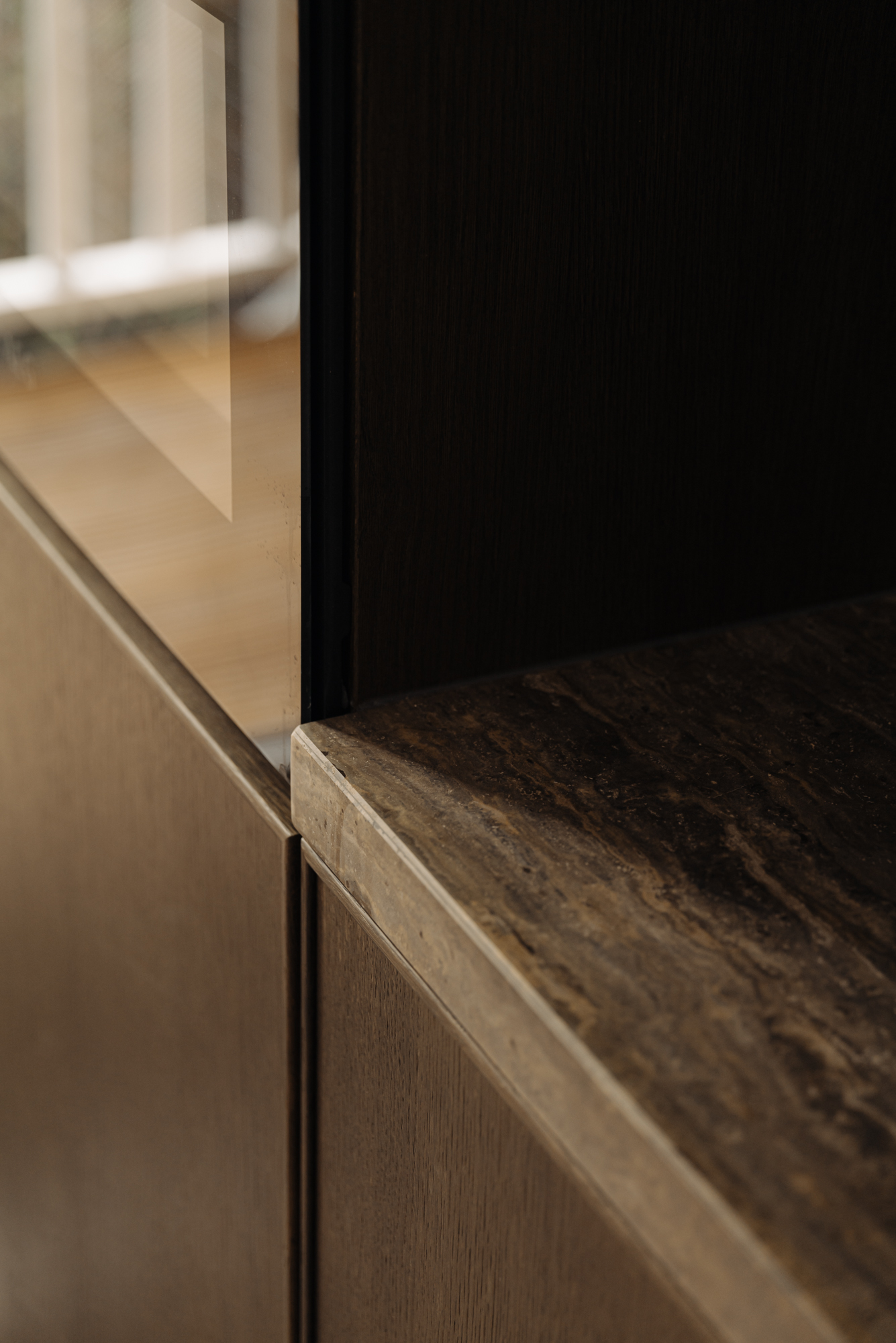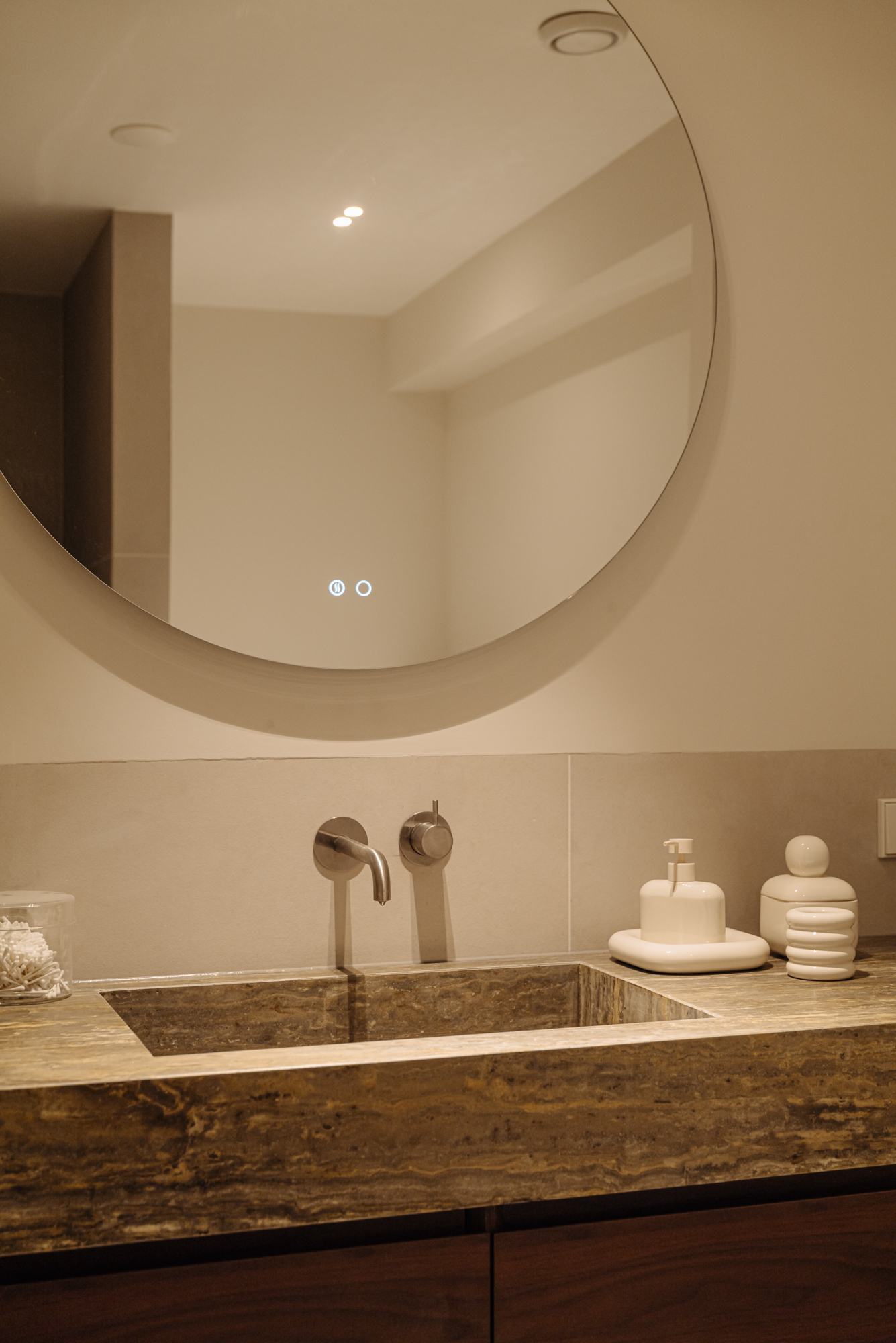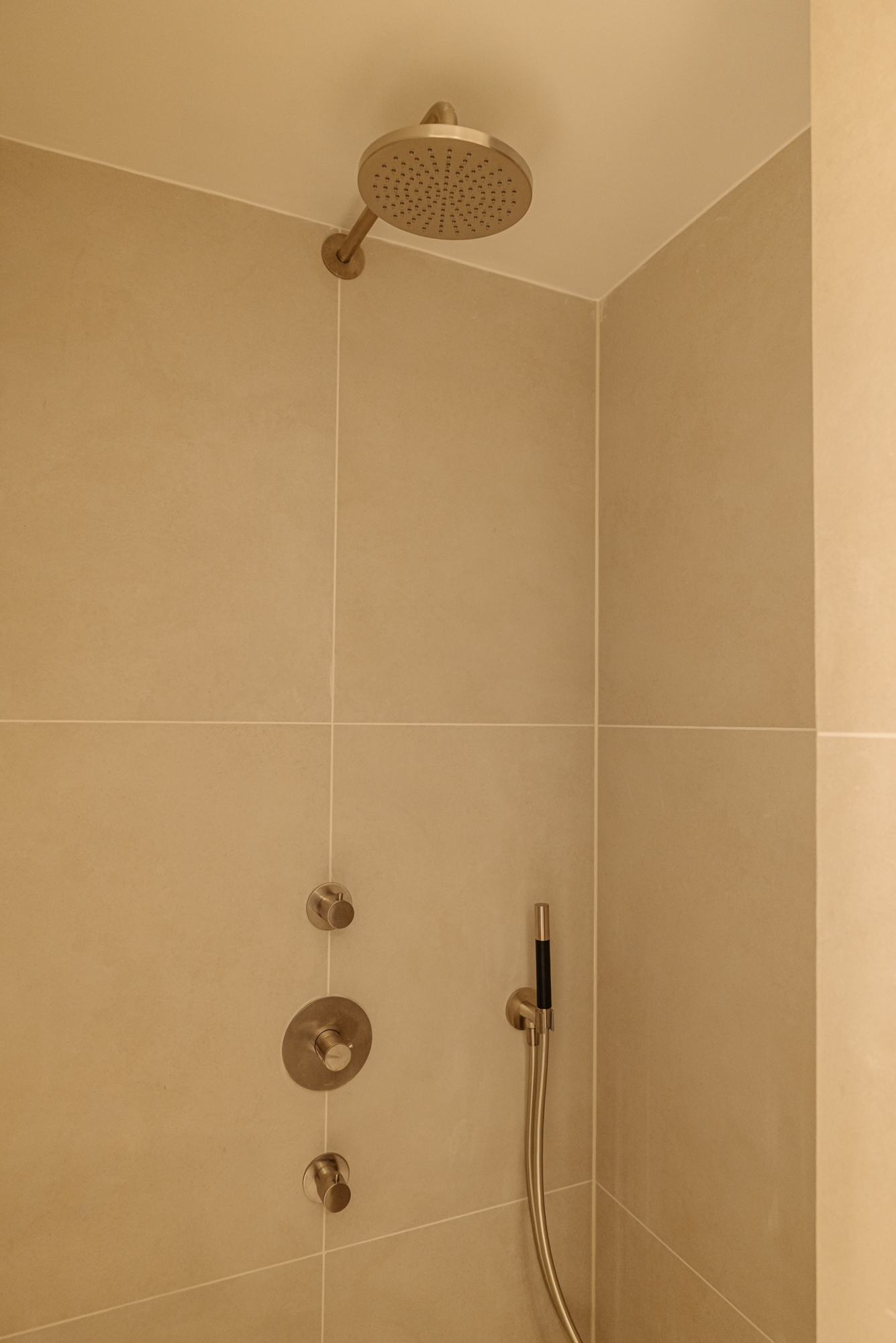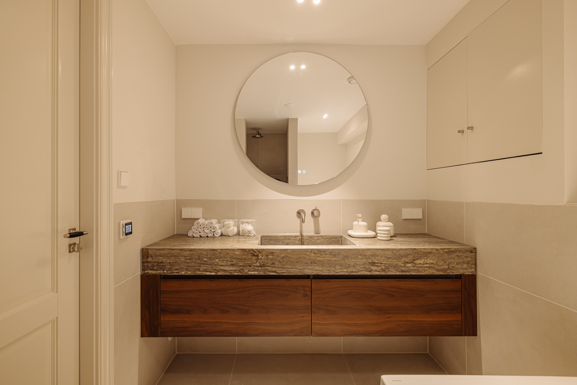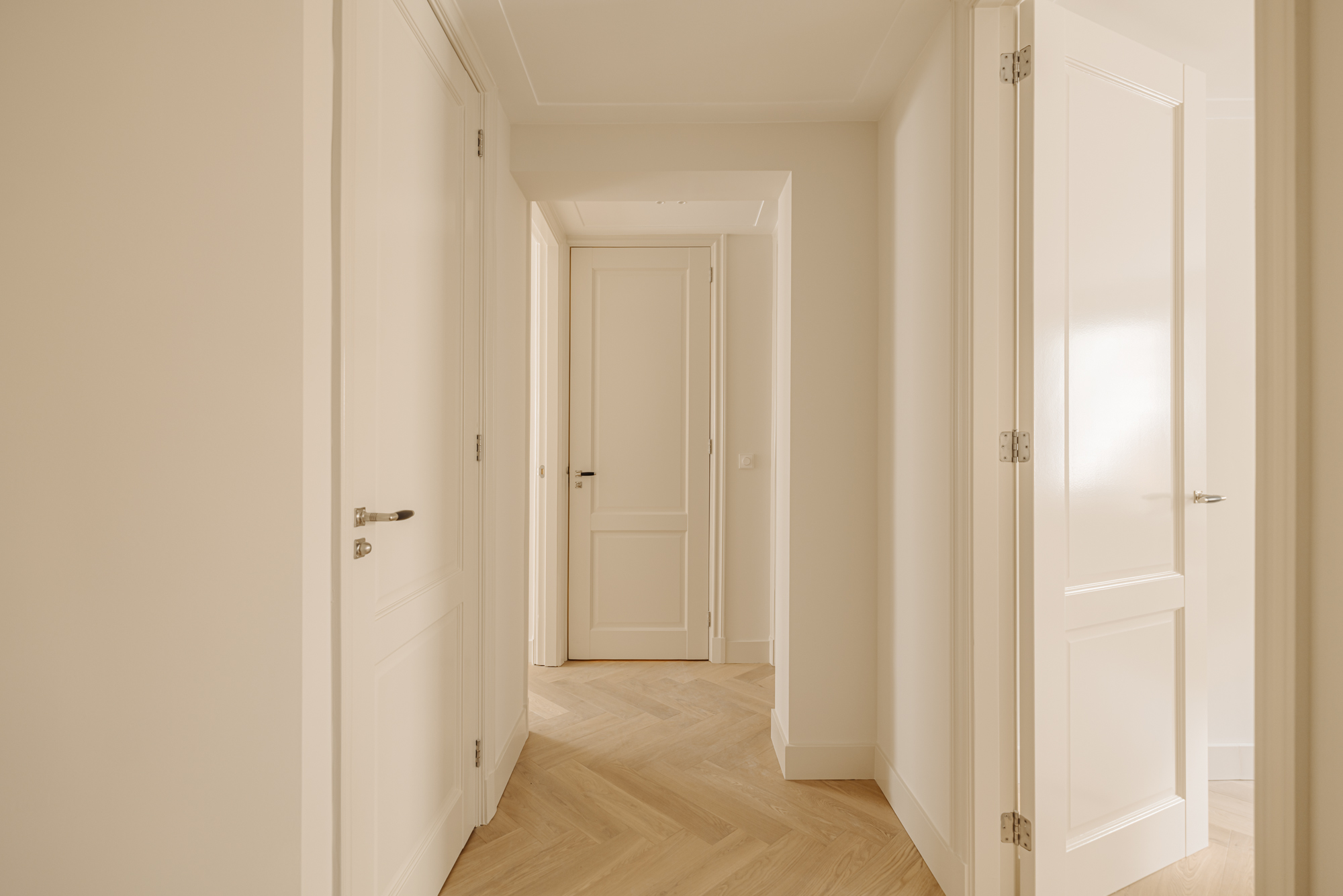 Upon entering, you'll step directly into the spacious living room located at the front. At the rear, you'll find a modern open kitchen with a central island and access to a wide west-facing balcony (approx. 9 m²), overlooking the beautifully landscaped garden of approx. 34 m², accessible via stairs from the balcony. The kitchen is finished with high-end materials and includes a 4-zone induction hob with integrated extractor, two combi ovens, a dishwasher, a fridge-freezer, a wine climate cabinet, and a Quooker. The island also features a cozy breakfast bar. Centrally located is a separate toilet with washbasin and the staircase leading down to the lower level.