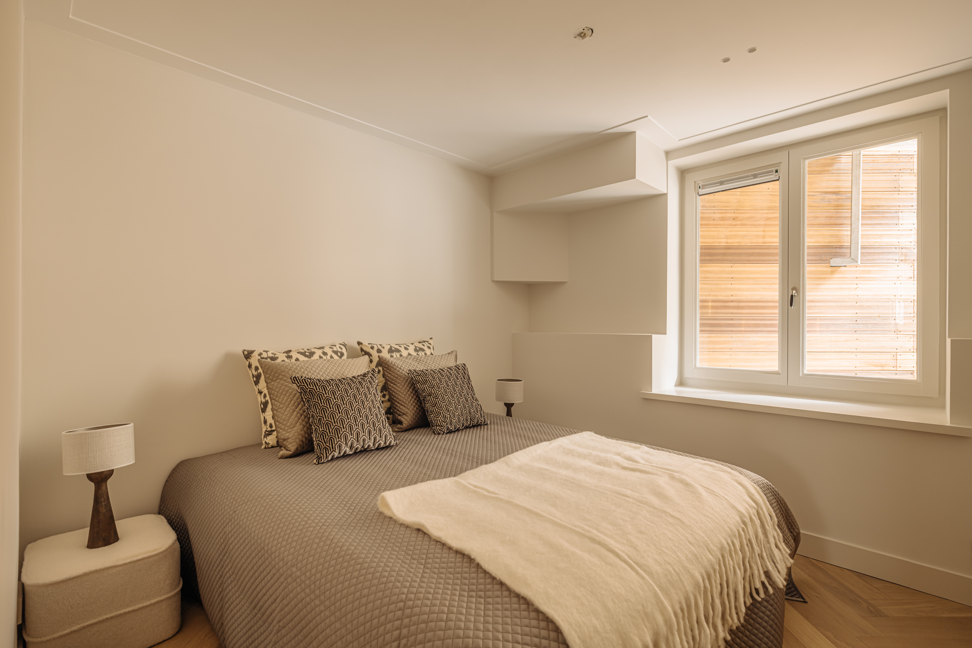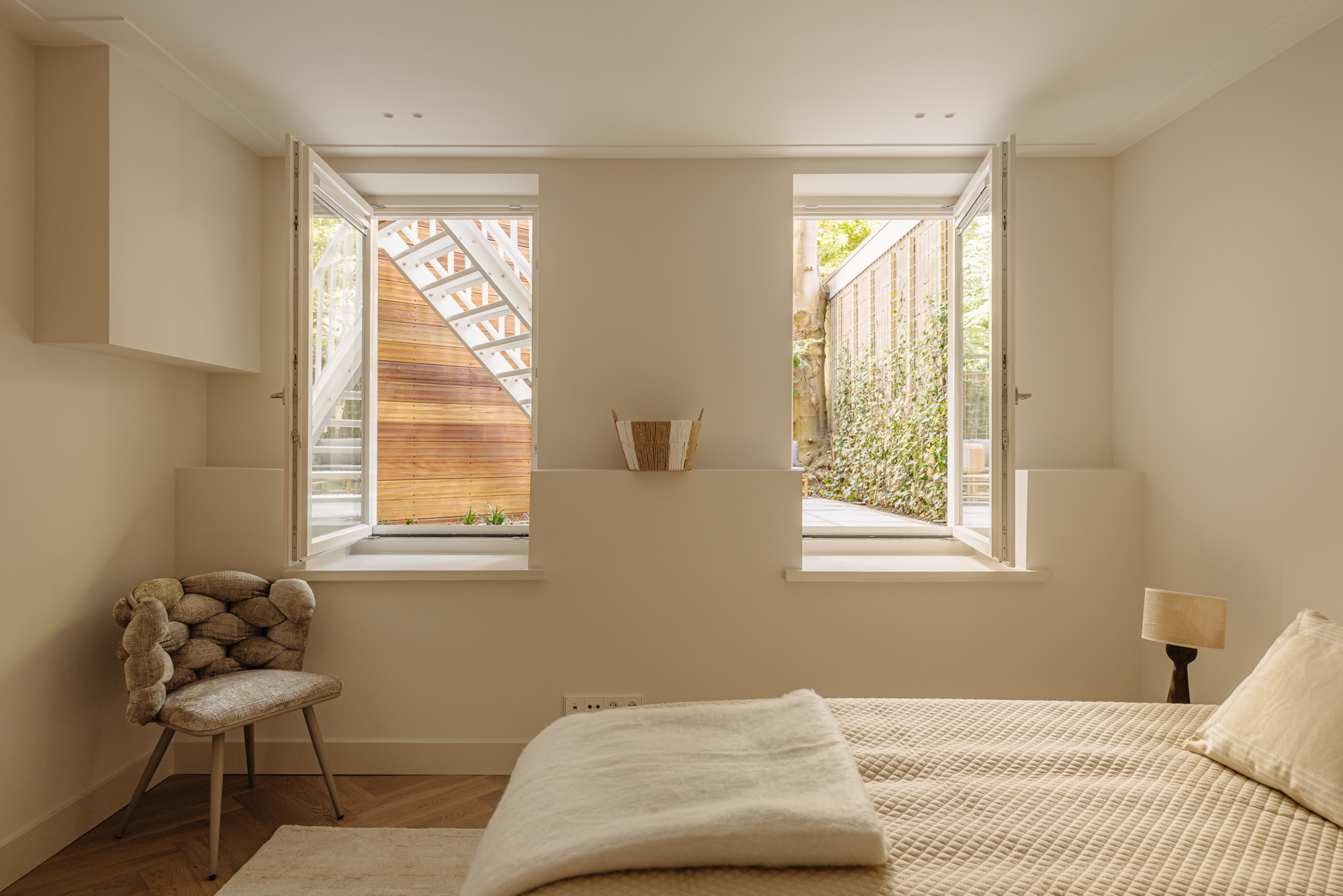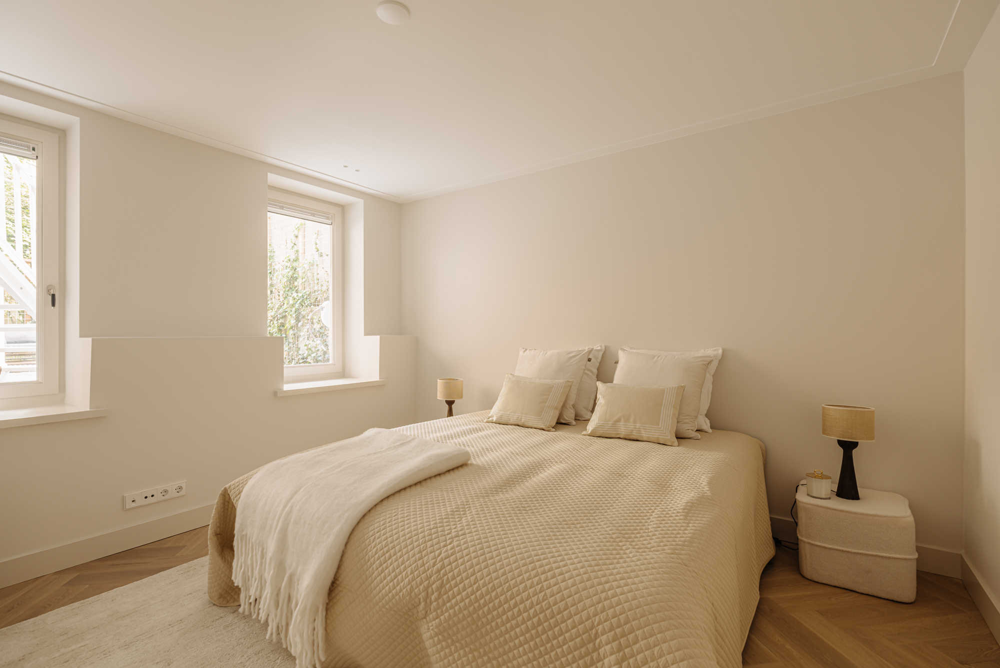 A spacious hallway provides access to all rooms on this level. At the front are two bedrooms, both with frosted windows for added privacy. At the rear are the third and fourth bedrooms, featuring large windows and views of the garden. Centrally located is a second toilet and the modern bathroom, complete with a large bathtub, walk-in shower, and a washbasin with a marble vanity unit.