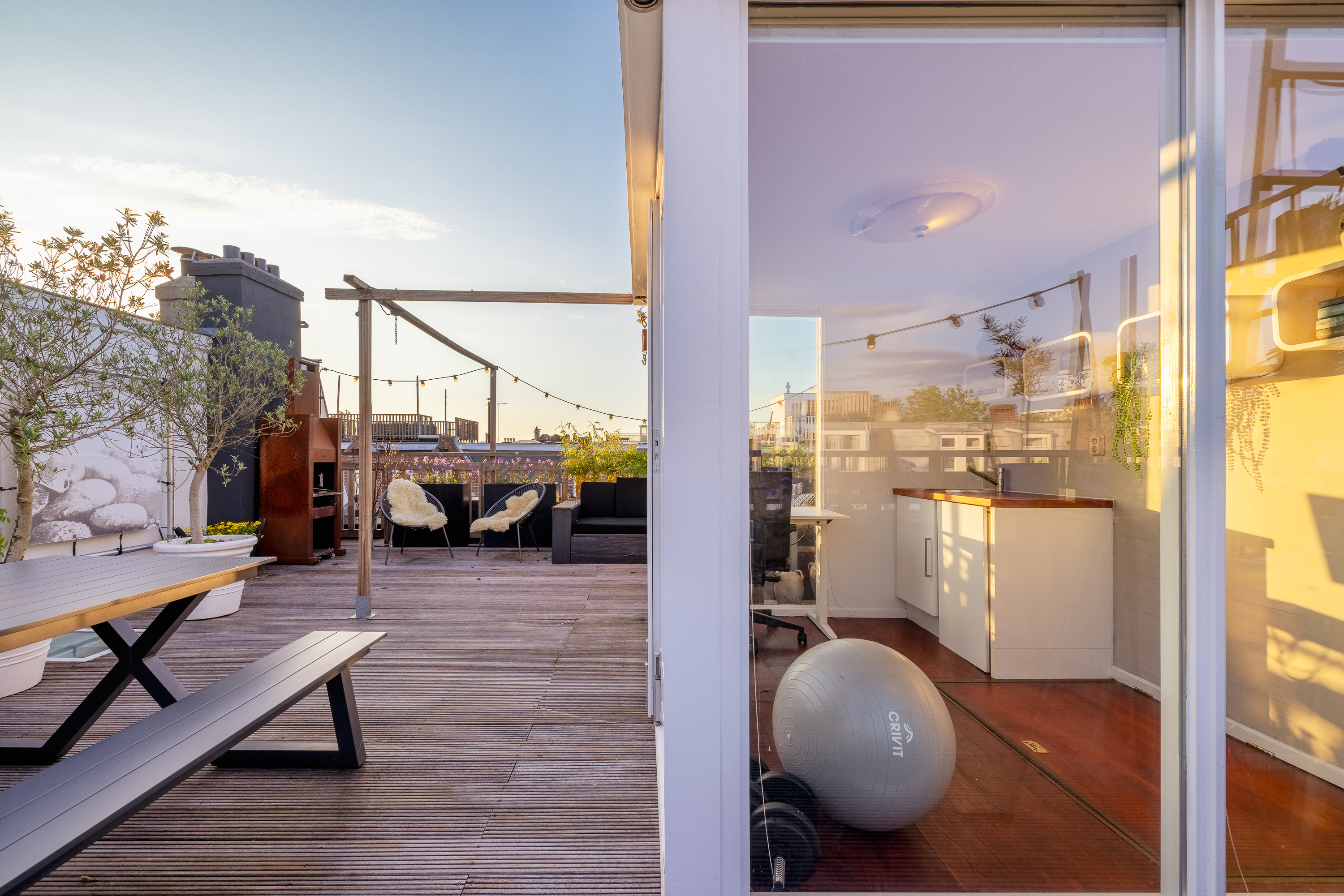 Here you get access to the very spacious, cozy, and beautifully finished roof terrace. On this floor, you also have a sink and cooling at your disposal. It is also convenient that the access to the roof house can be closed off, creating a nice space of about 6m². In short, enough space to create a home gym, for example for practicing yoga, or a wonderful home office.
