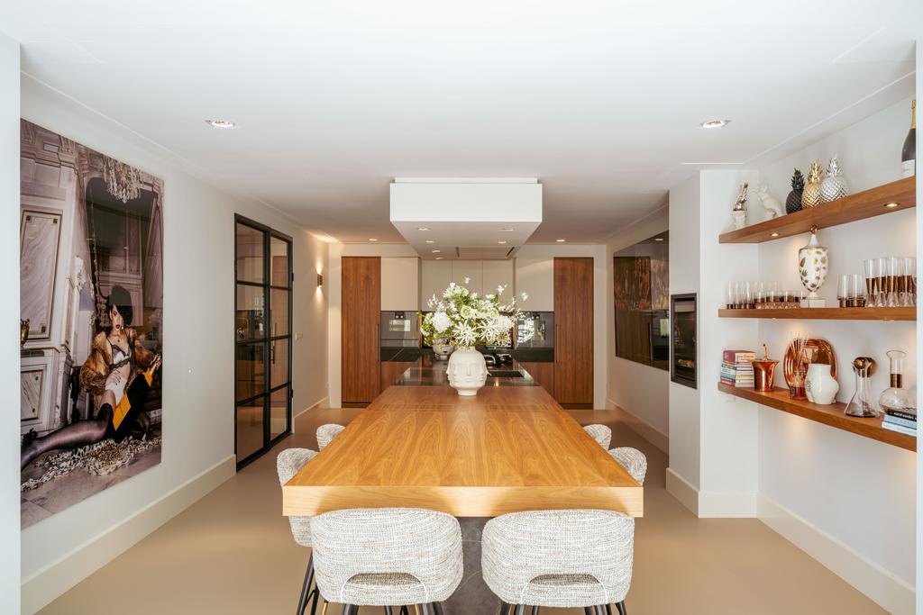 To the front is a bedroom with an en-suite bathroom featuring a washbasin and walk-in shower—currently used as a home gym, but easily repurposed. At the rear is the stunning open-plan kitchen, the centerpiece of this level. Outfitted with Gaggenau appliances, including a fridge, freezer, Quooker, five-burner gas stove integrated into the counter, oven, steam oven, dishwasher, and wine fridge, the kitchen combines luxury and functionality. A solid natural stone countertop with a wooden breakfast bar provides a warm, refined look.