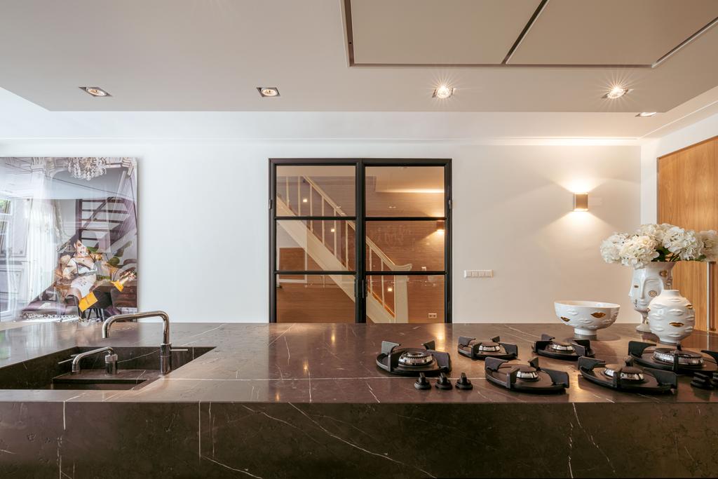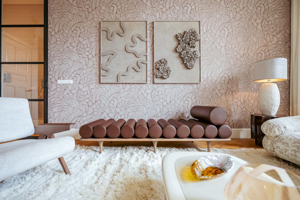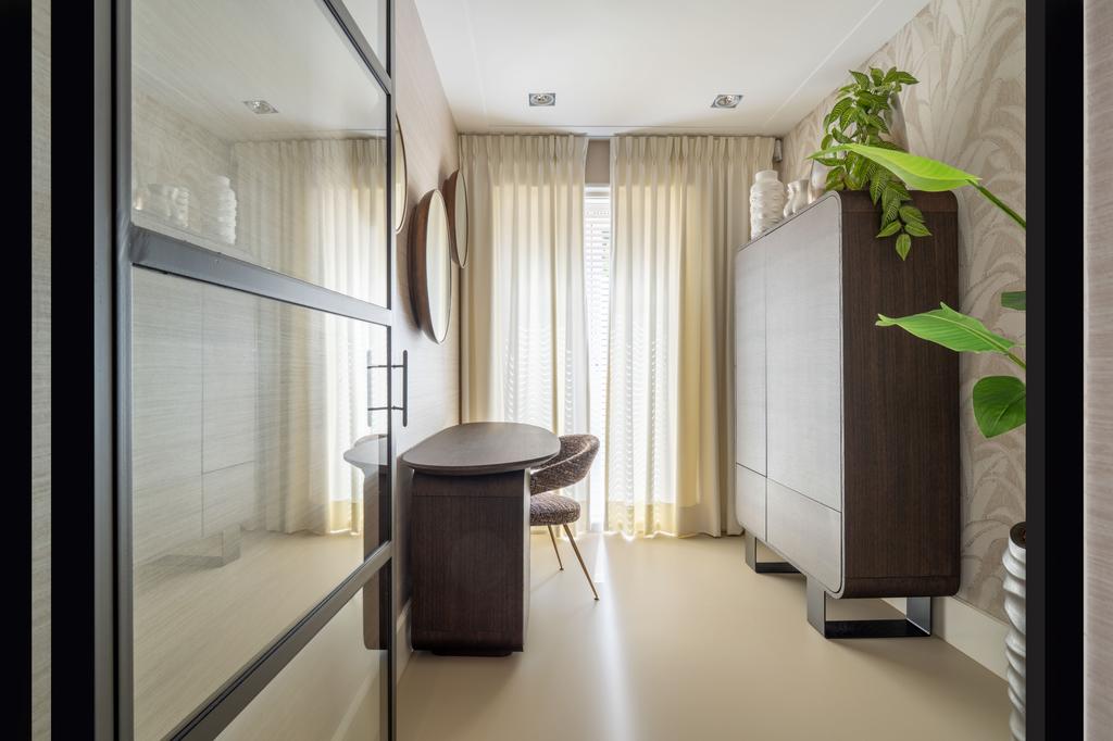 Adjacent to the dining room is a versatile room, perfect as a guest bedroom or home office. The entire floor boasts premium finishes with elegant wallpaper, enhancing its warmth and character. Large windows on both sides ensure exceptional natural light and emphasize the floor’s sense of space and luxury.