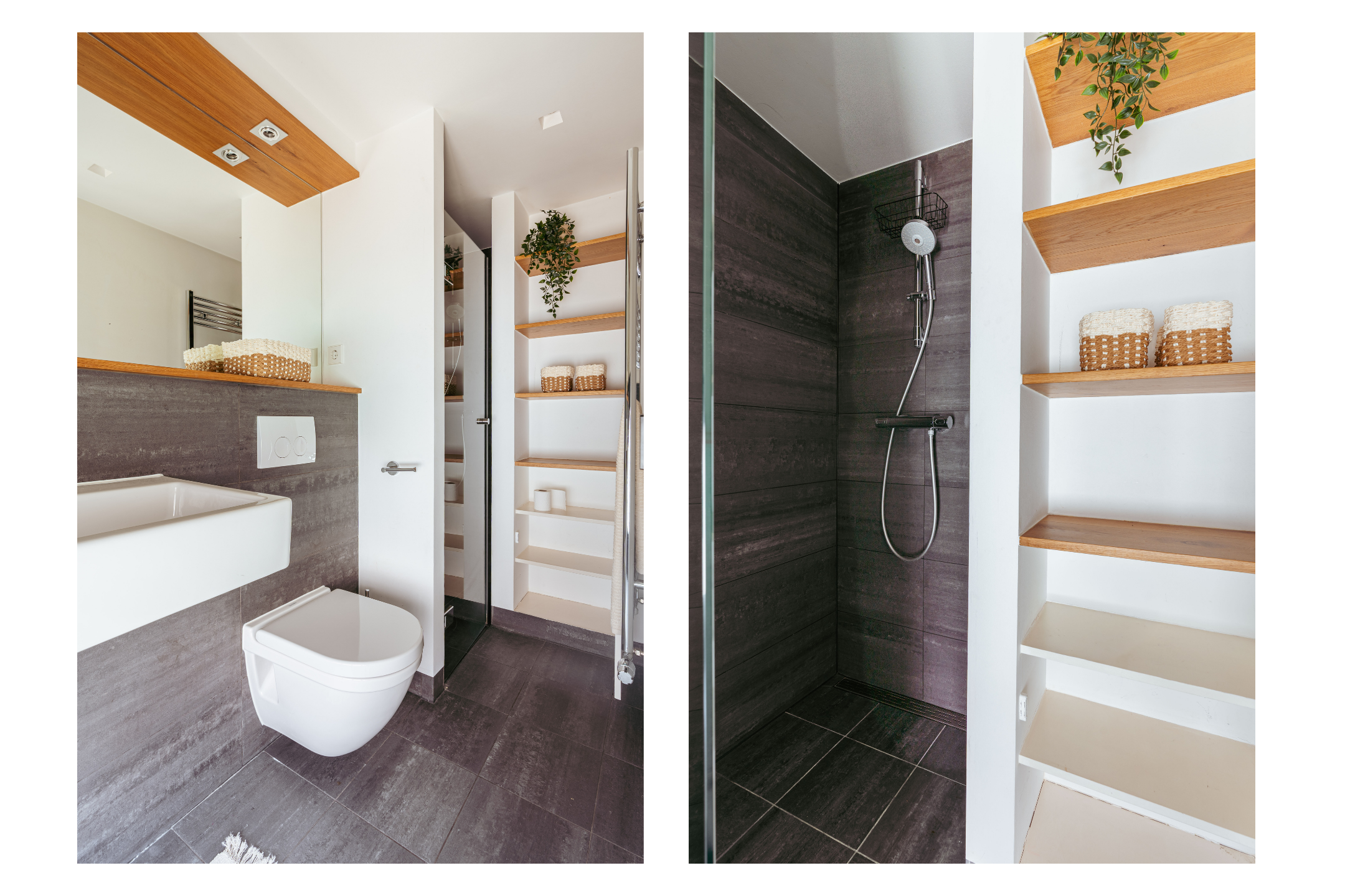 An open staircase in the living room leads to the first floor, which also has its own entrance via the communal staircase. The spacious hallway provides ample space for a coat area and additional storage. Here, you will find the first bathroom, fitted with a walk-in shower, washbasin unit, and a separate WC with a small sink.