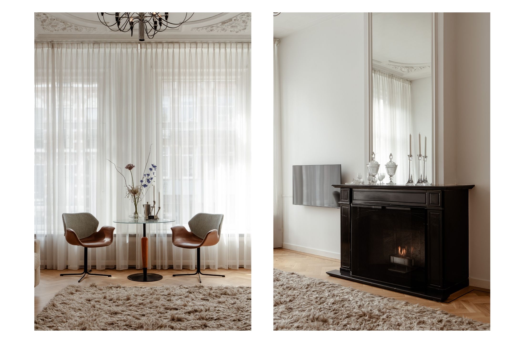 At the front of the property you will find the spacious living room, featuring an attractive (open) fireplace and large windows allowing the space to be filled with natural light. The living room is further characterised by beautiful authentic details, including richly decorated ceiling ornaments and original sliding doors, giving the room an elegant and characterful appearance. Thanks to its generous dimensions, this is an ideal space for a comfortable seating area and generous living space.