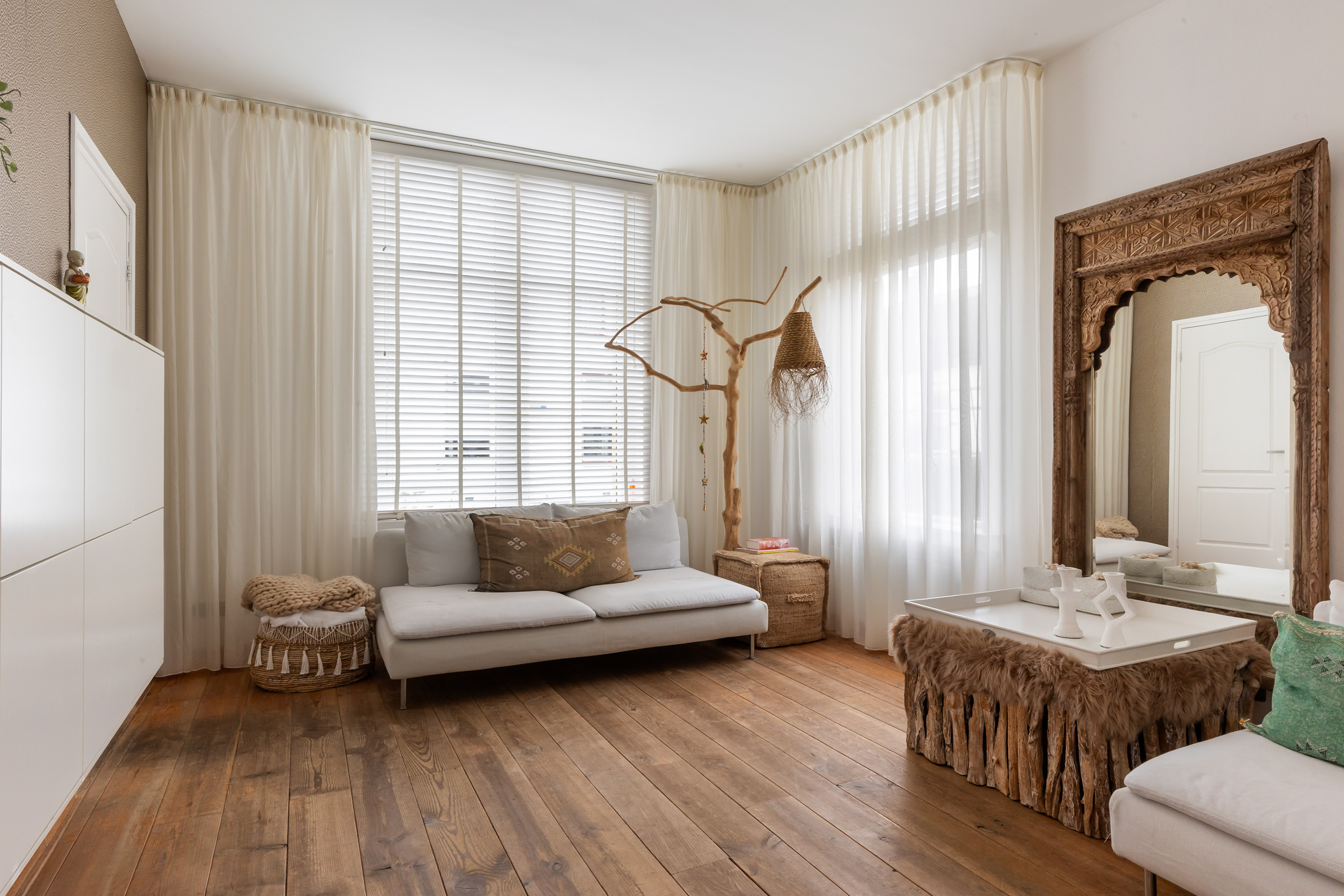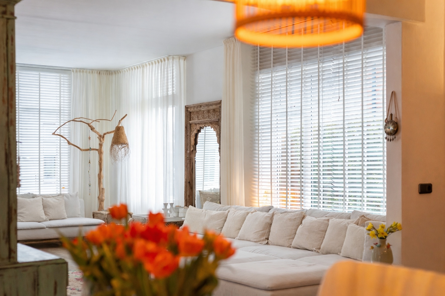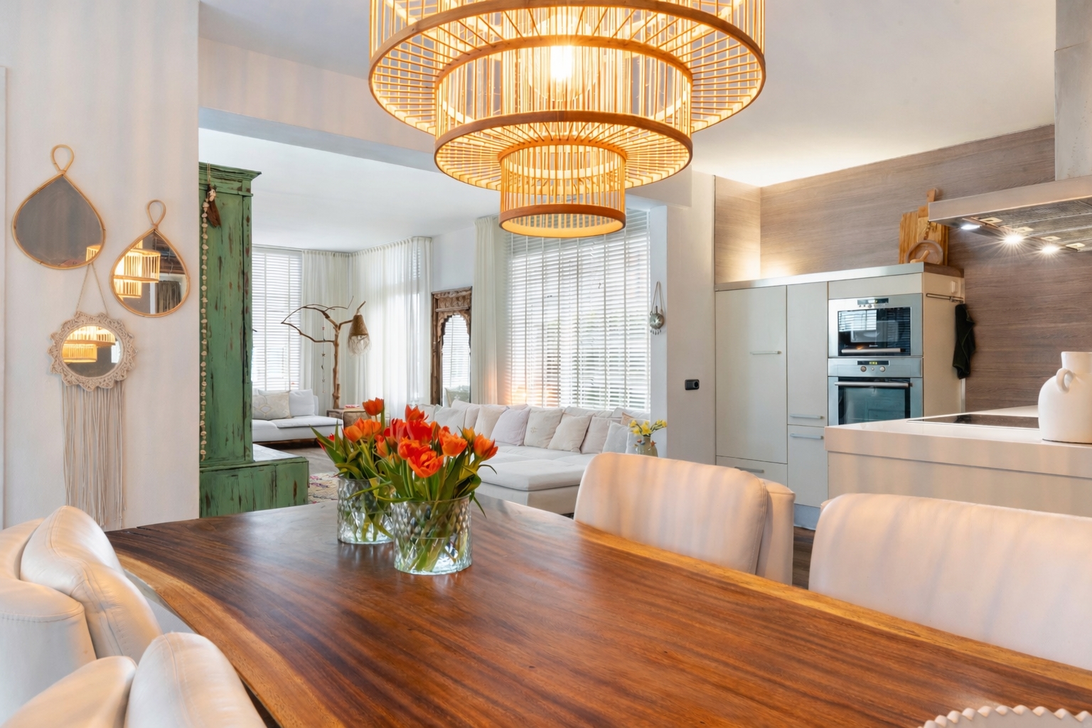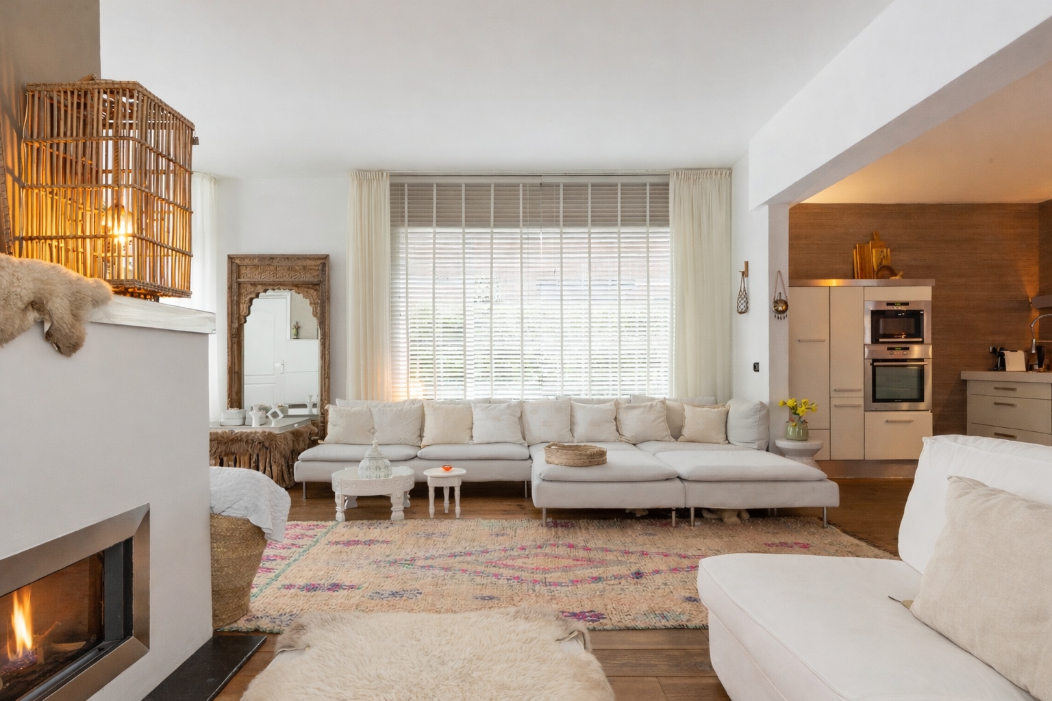 From the front of the property the full extent of the living space is hardly visible. Once inside, the space unfolds impressively, offering several living and sleeping areas, two bathrooms, two garages, two verandas and a sunny, fully private garden with swimming pool. The current finish is contemporary and inspired by a warm South-European Ibiza style. In 2026 the exterior was finished in a warm tone and fitted with characteristic louvre shutters. Combined with the sunny terraces and the pool, this creates a relaxed and almost Mediterranean atmosphere.