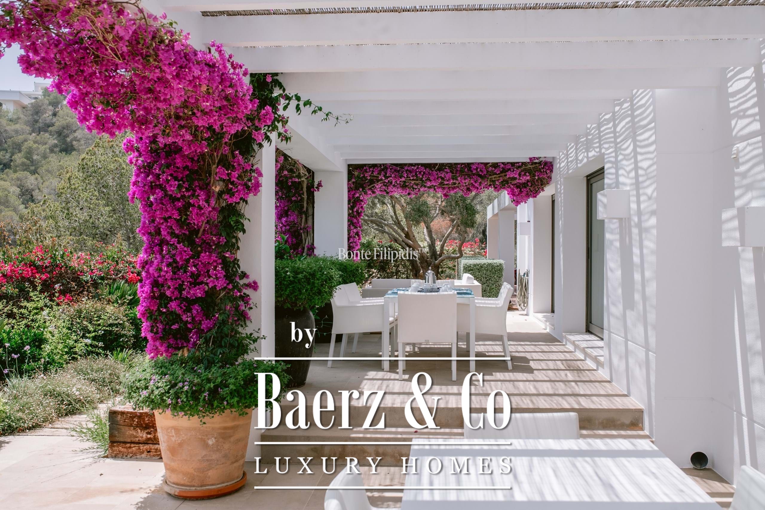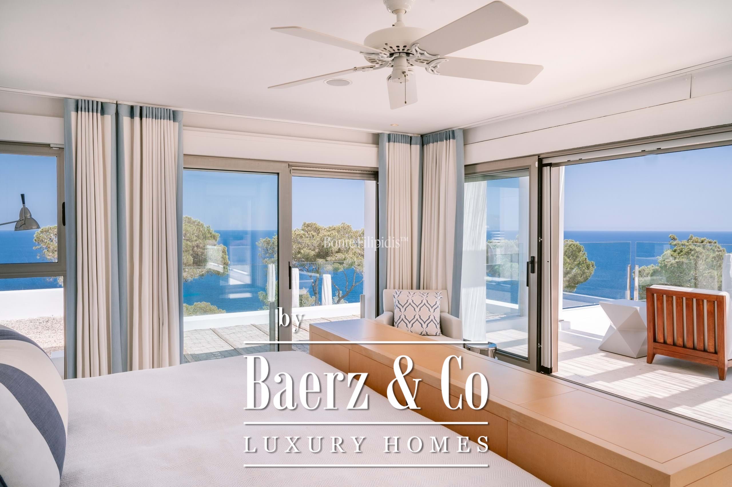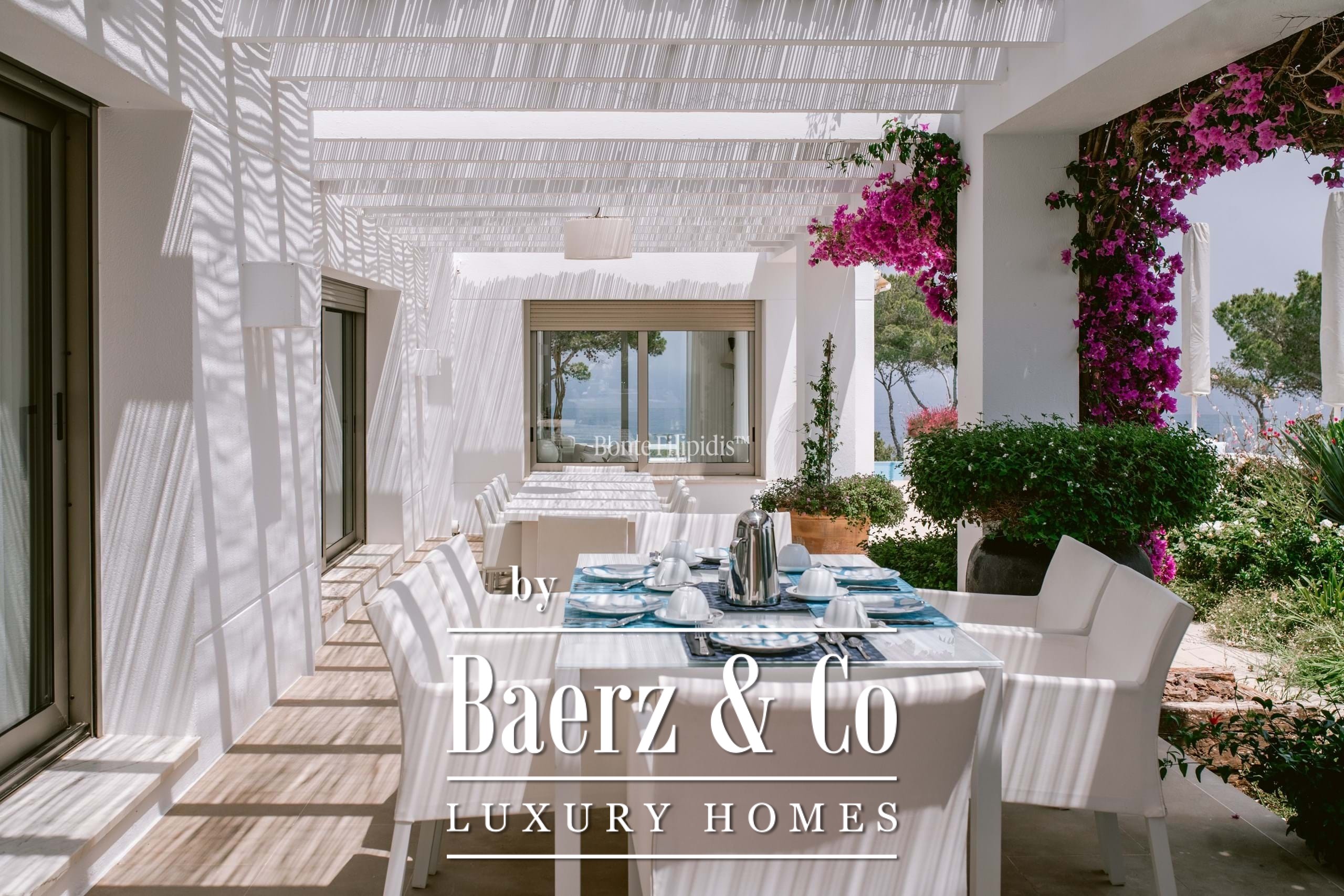 The main house includes a sophisticated primary suite on the upper level with a walk-in wardrobe, a spa-inspired bathroom, and a secluded sea-view terrace. Five guest bedrooms open to the pool deck, providing direct outdoor access and privacy. The independent guest apartment allows for both extended stays and flexible entertaining. Outdoor living is anchored by a saltwater pool, summer kitchen, and broad terraces inviting social and private moments alike.