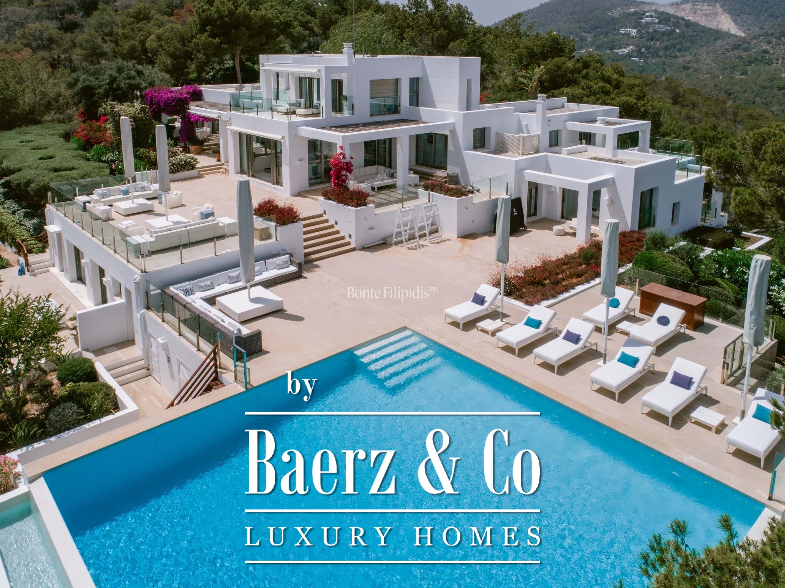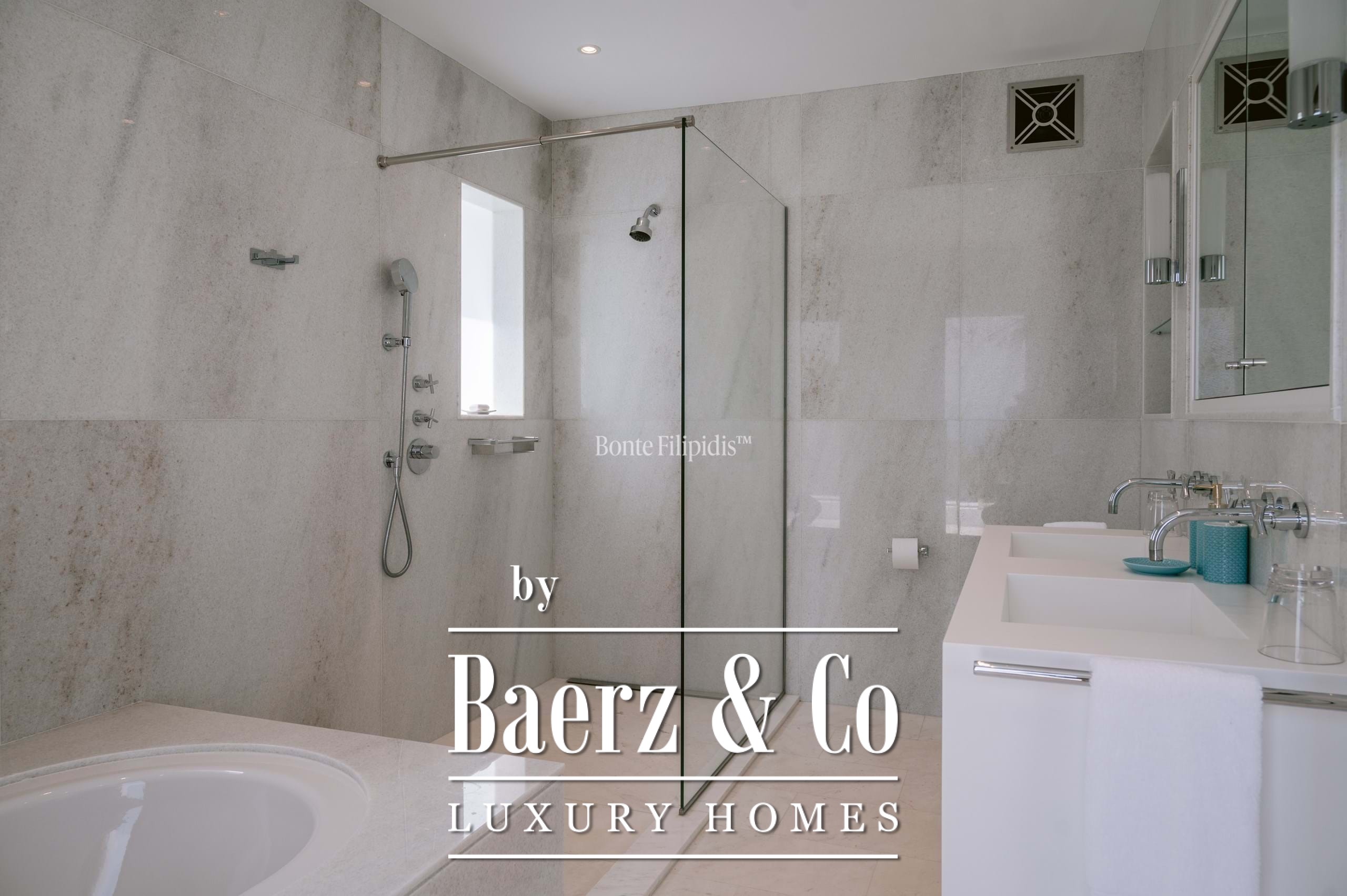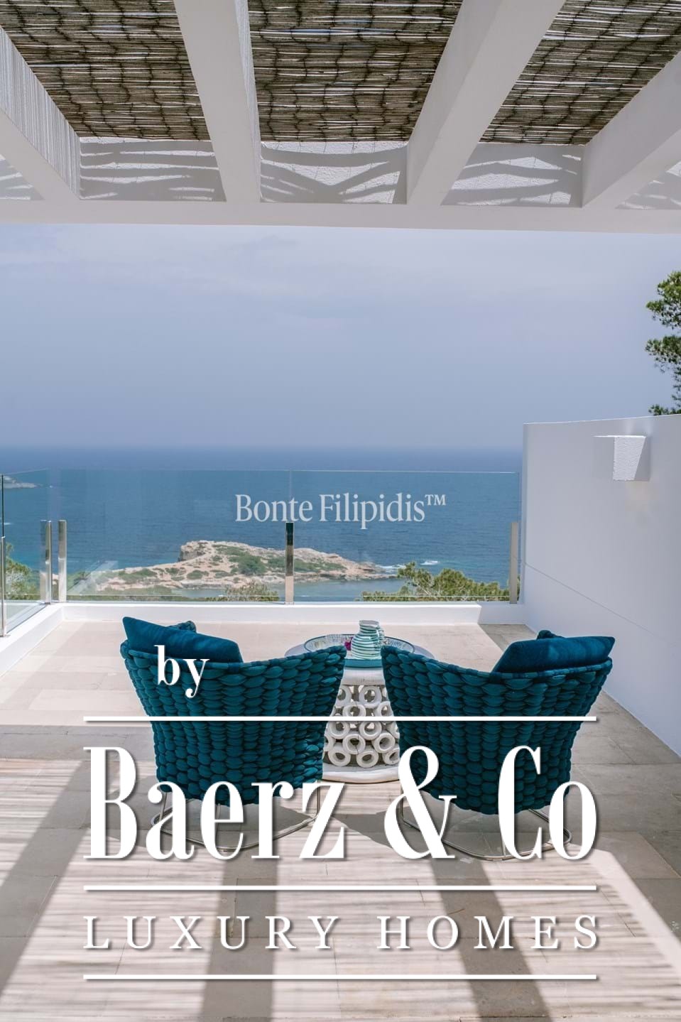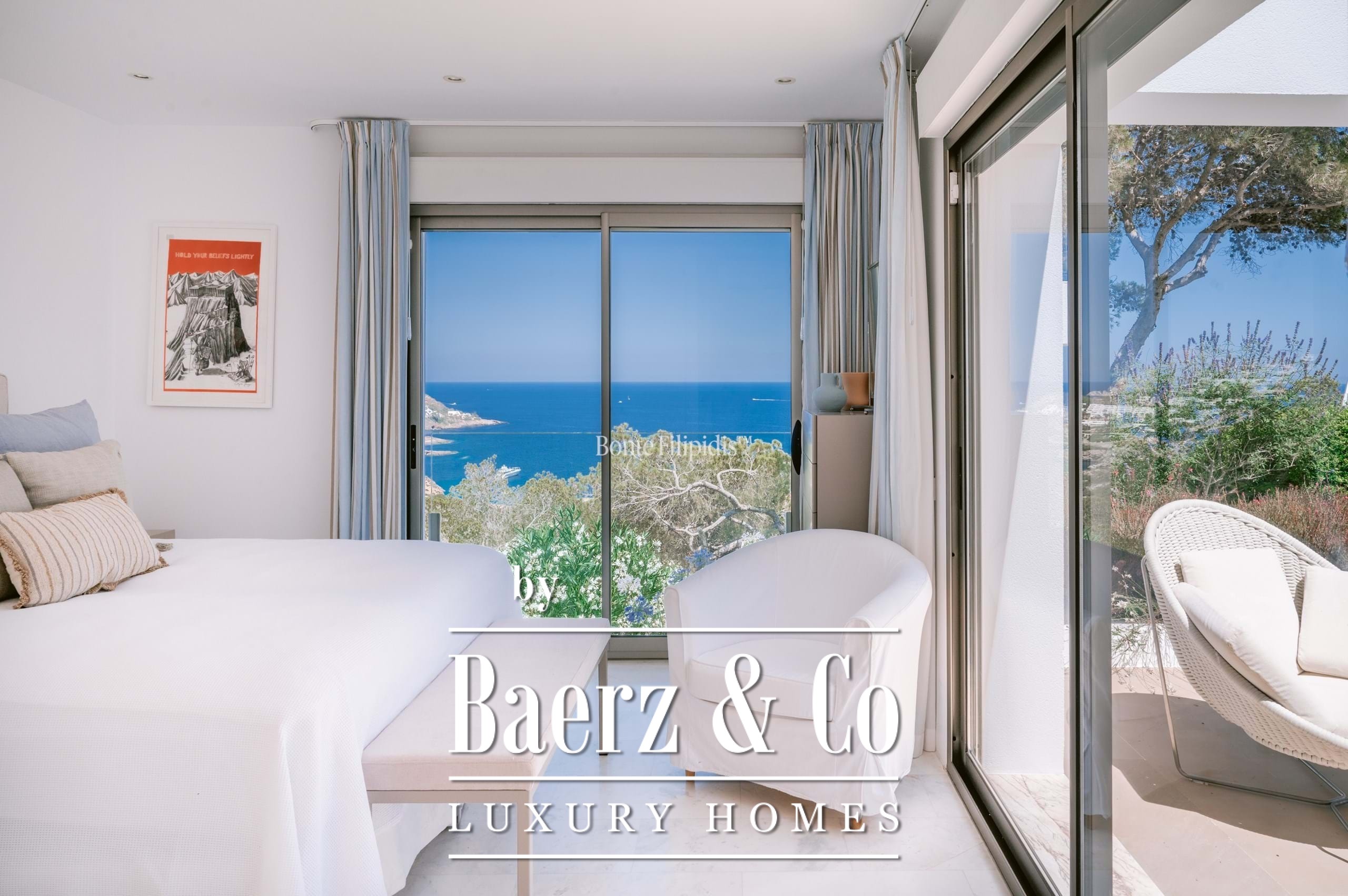 The main house includes a sophisticated primary suite on the upper level with a walk-in wardrobe, a spa-inspired bathroom, and a secluded sea-view terrace. Five guest bedrooms open to the pool deck, providing direct outdoor access and privacy. The independent guest apartment allows for both extended stays and flexible entertaining. Outdoor living is anchored by a saltwater pool, summer kitchen, and broad terraces inviting social and private moments alike.