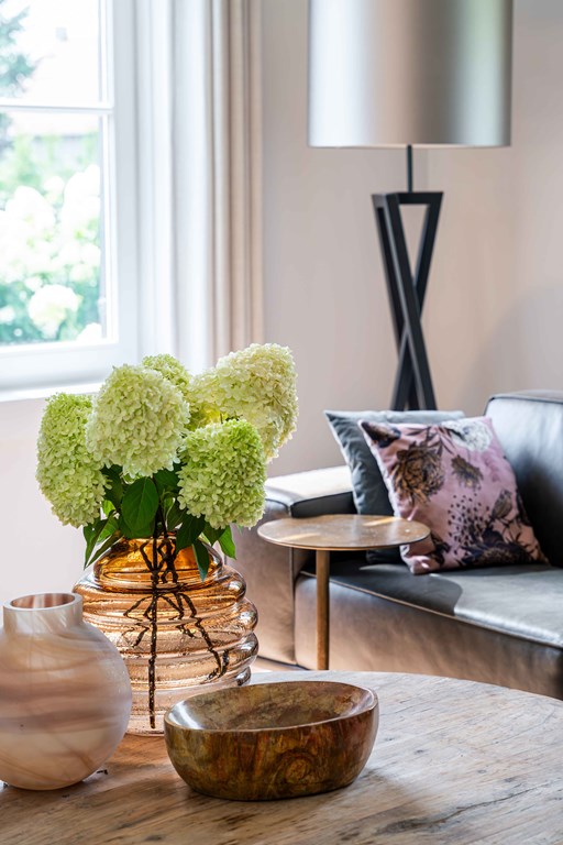 Through the neatly landscaped front garden, you reach the stately entrance of the home. Upon entering, it is immediately clear that careful thought has been given to the sightlines in and around the property. The hallway features a meter cupboard, a guest toilet, a cloakroom, a staircase to the upper floor, and provides access to the living areas.