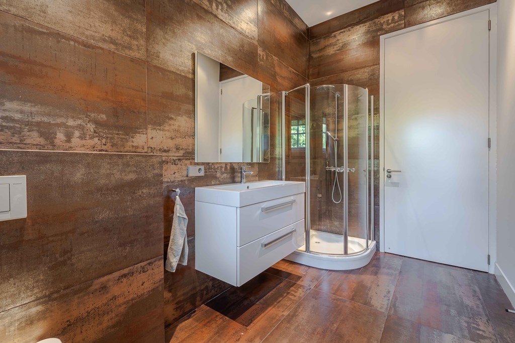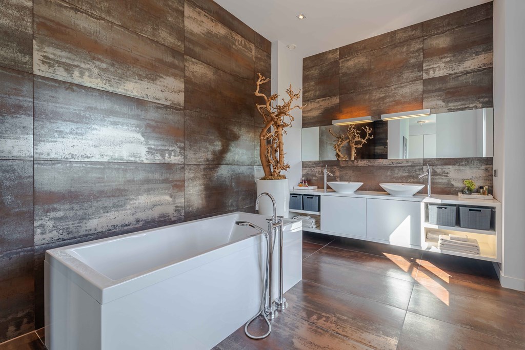 Bedroom 1, located at the front of the house, serves as the master suite. Overlooking the garden, it offers a true oasis of calm. This suite includes a walk-in closet and a complete bathroom with a walk-in shower, freestanding bathtub, and double washbasins with vanity.