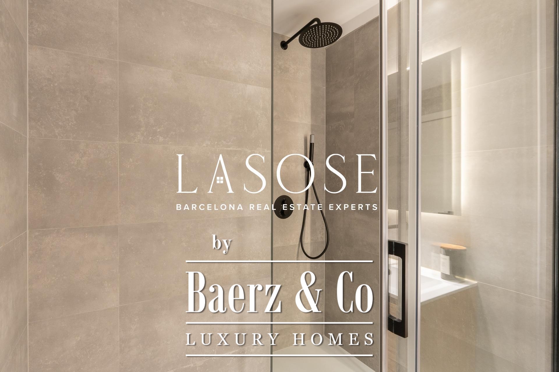 Three bedrooms, including a master suite with private bathroom and separate dressing room, are complemented by fitted wardrobes and custom carpentry. Comfort is assured through aerothermal air conditioning and double-glazed wooden windows. Residents benefit from the convenience of an elevator, concierge service, video intercom, and secure armored door. The long-tail variation luxury apartment for sale in Barcelona is well-suited for those who value discretion and design.