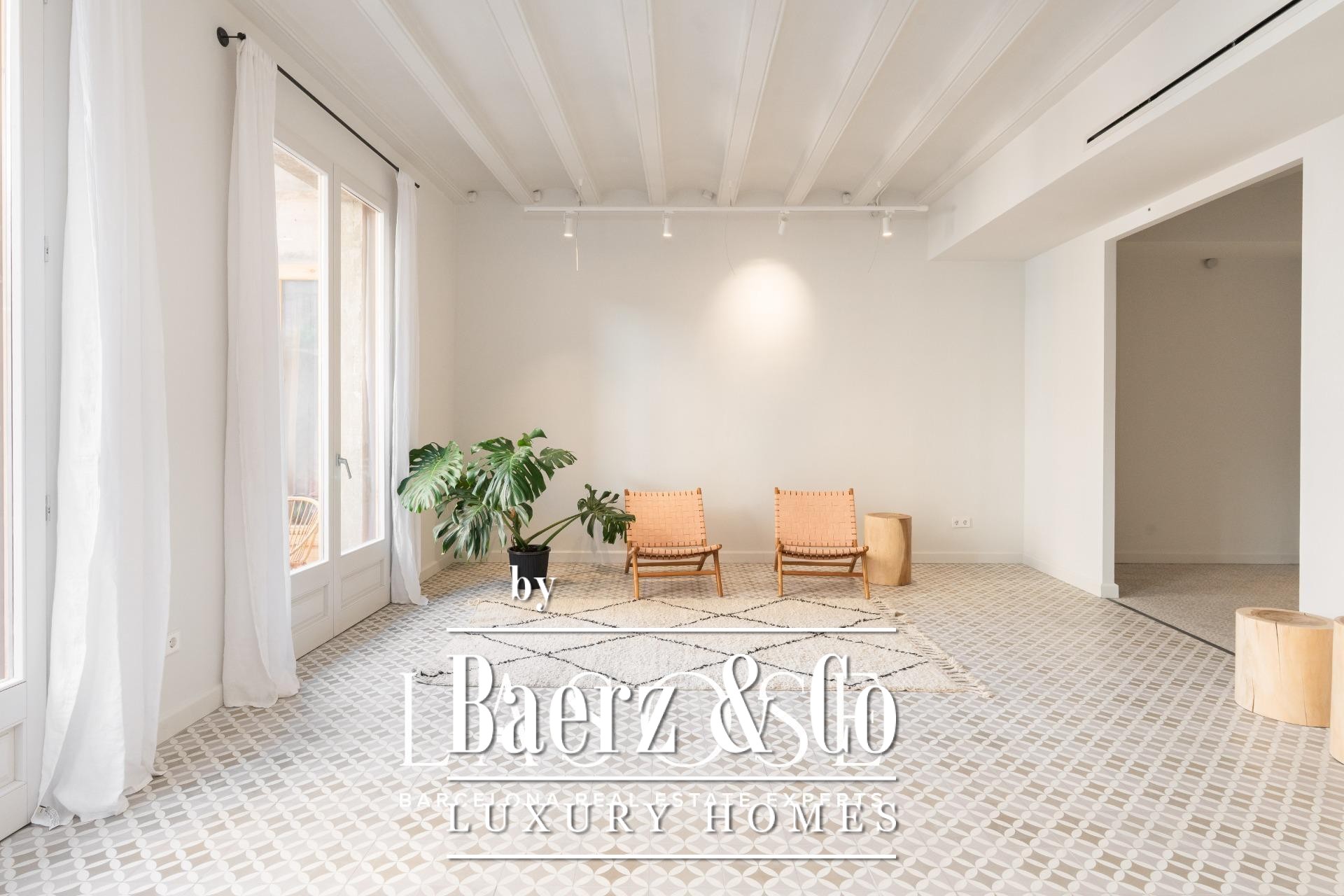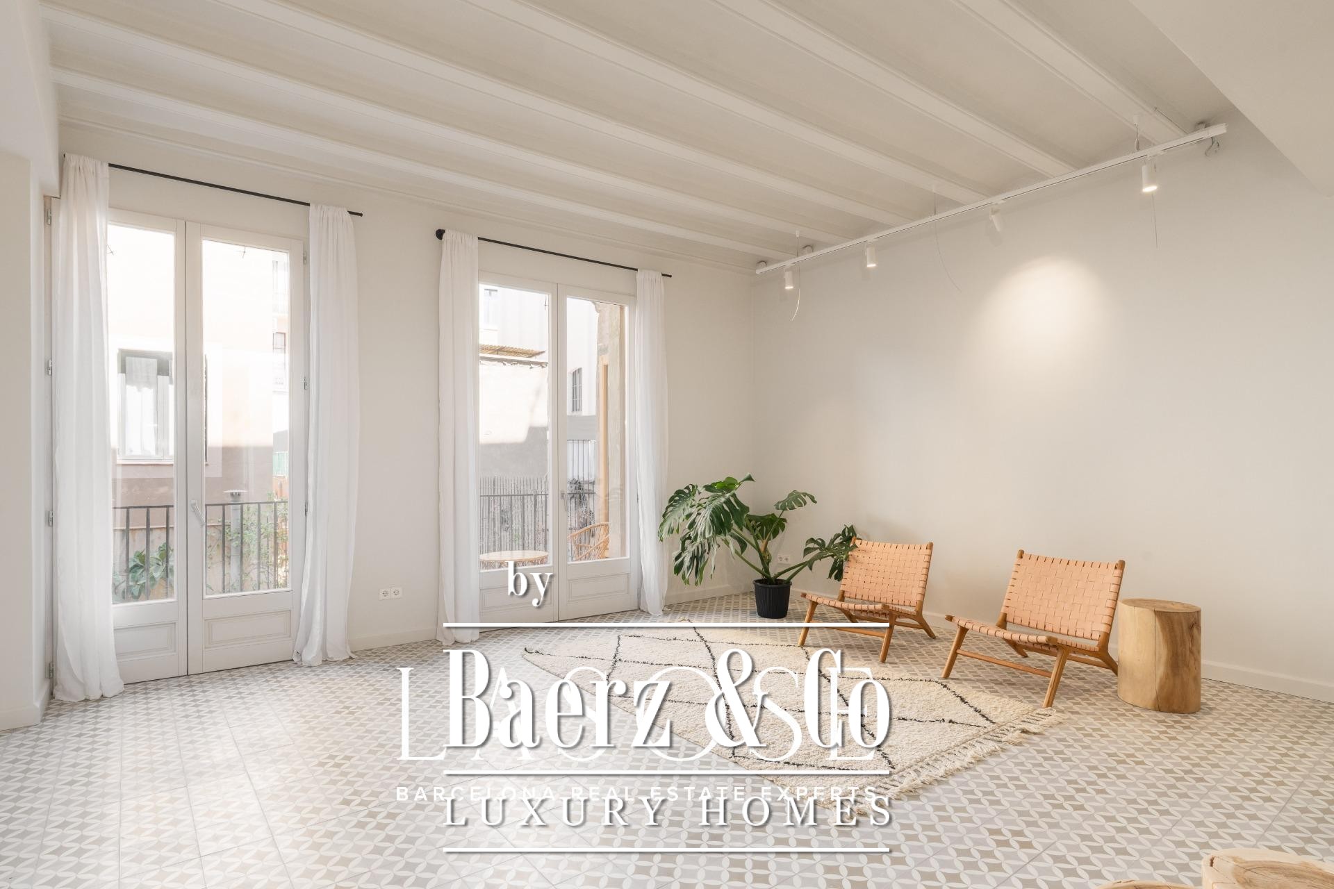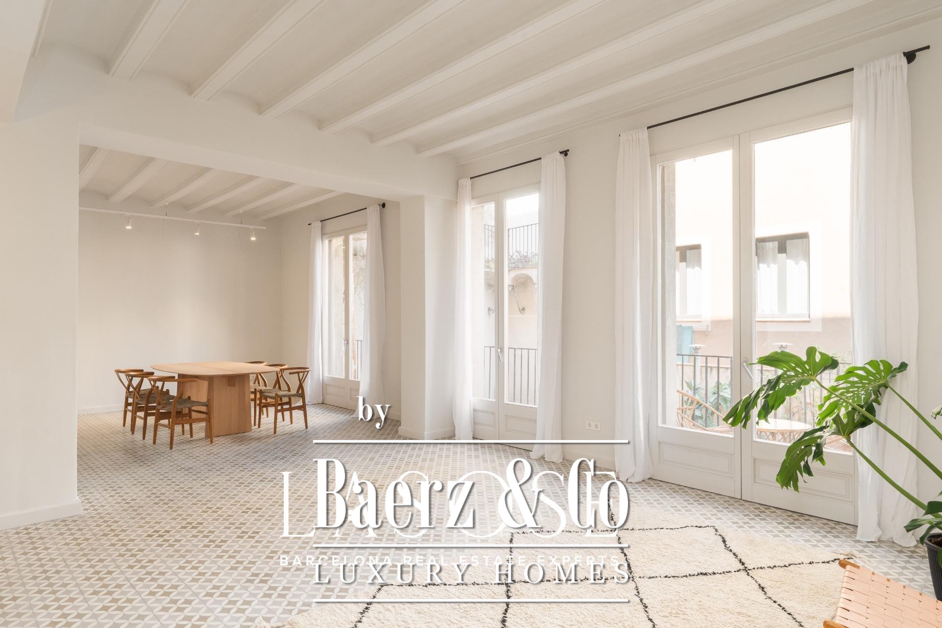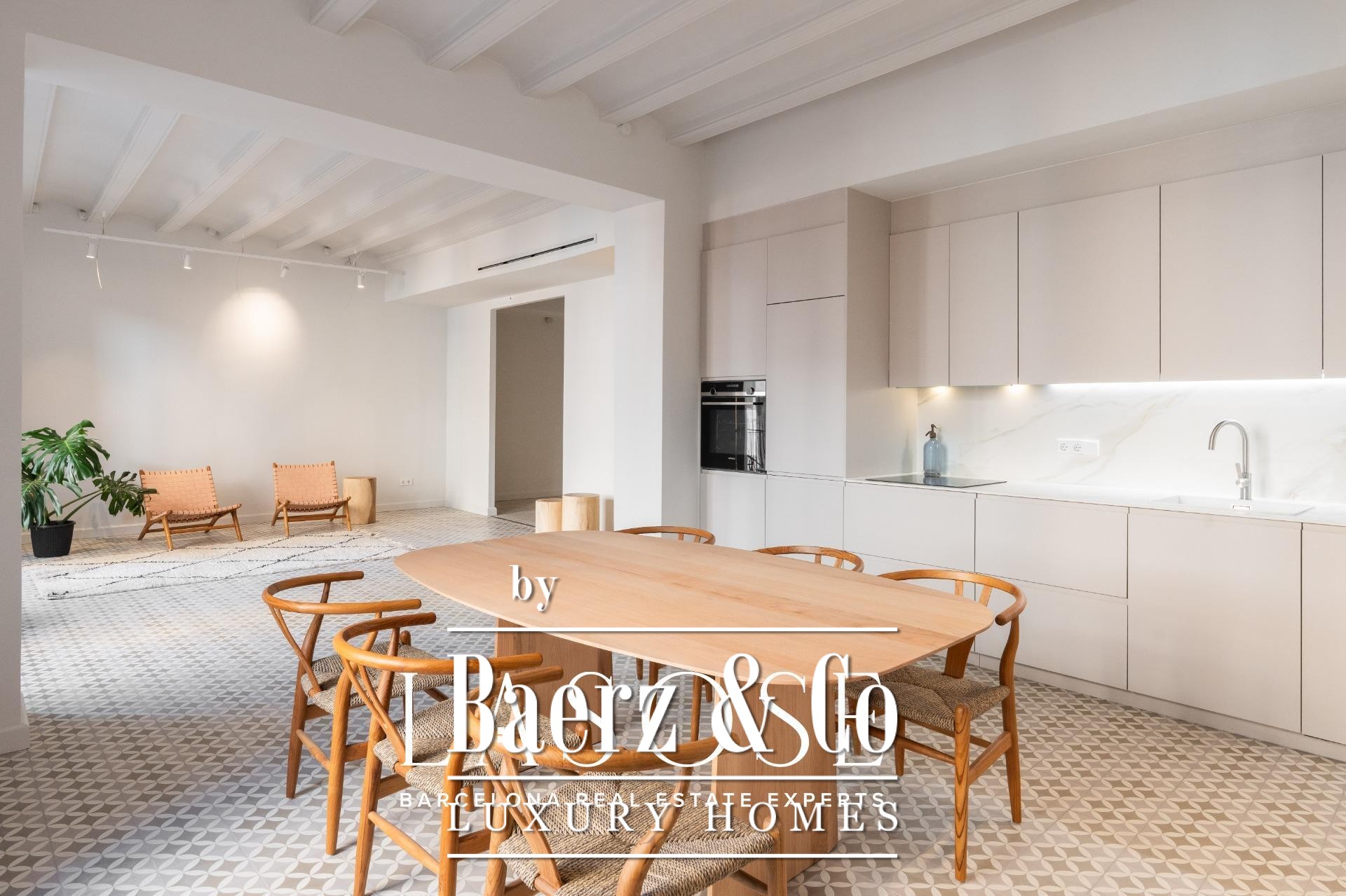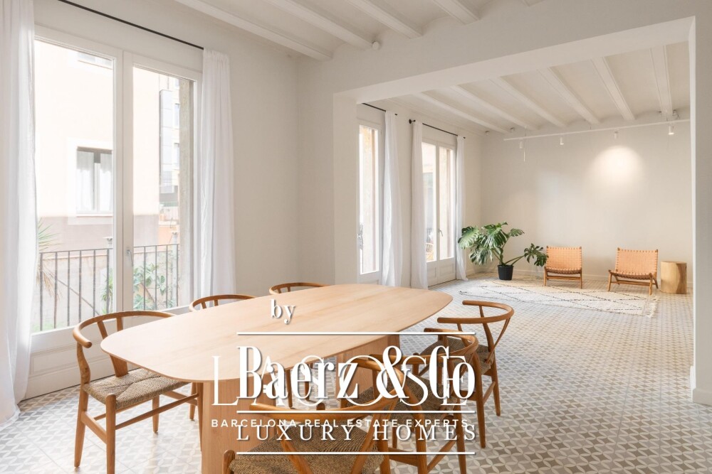 Apartment El Born Barcelona brings modern refinement into one of the city’s most historic districts. Positioned in the northern part of El Born, near Eixample Dret, this 133 m² apartment merges contemporary comfort with the enduring character of Barcelona’s iconic quarter. A considered renovation reveals exposed wooden beams, original details, and premium finishes, creating an atmosphere of understated authenticity.