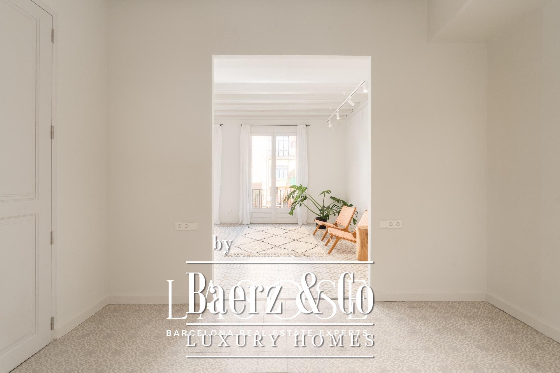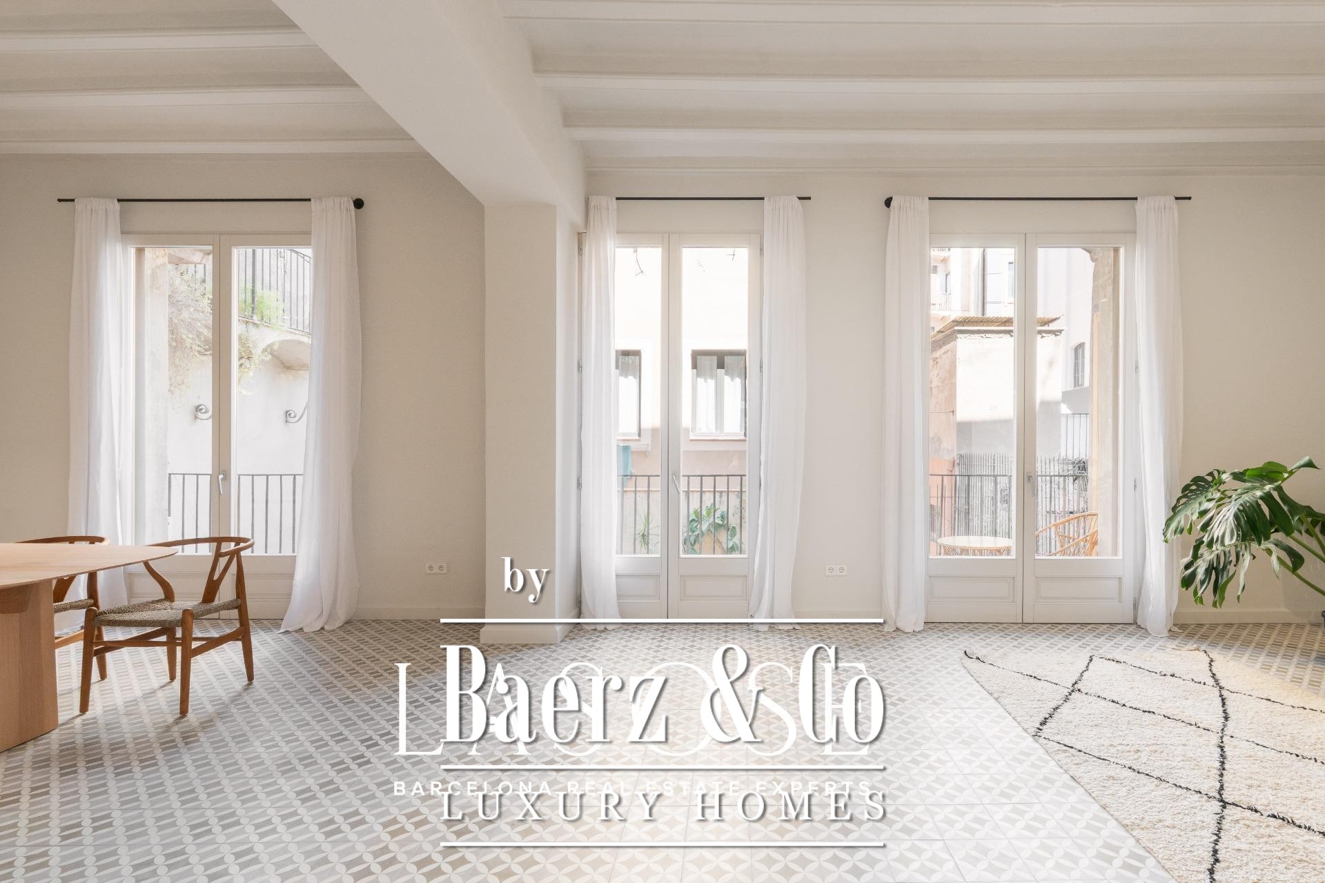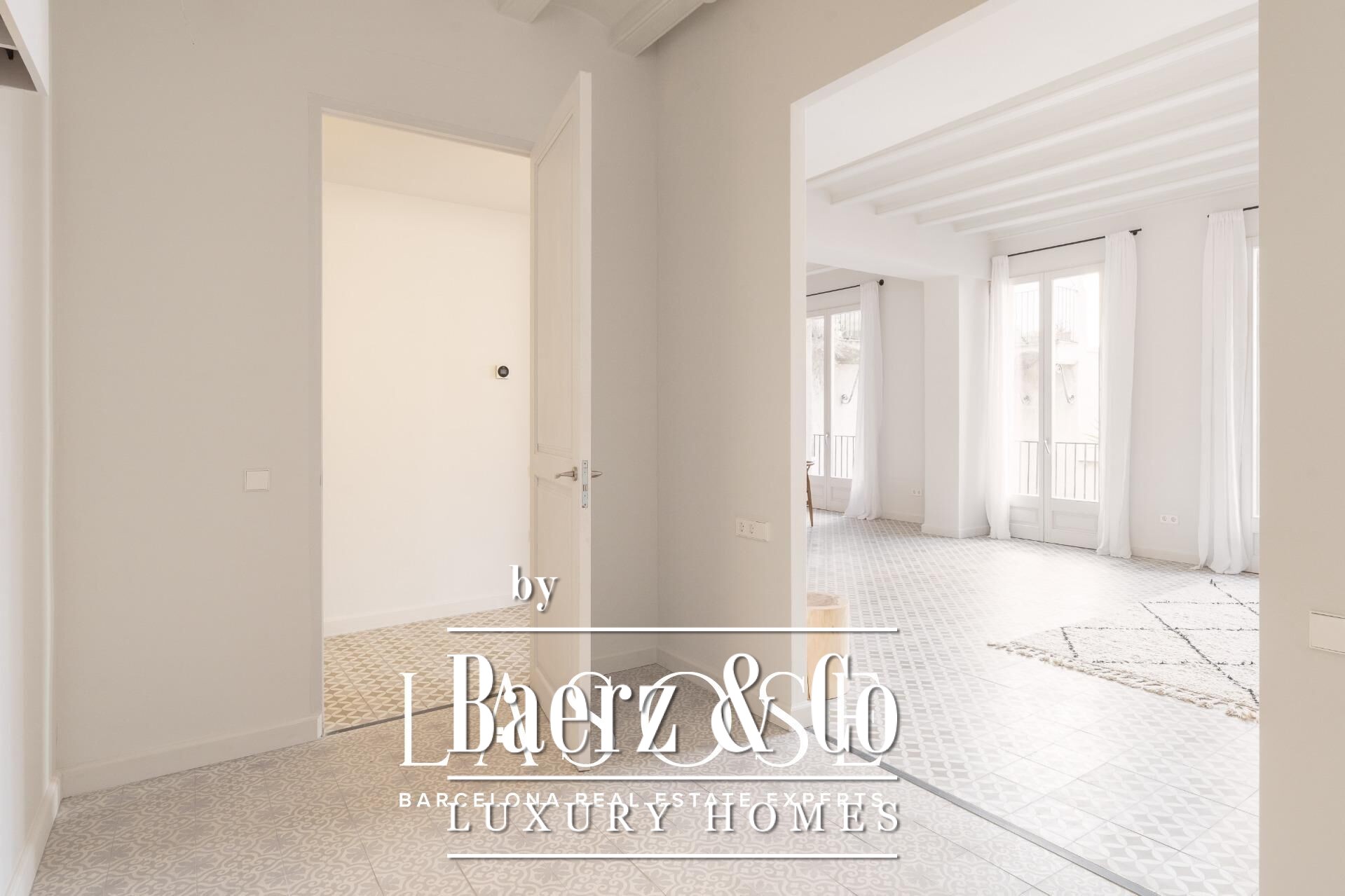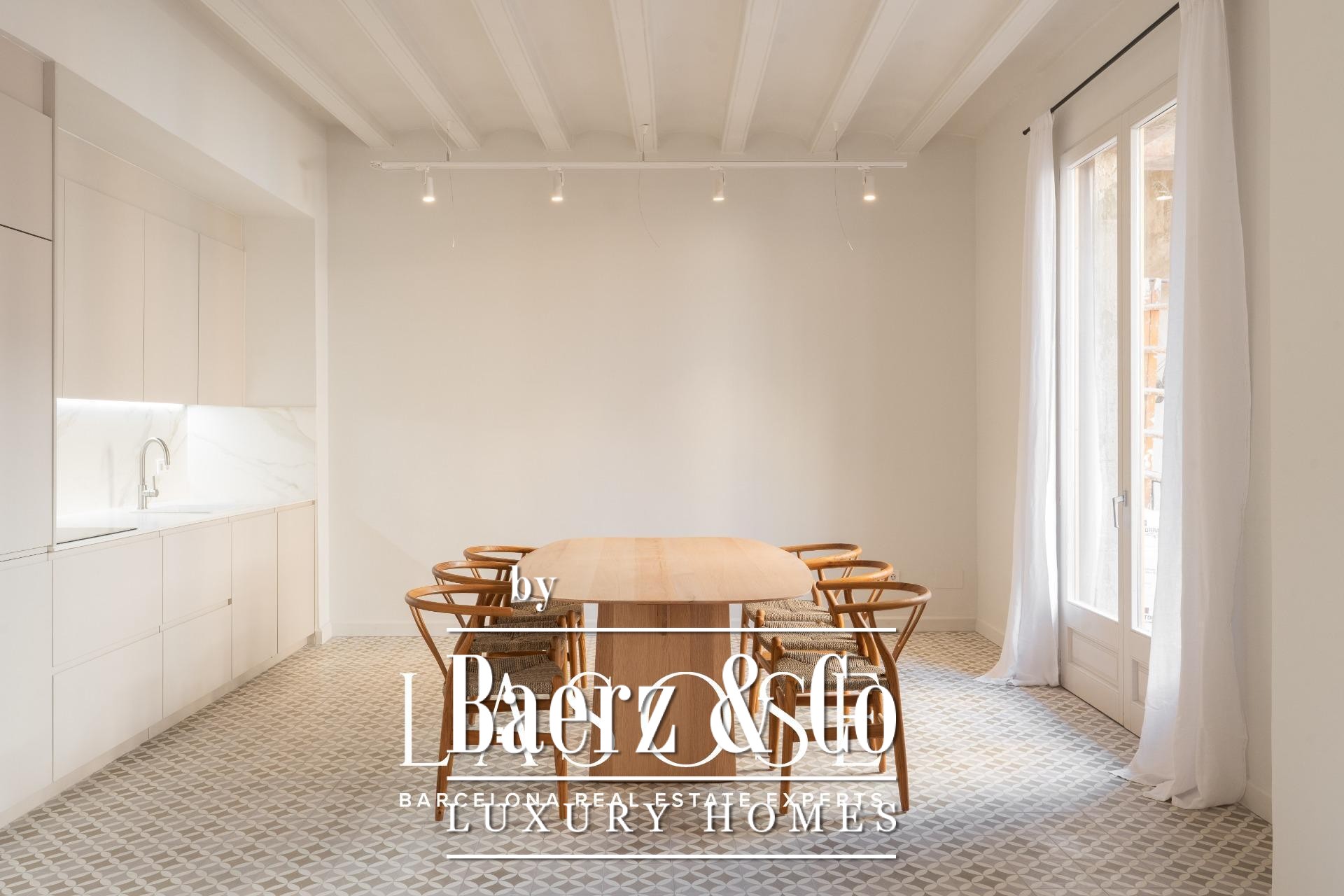 Apartment El Born Barcelona brings modern refinement into one of the city’s most historic districts. Positioned in the northern part of El Born, near Eixample Dret, this 133 m² apartment merges contemporary comfort with the enduring character of Barcelona’s iconic quarter. A considered renovation reveals exposed wooden beams, original details, and premium finishes, creating an atmosphere of understated authenticity.