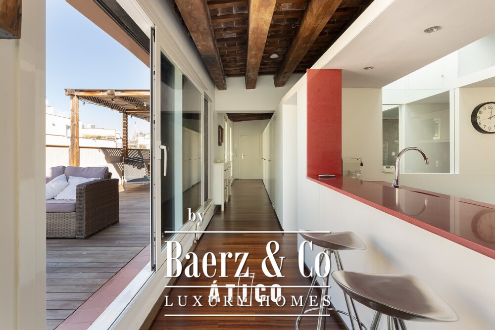 Next to Palau Guell, we have this furnished penthouse with a spectacular 80 m terrace, offering unique views and all the necessary furniture to enjoy and relax, having breakfast, and perfect for summer dinners.